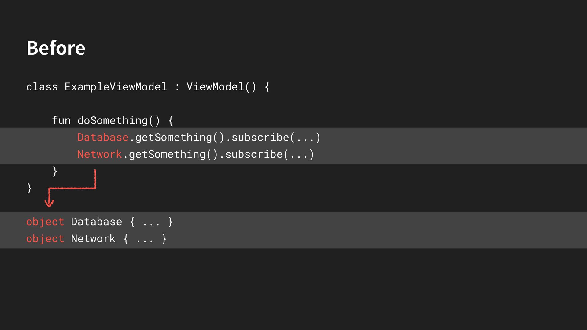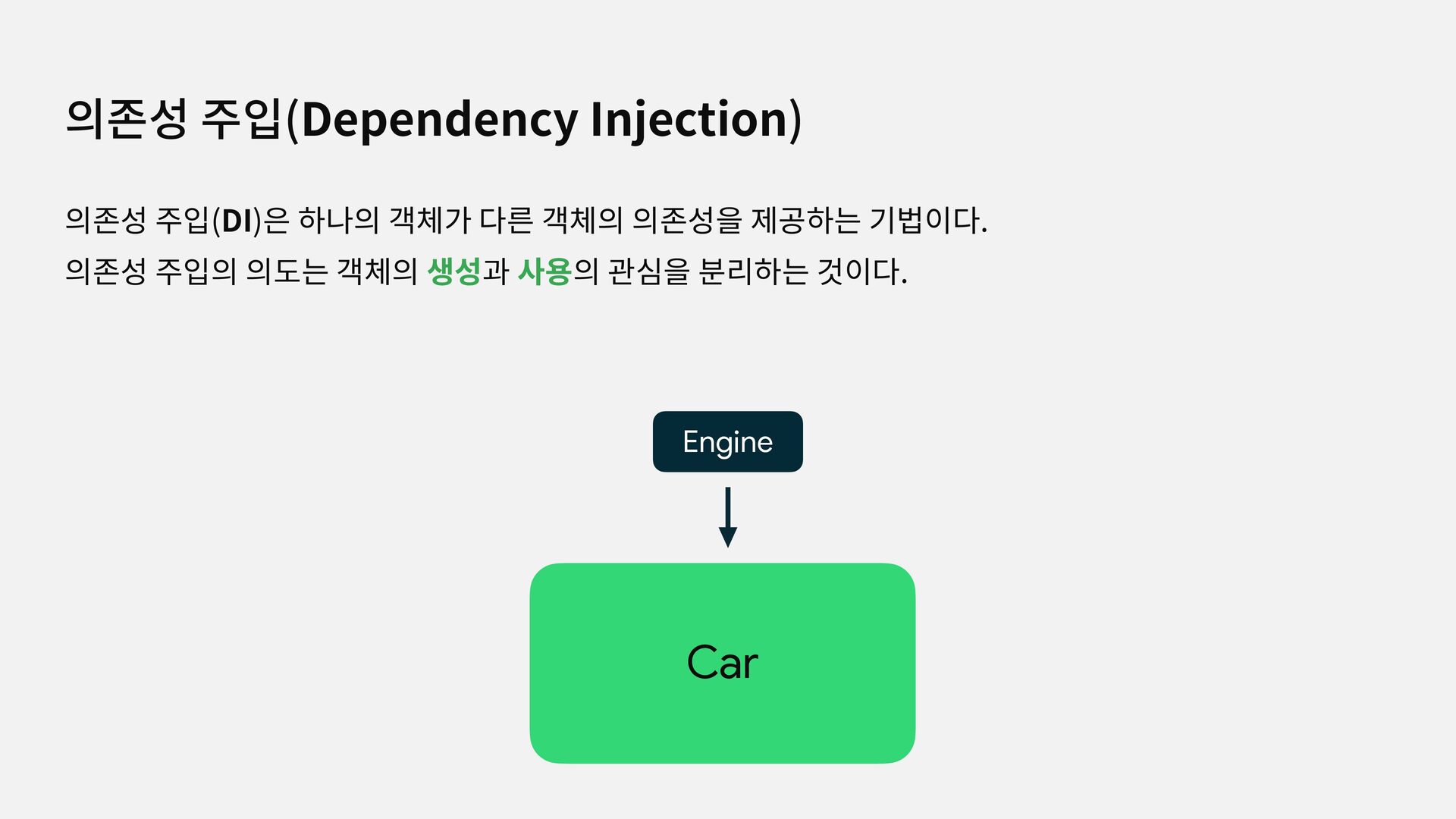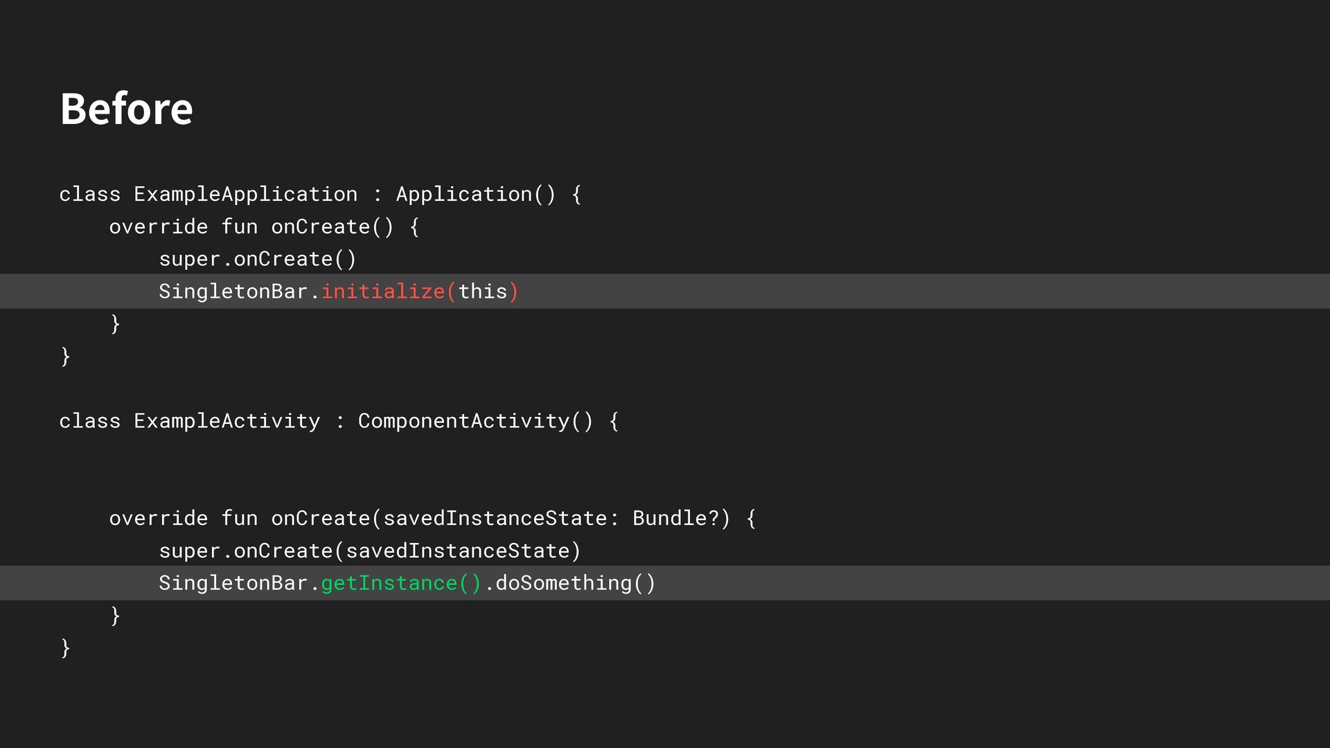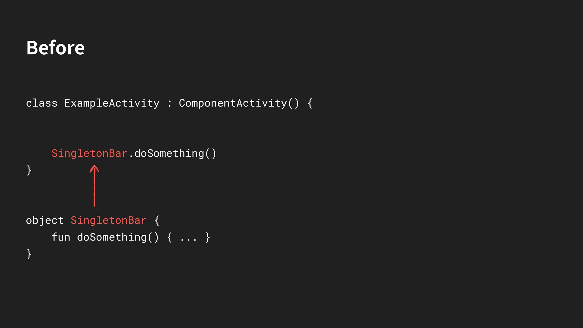 start() { engine.start() } } fun main(args: Array) { val car = Car() car.engine = Engine() // construct car.start() } With DI (Field Injection) Car Engine