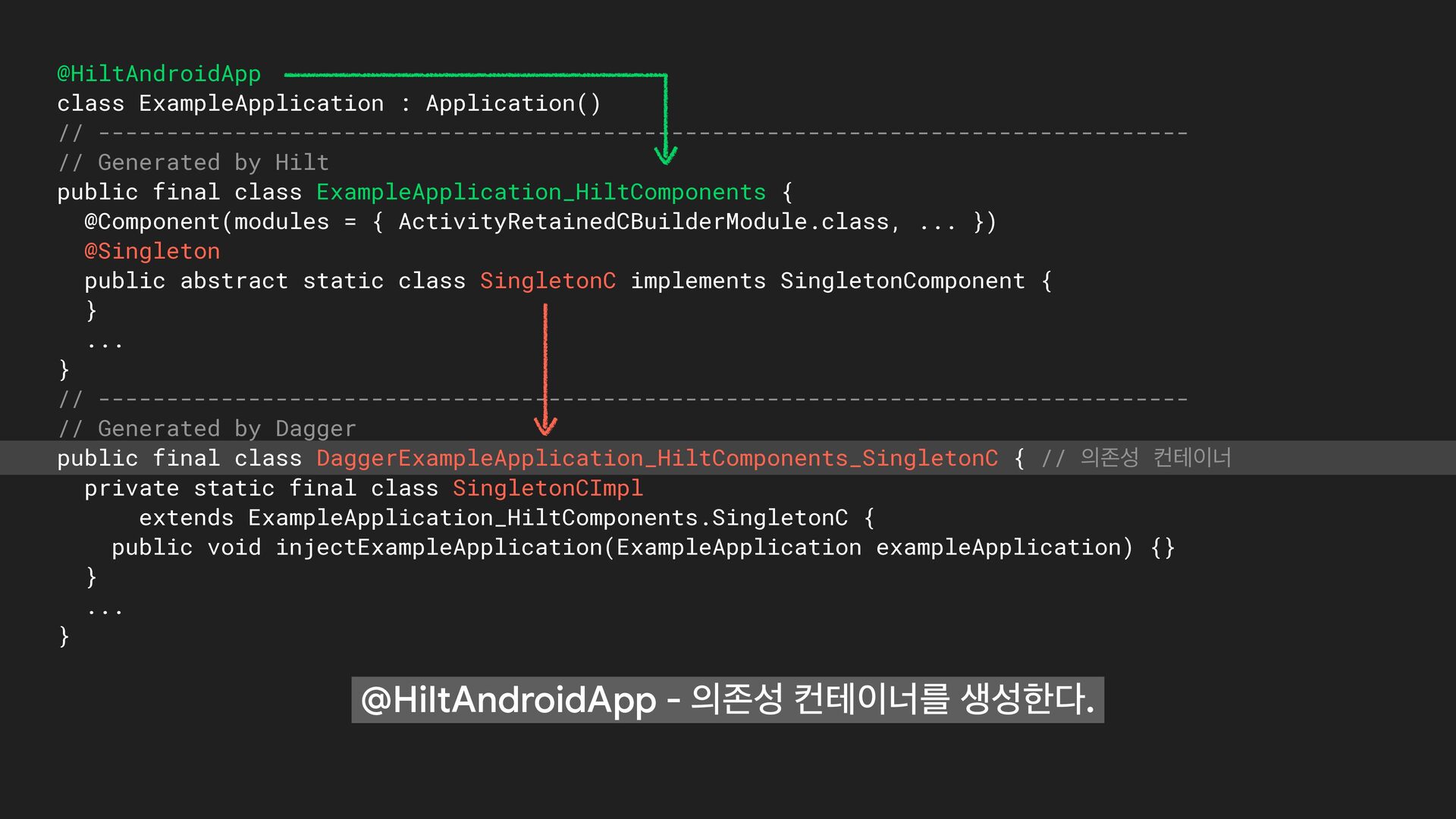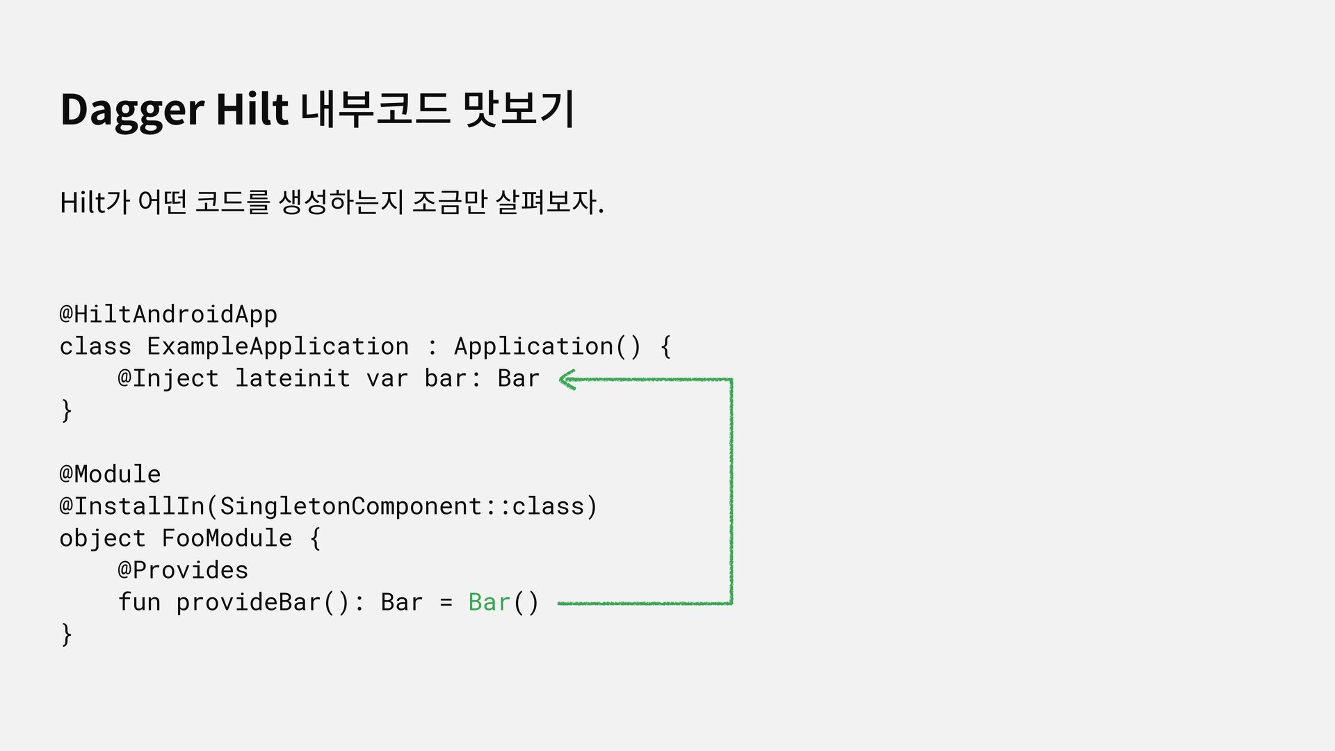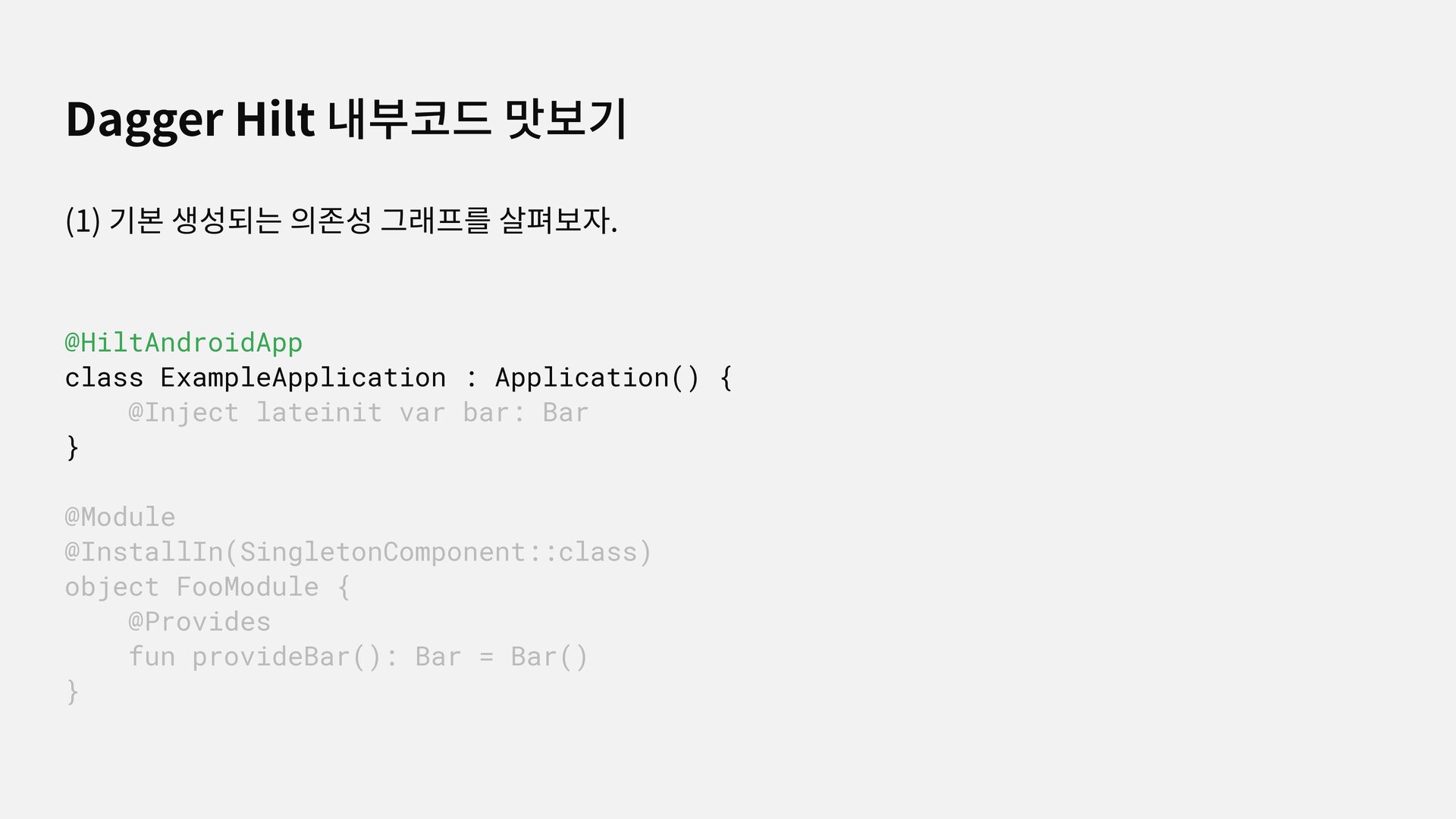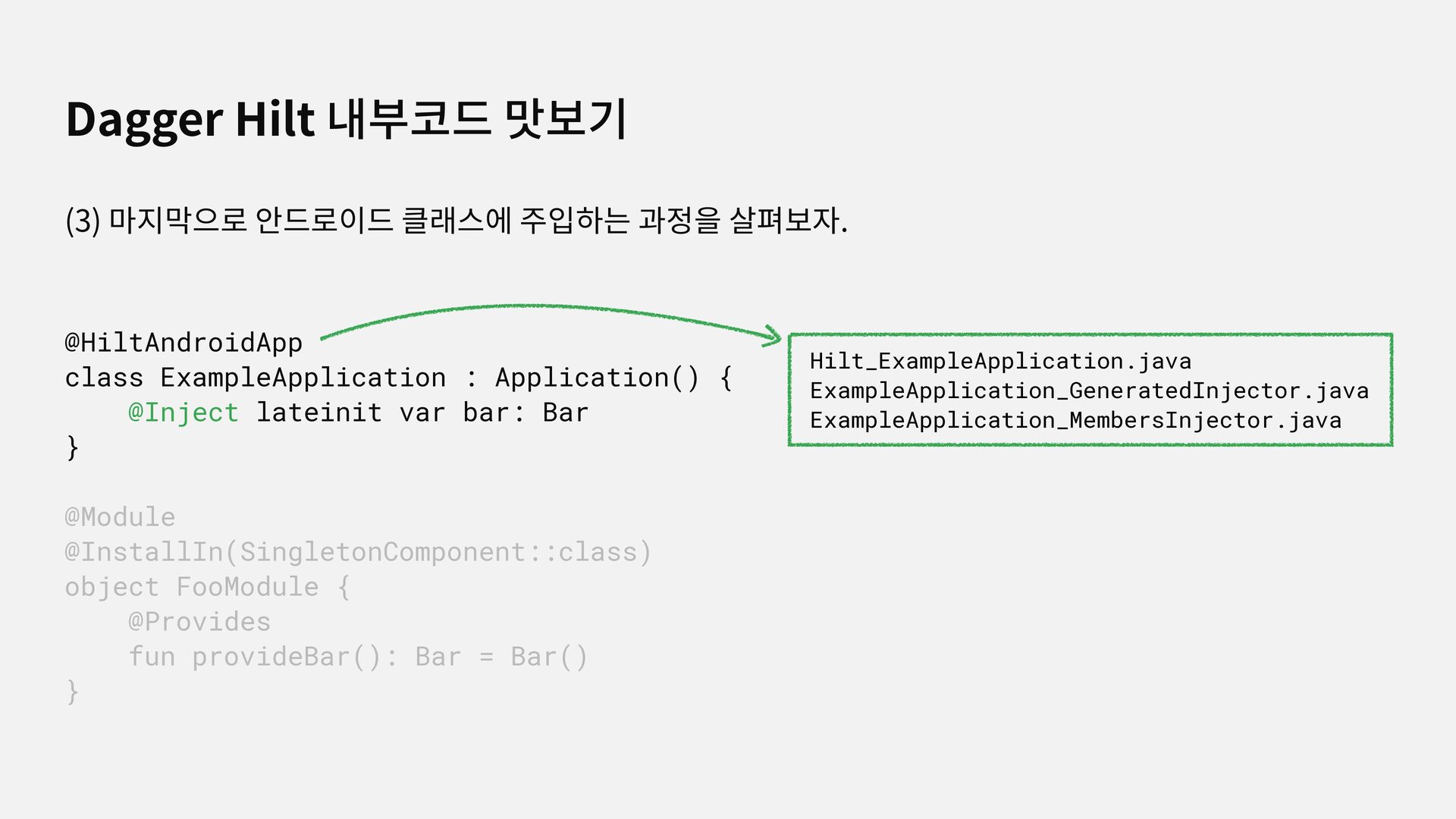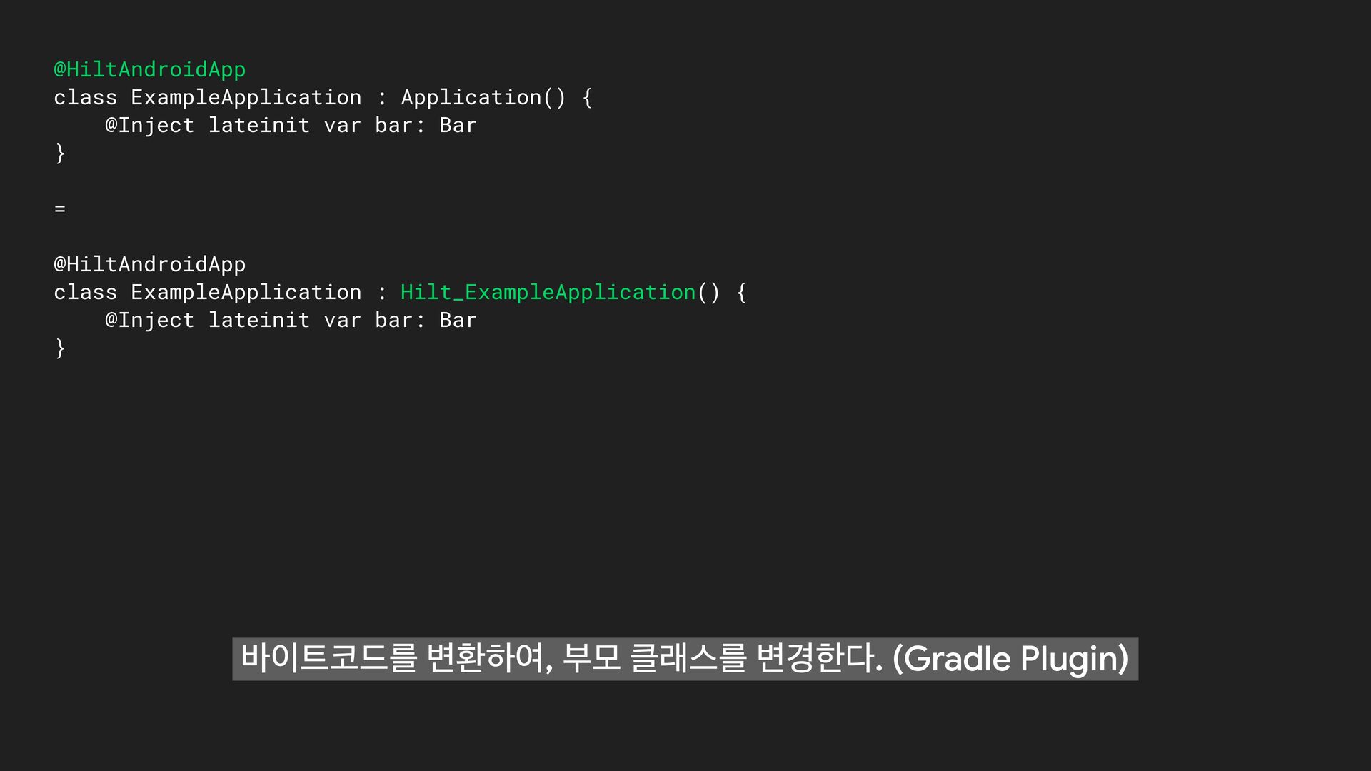Bar } = @HiltAndroidApp class ExampleApplication : Hilt_ExampleApplication() { @Inject lateinit var bar: Bar } ߄٘ܳ ߸ജೞৈ, ࠗݽ ېझܳ ߸҃ೠ. (Gradle Plugin)