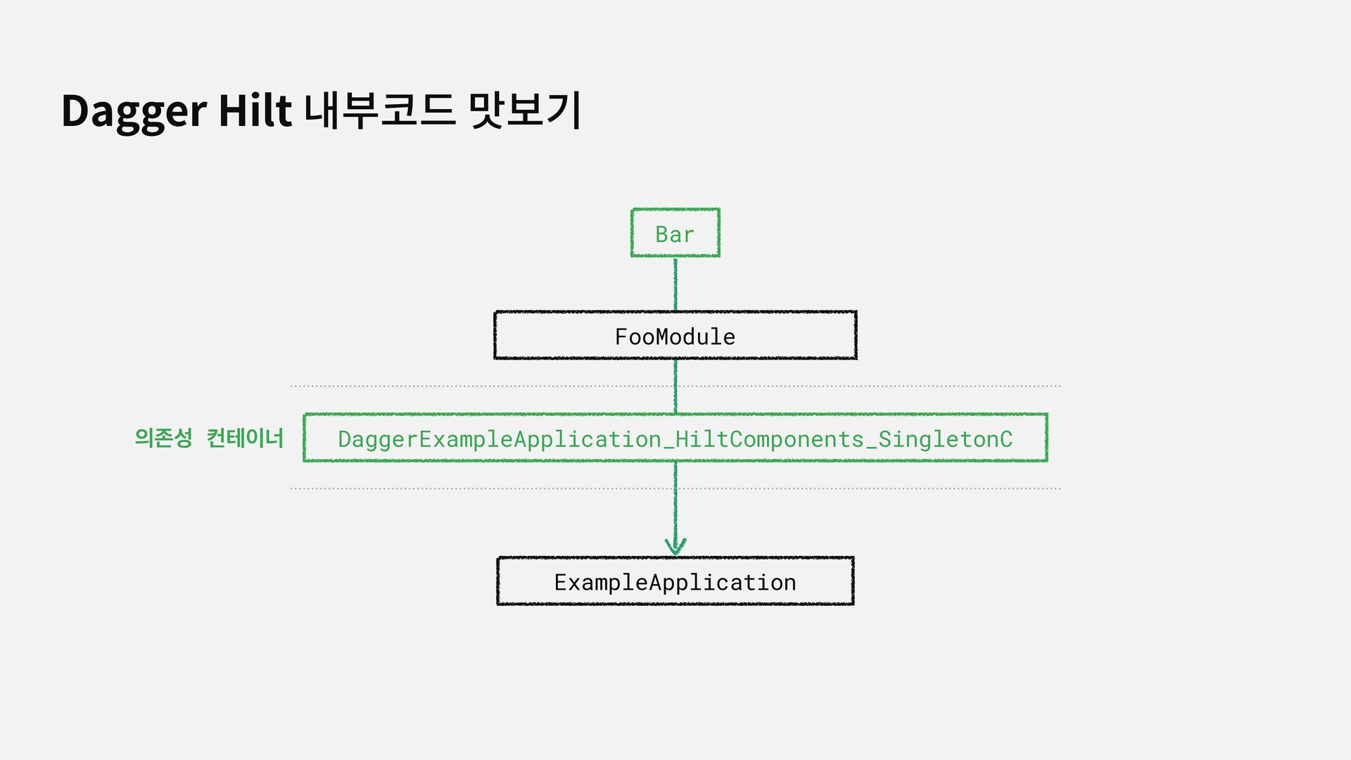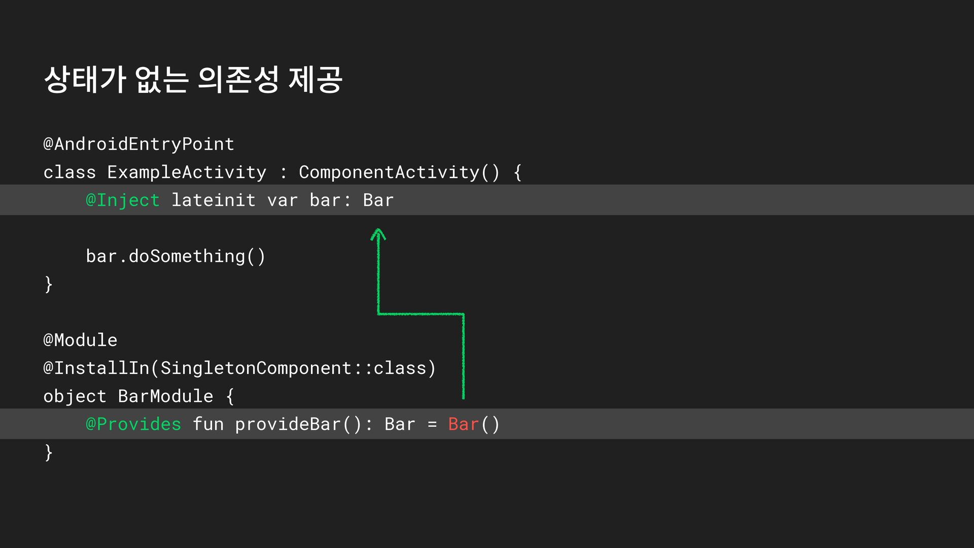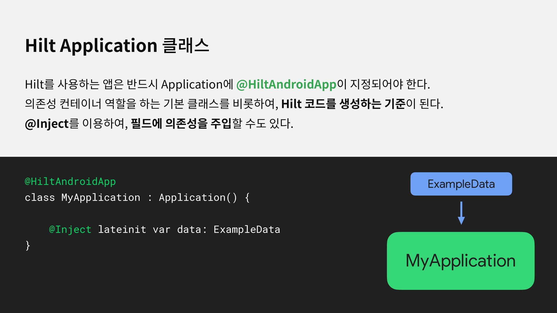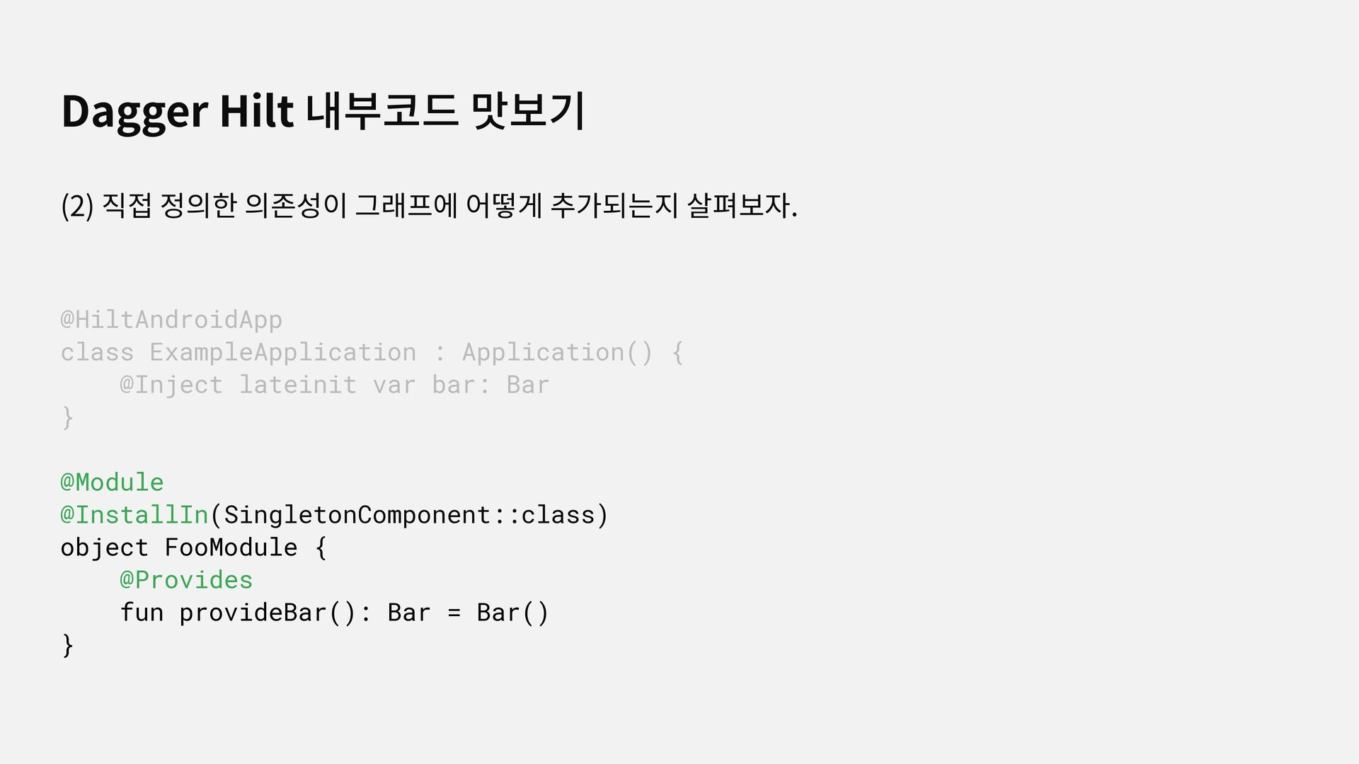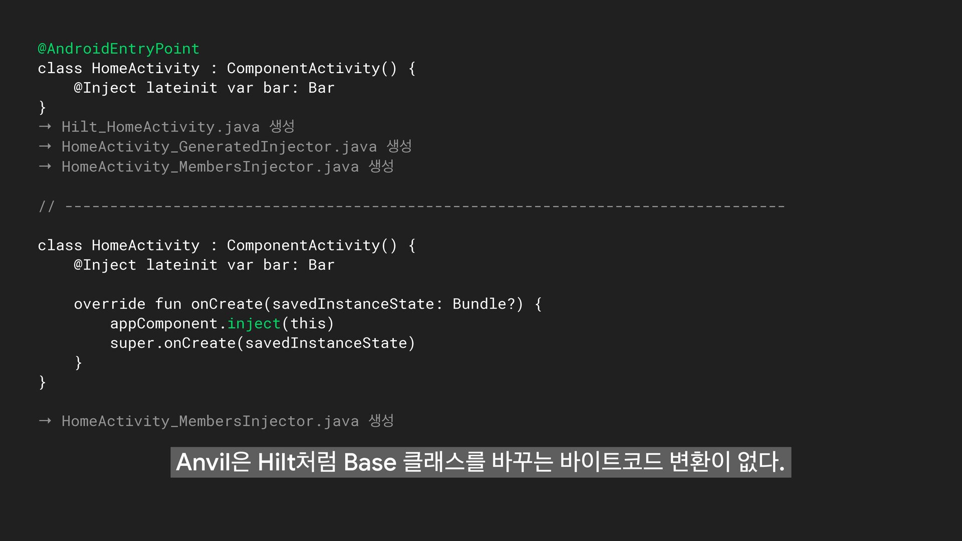 Bar } = @HiltAndroidApp class ExampleApplication : Hilt_ExampleApplication() { @Inject lateinit var bar: Bar } ߄٘ܳ ߸ജೞৈ, ࠗݽ ېझܳ ߸҃ೠ. (Gradle Plugin)