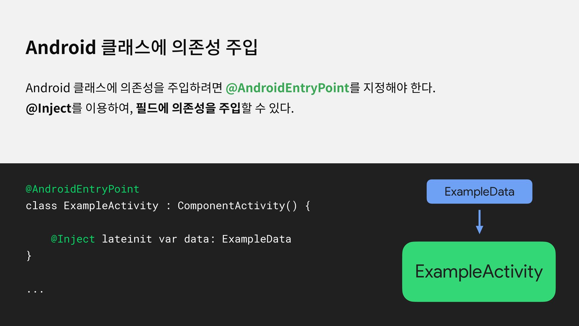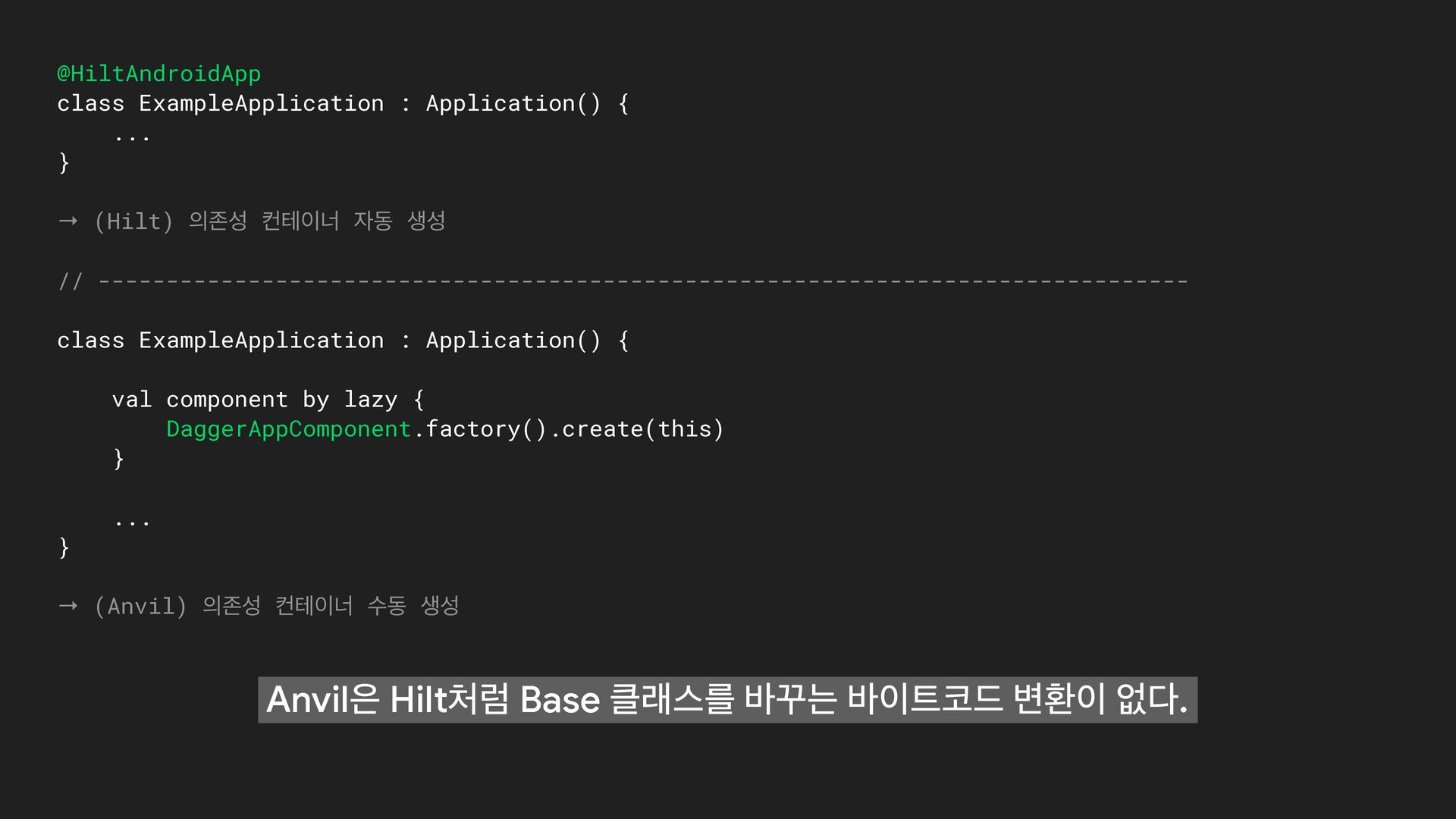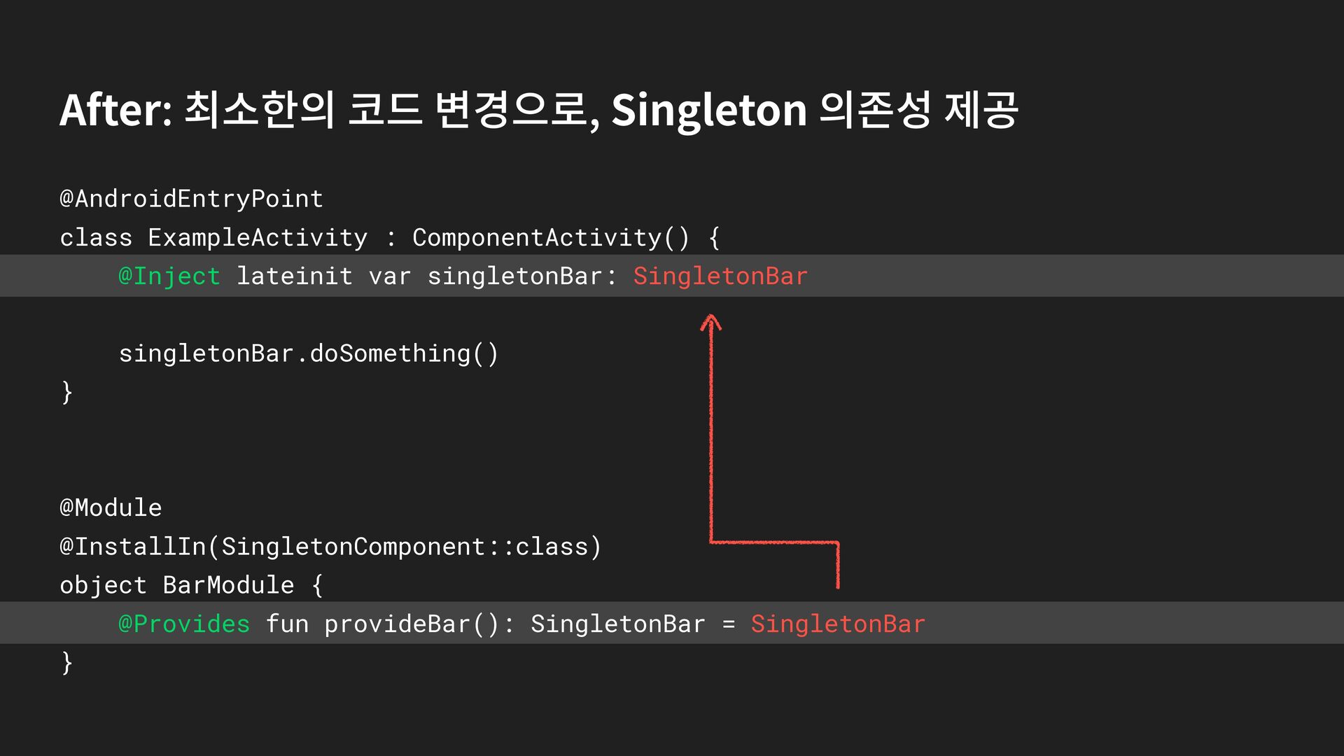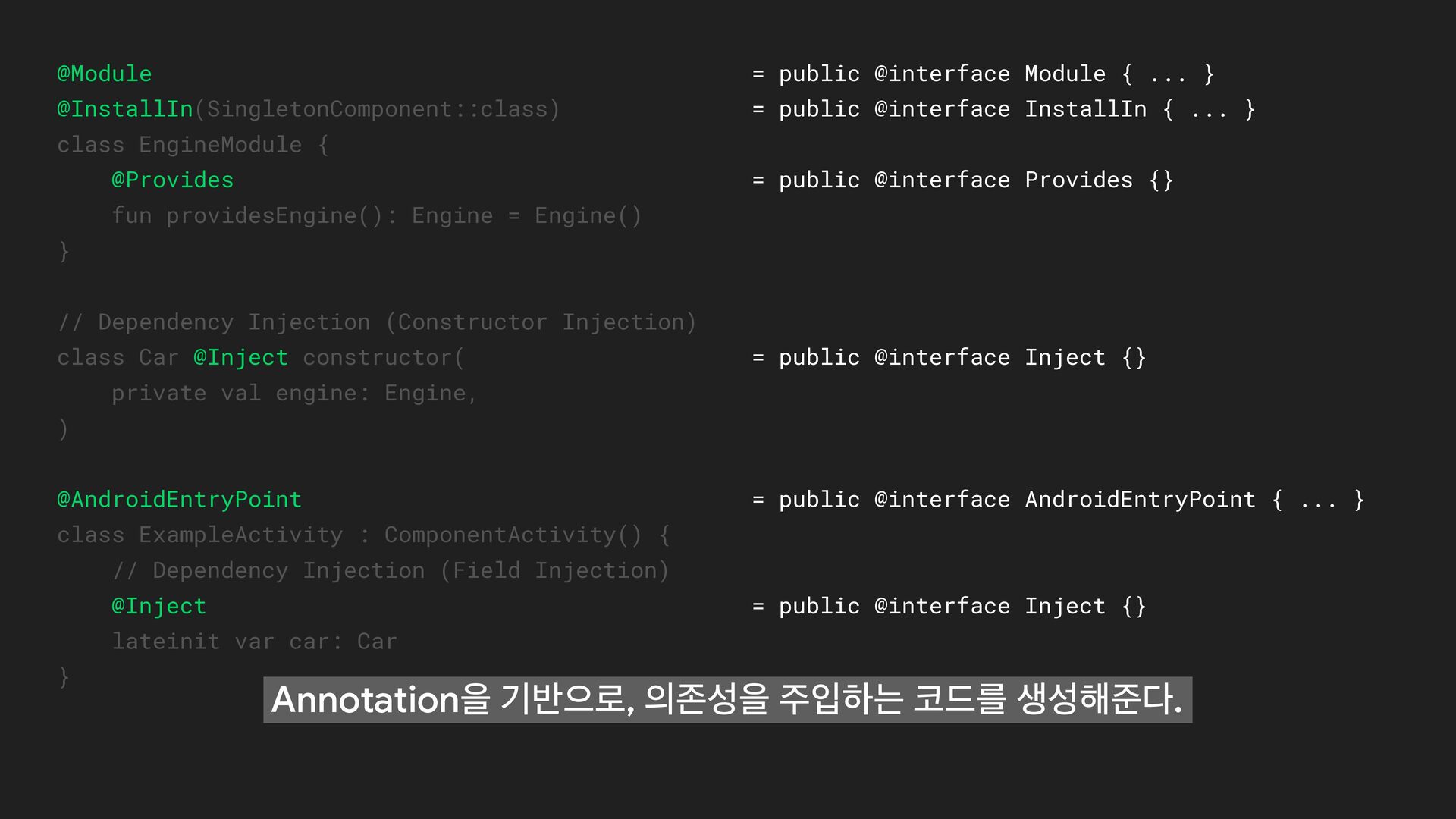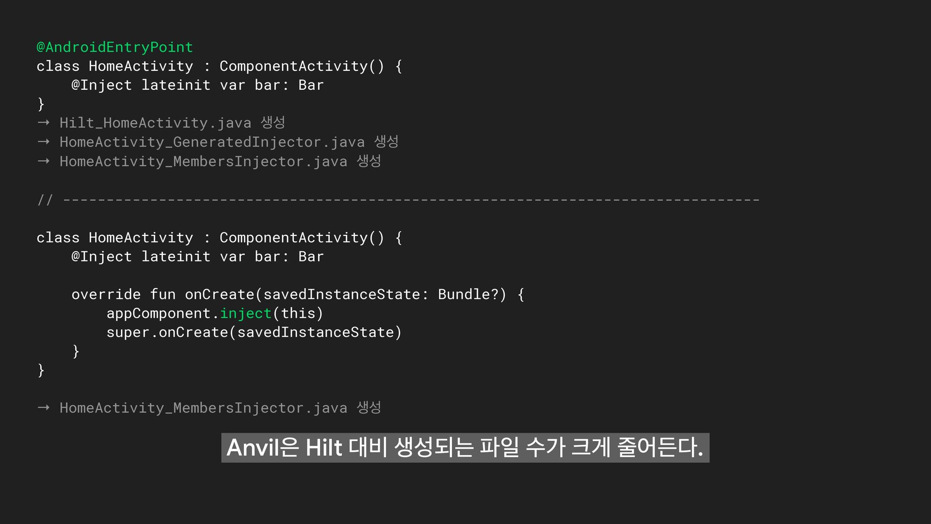 Bar } = @HiltAndroidApp class ExampleApplication : Hilt_ExampleApplication() { @Inject lateinit var bar: Bar } ߄٘ܳ ߸ജೞৈ, ࠗݽ ېझܳ ߸҃ೠ. (Gradle Plugin)