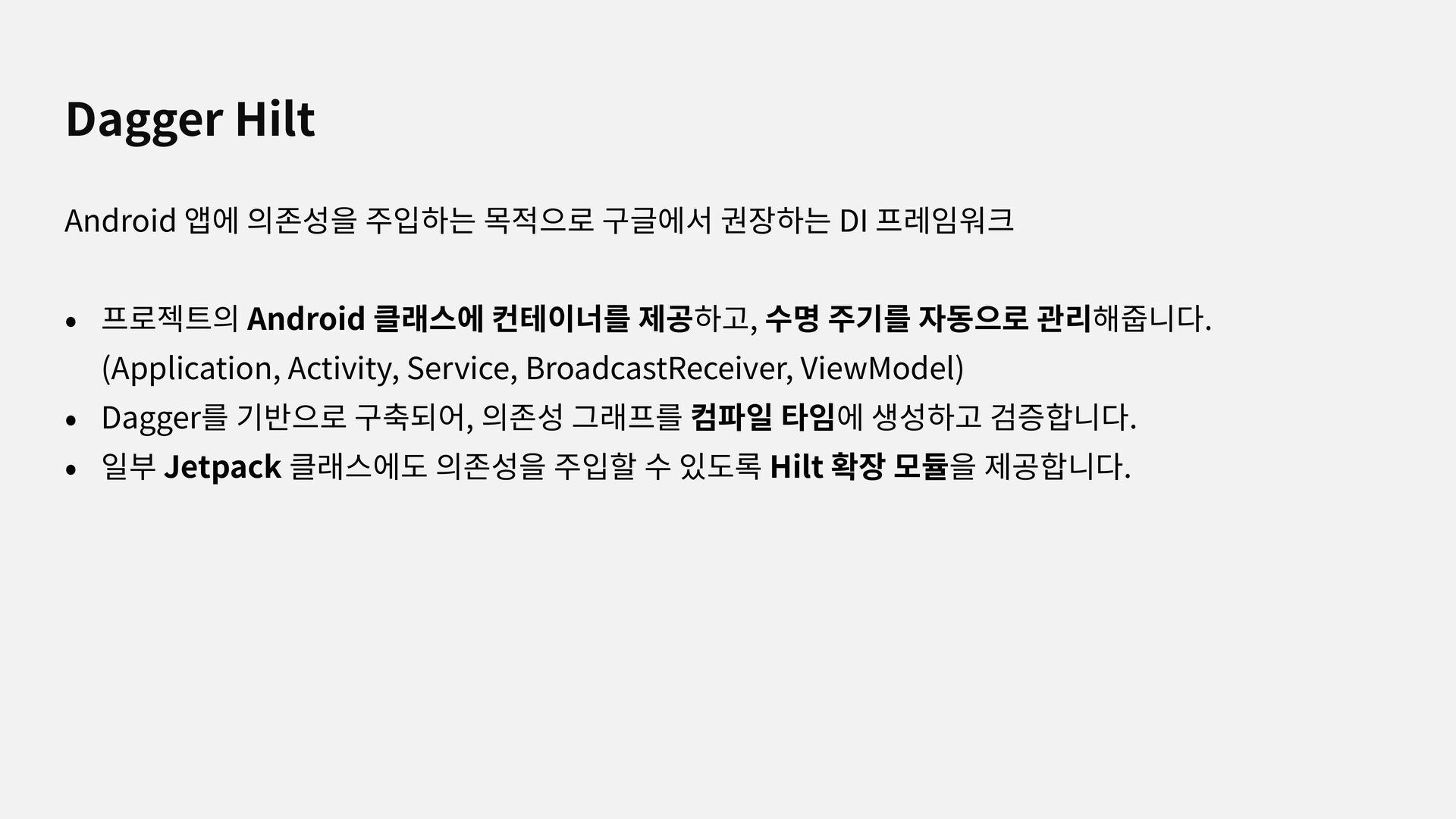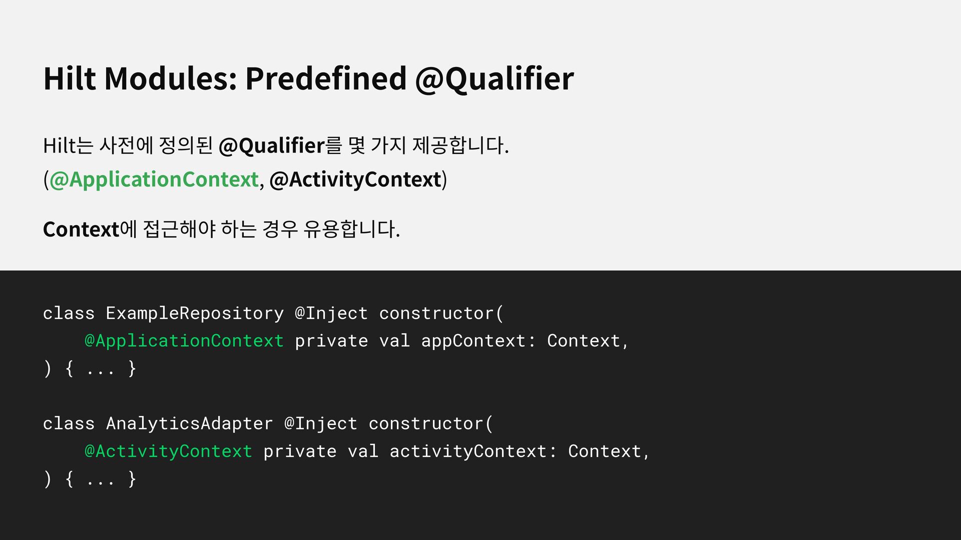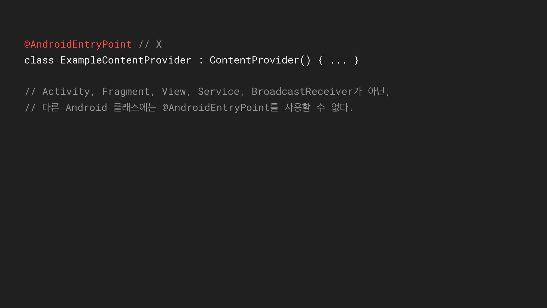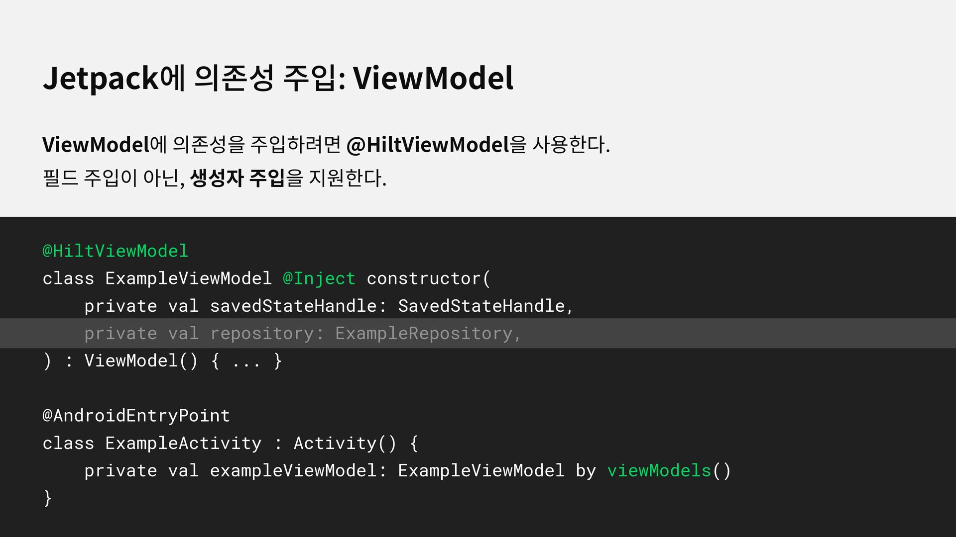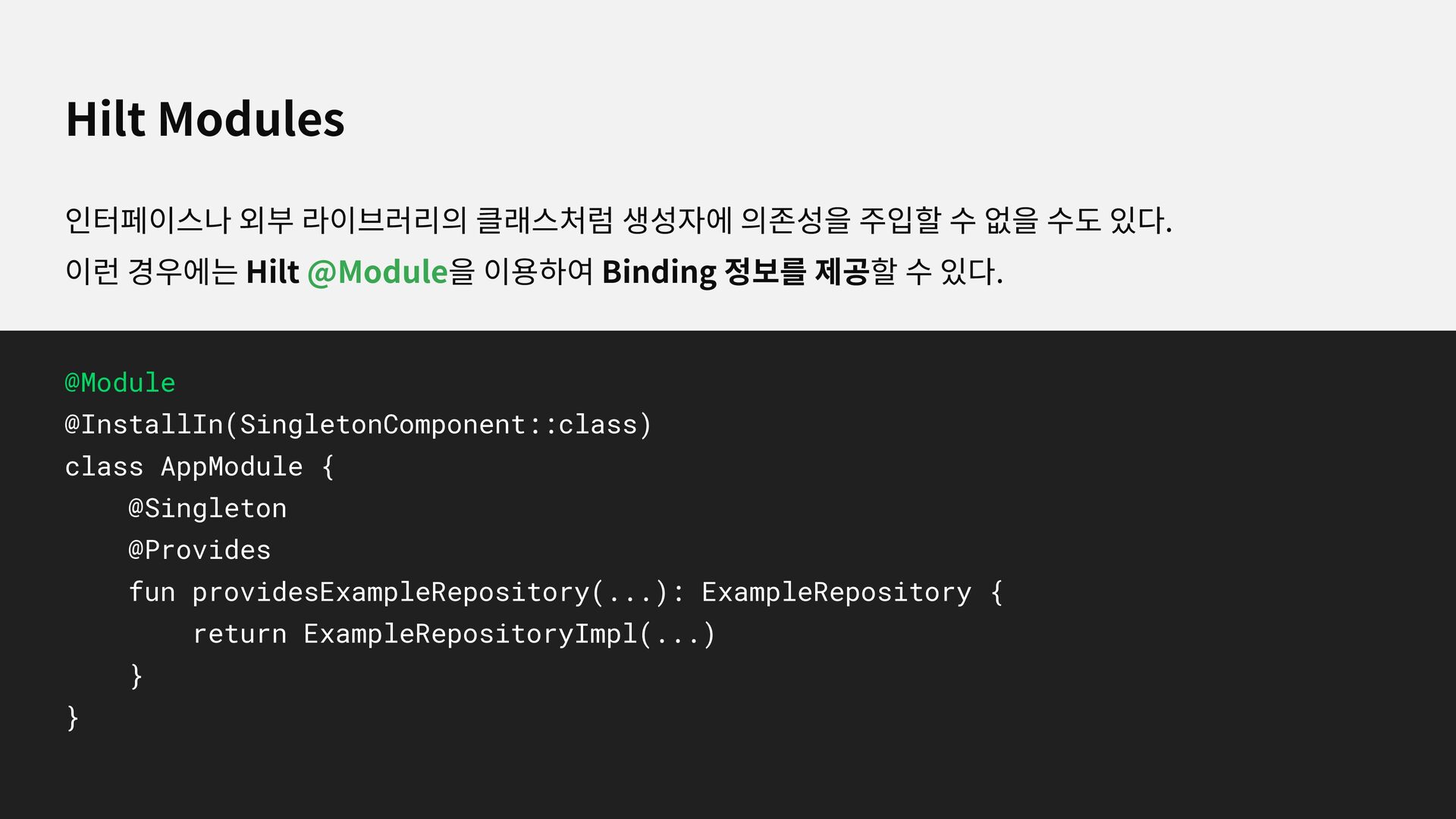 Bar } = @HiltAndroidApp class ExampleApplication : Hilt_ExampleApplication() { @Inject lateinit var bar: Bar } ߄٘ܳ ߸ജೞৈ, ࠗݽ ېझܳ ߸҃ೠ. (Gradle Plugin)