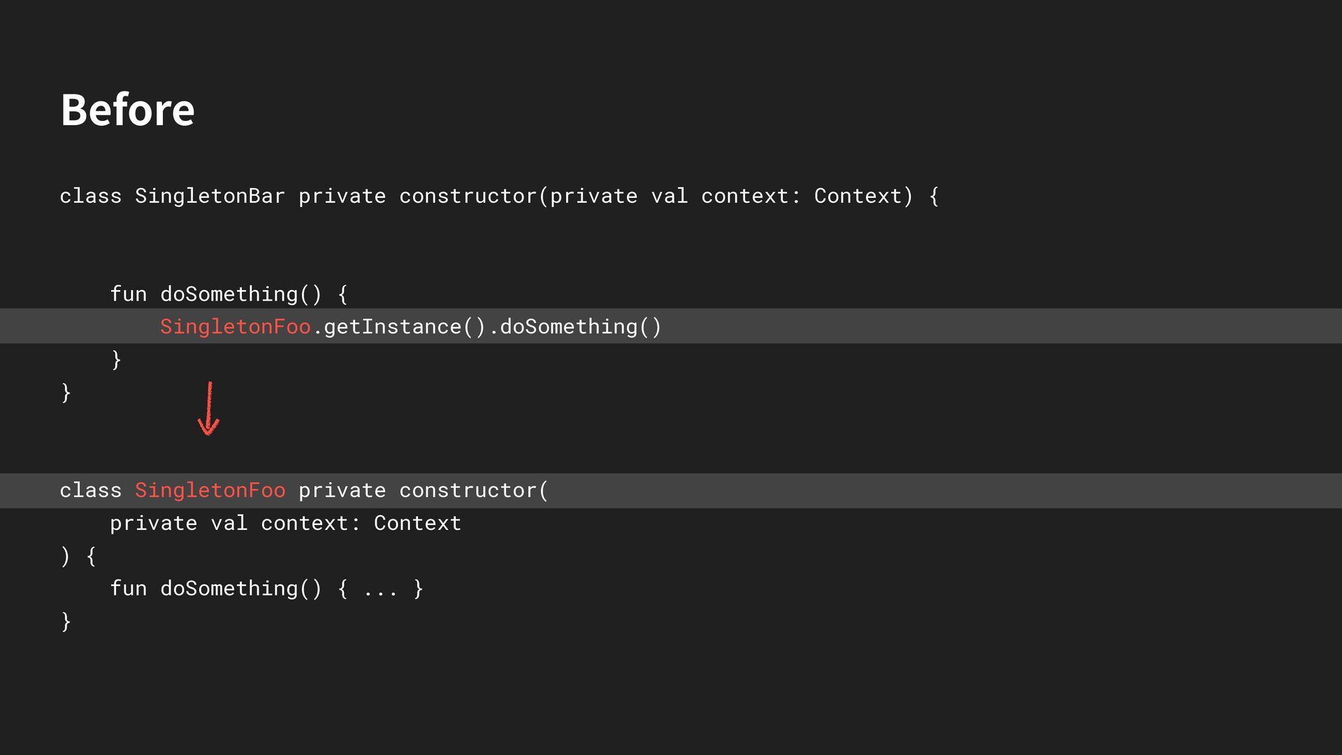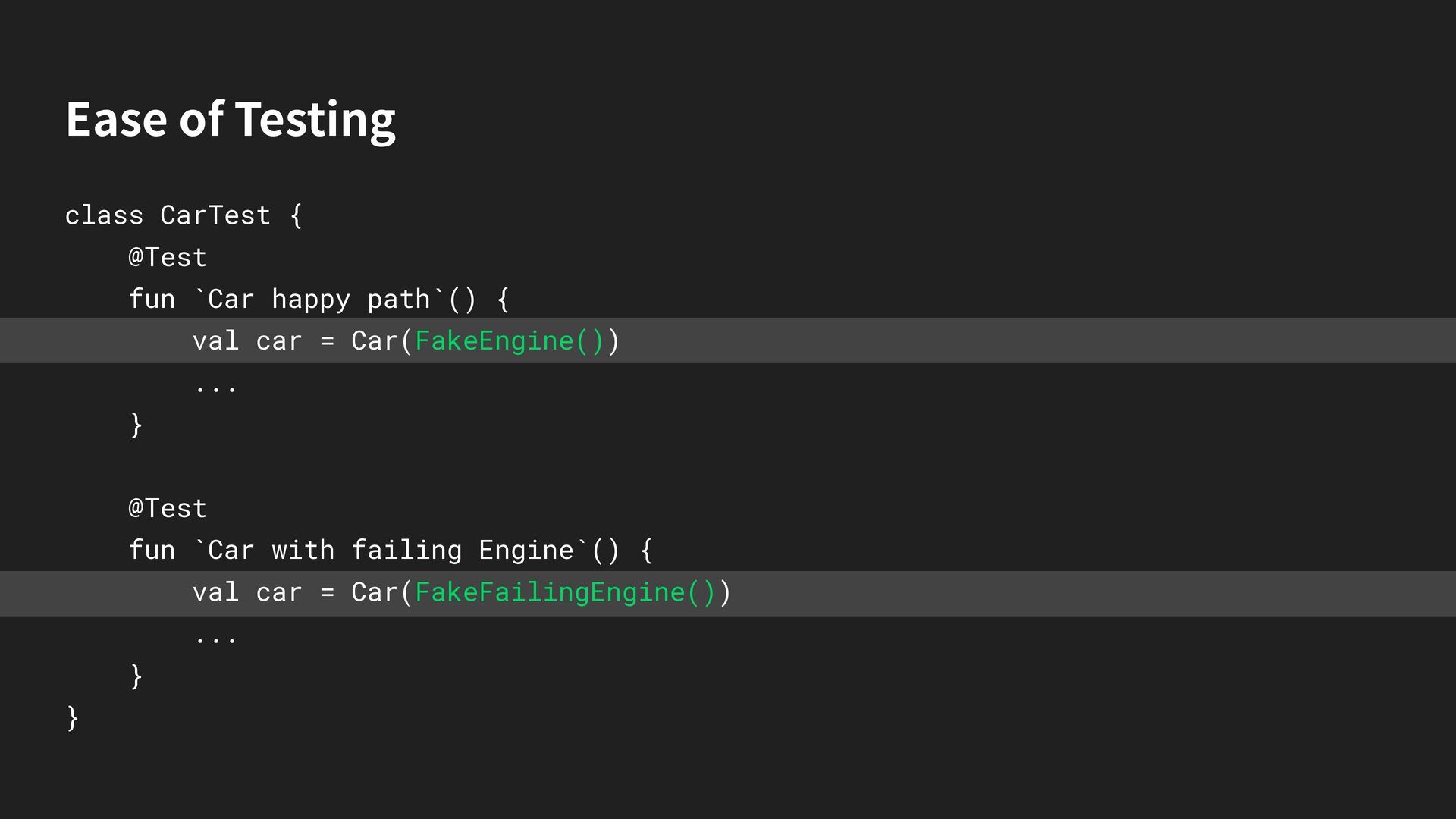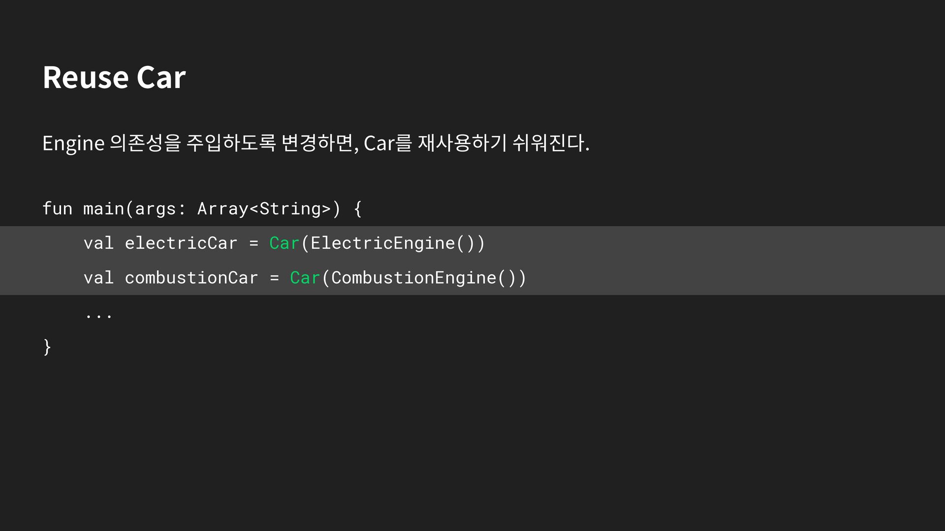 fun start() { engine.start() } } fun main(args: Array) { val engine = Engine() // construct val car = Car(engine) car.start() } Car With DI (Constructor Injection) Engine