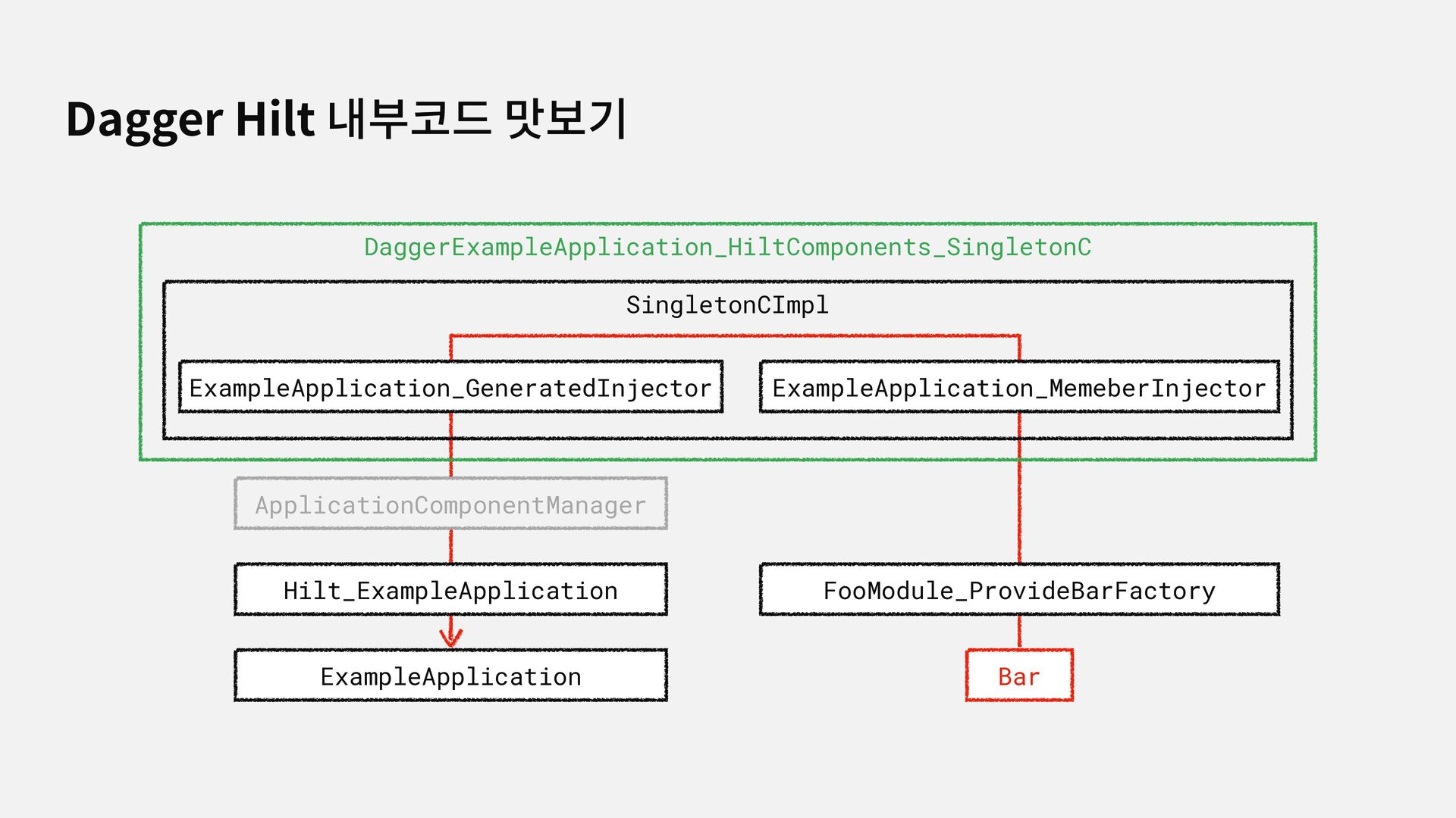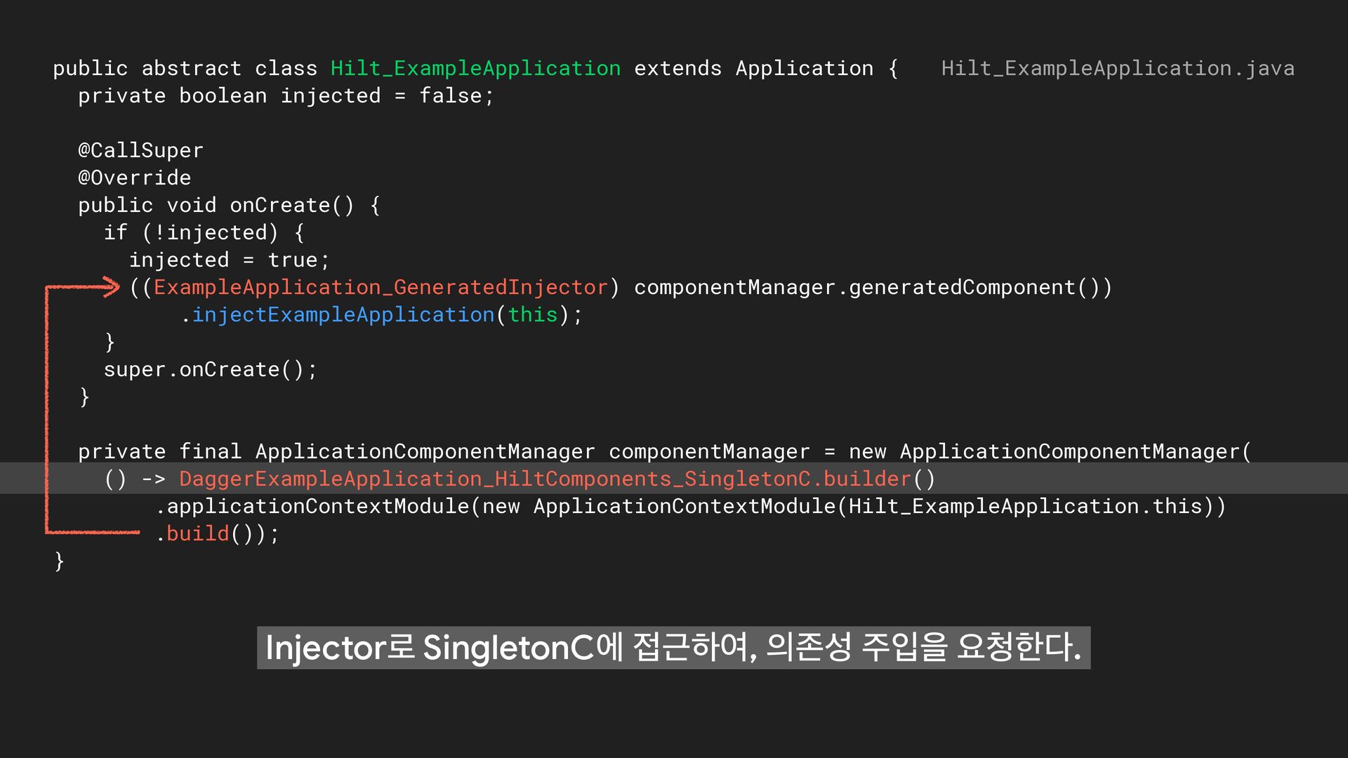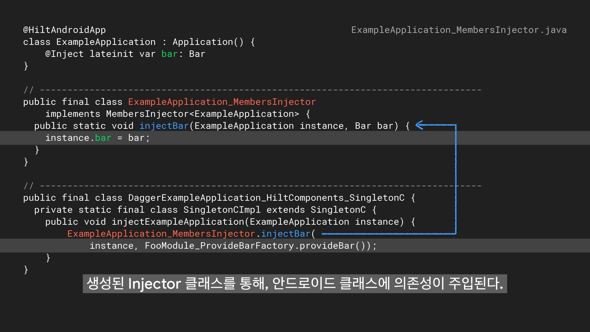 bar: Bar } // -------------------------------------------------------------------------------- public final class ExampleApplication_MembersInjector implements MembersInjector<ExampleApplication> { public static void injectBar(ExampleApplication instance, Bar bar) { instance.bar = bar; } } // -------------------------------------------------------------------------------- public final class DaggerExampleApplication_HiltComponents_SingletonC { private static final class SingletonCImpl extends SingletonC { public void injectExampleApplication(ExampleApplication instance) { ExampleApplication_MembersInjector.injectBar( instance, FooModule_ProvideBarFactory.provideBar()); } } ࢤࢿػ Injector ېझܳ ా೧, উ٘۽٘ ېझী ઓࢿ ੑػ.