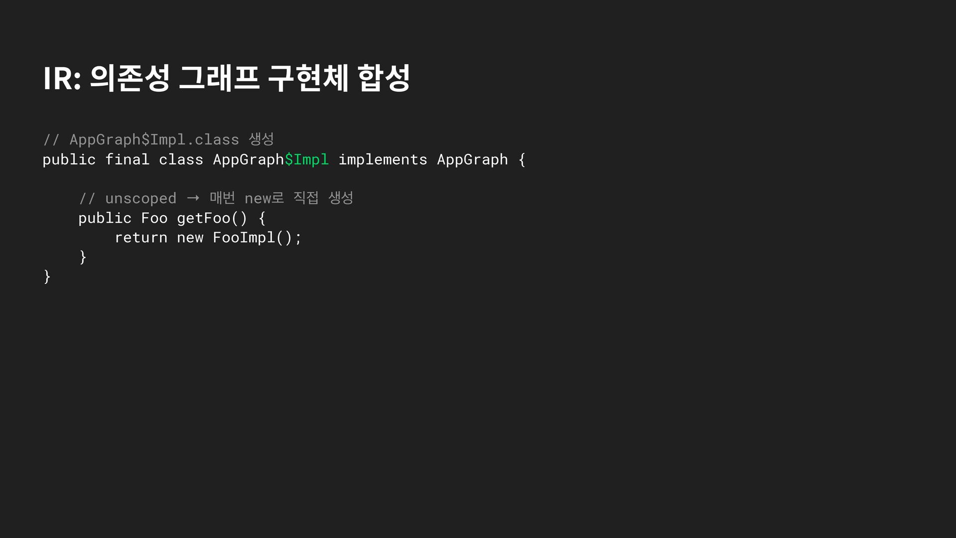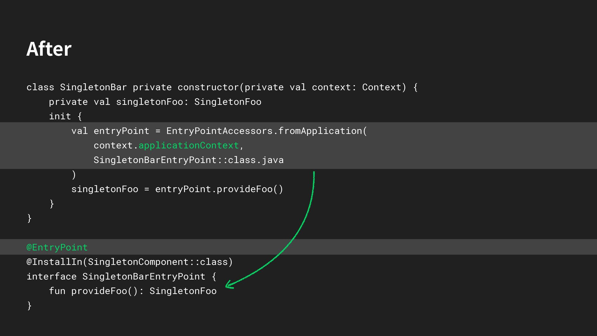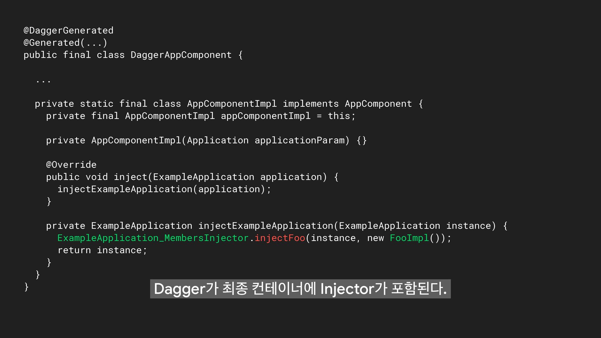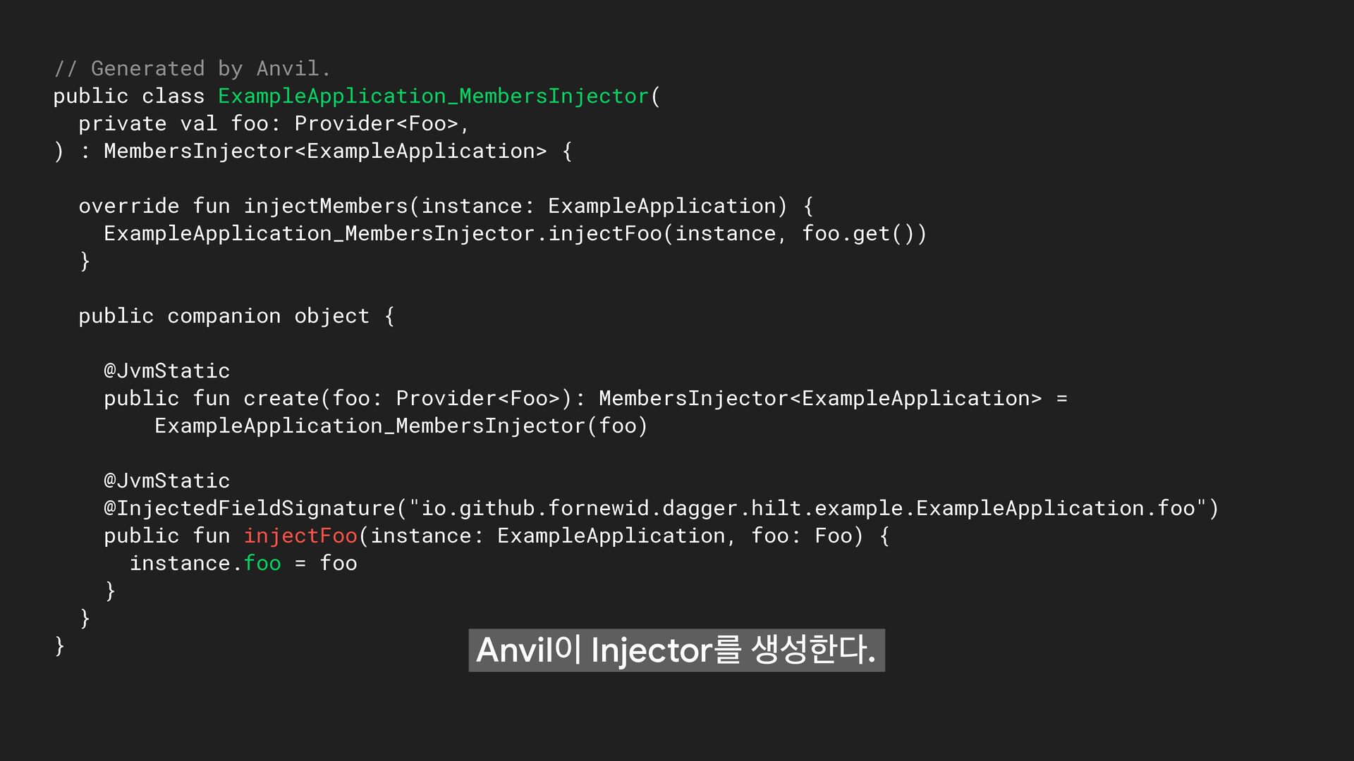 bar: Bar } // -------------------------------------------------------------------------------- public final class ExampleApplication_MembersInjector implements MembersInjector<ExampleApplication> { public static void injectBar(ExampleApplication instance, Bar bar) { instance.bar = bar; } } // -------------------------------------------------------------------------------- public final class DaggerExampleApplication_HiltComponents_SingletonC { private static final class SingletonCImpl extends SingletonC { public void injectExampleApplication(ExampleApplication instance) { ExampleApplication_MembersInjector.injectBar( instance, FooModule_ProvideBarFactory.provideBar()); } } ࢤࢿػ Injector ېझܳ ా೧, উ٘۽٘ ېझী ઓࢿ ੑػ.