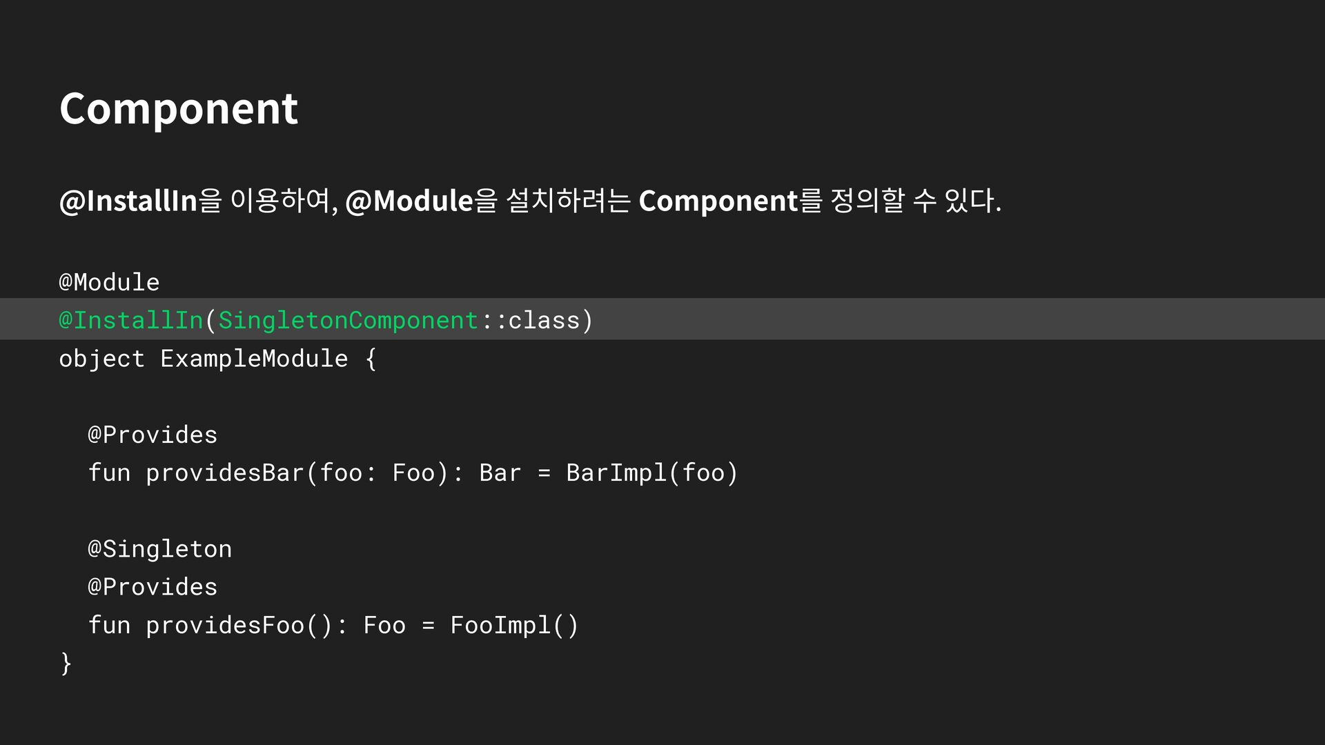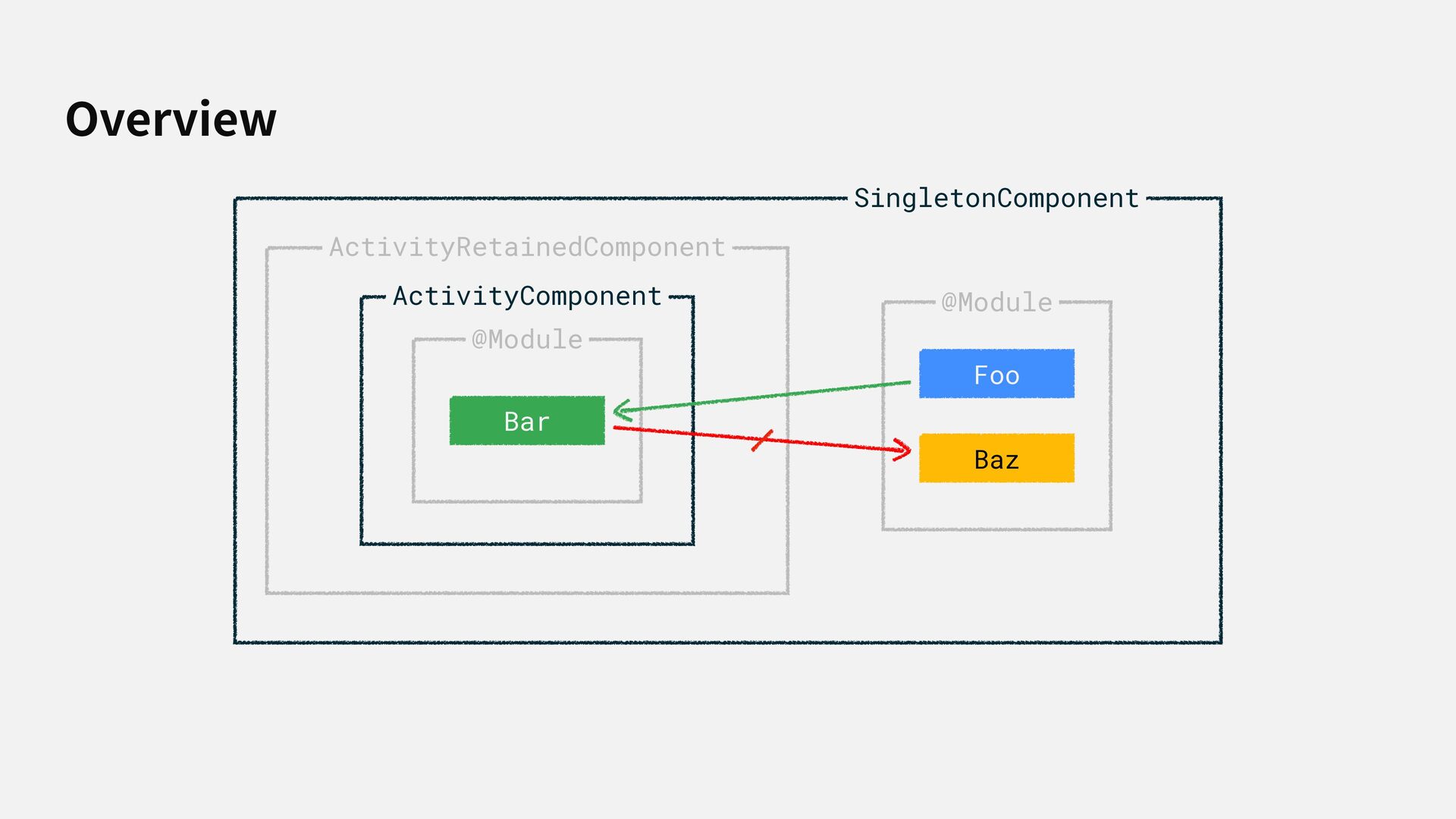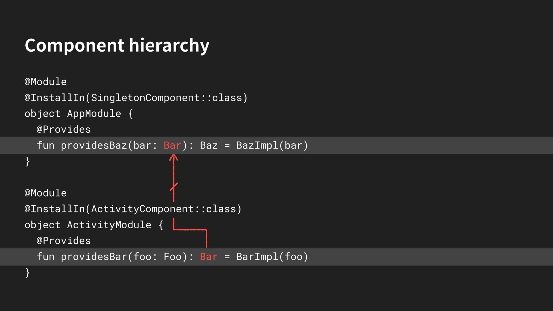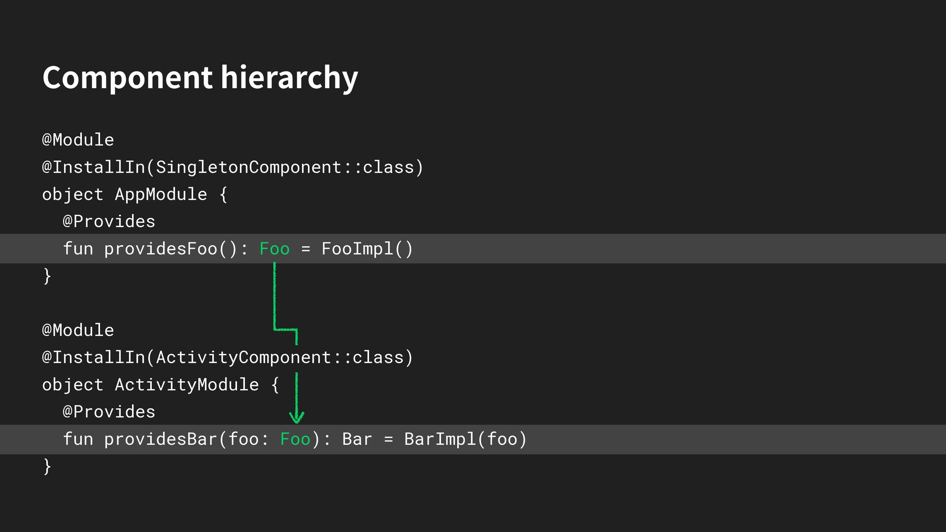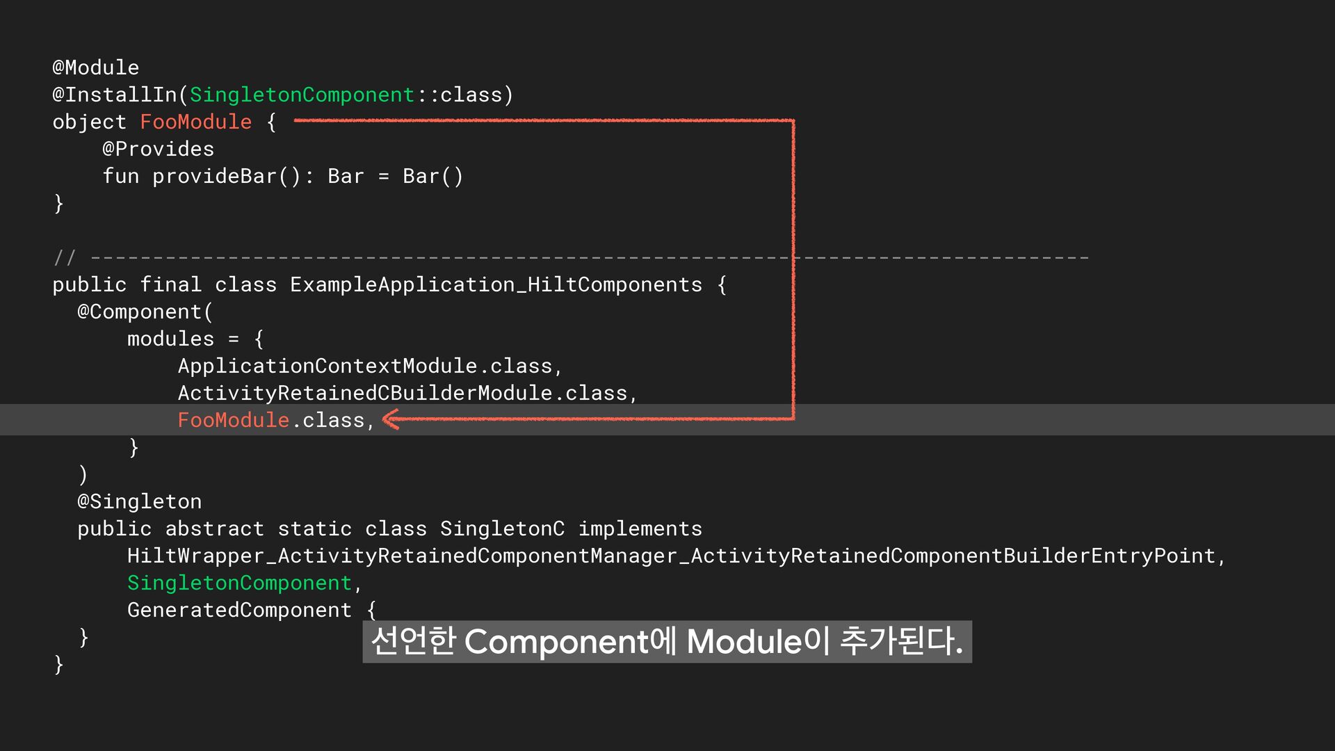 fun provideBar(): Bar = Bar() } // -------------------------------------------------------------------------------- public final class ExampleApplication_HiltComponents { @Component( modules = { ApplicationContextModule.class, ActivityRetainedCBuilderModule.class, FooModule.class, } ) @Singleton public abstract static class SingletonC implements HiltWrapper_ActivityRetainedComponentManager_ActivityRetainedComponentBuilderEntryPoint, SingletonComponent, GeneratedComponent { } }