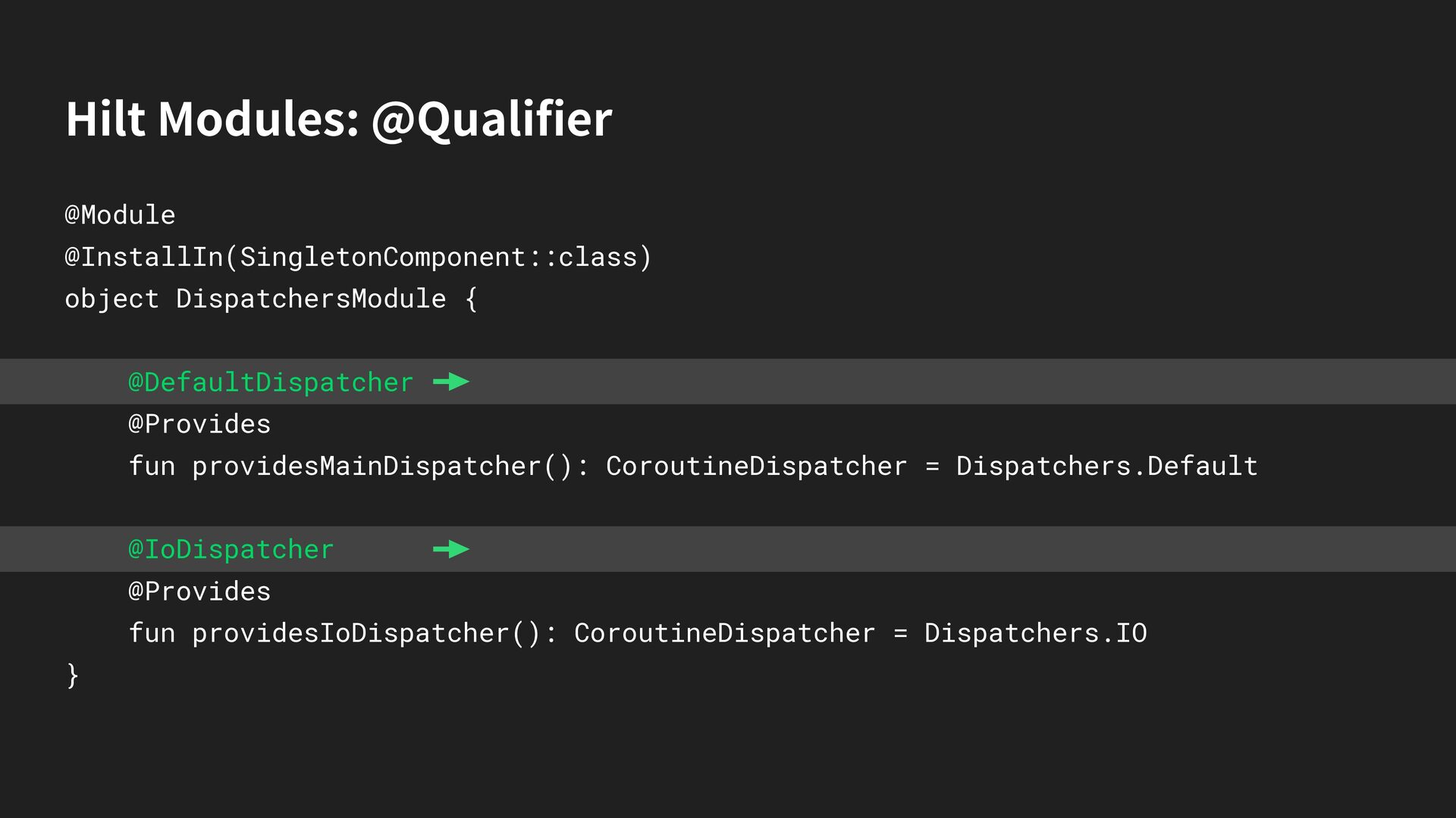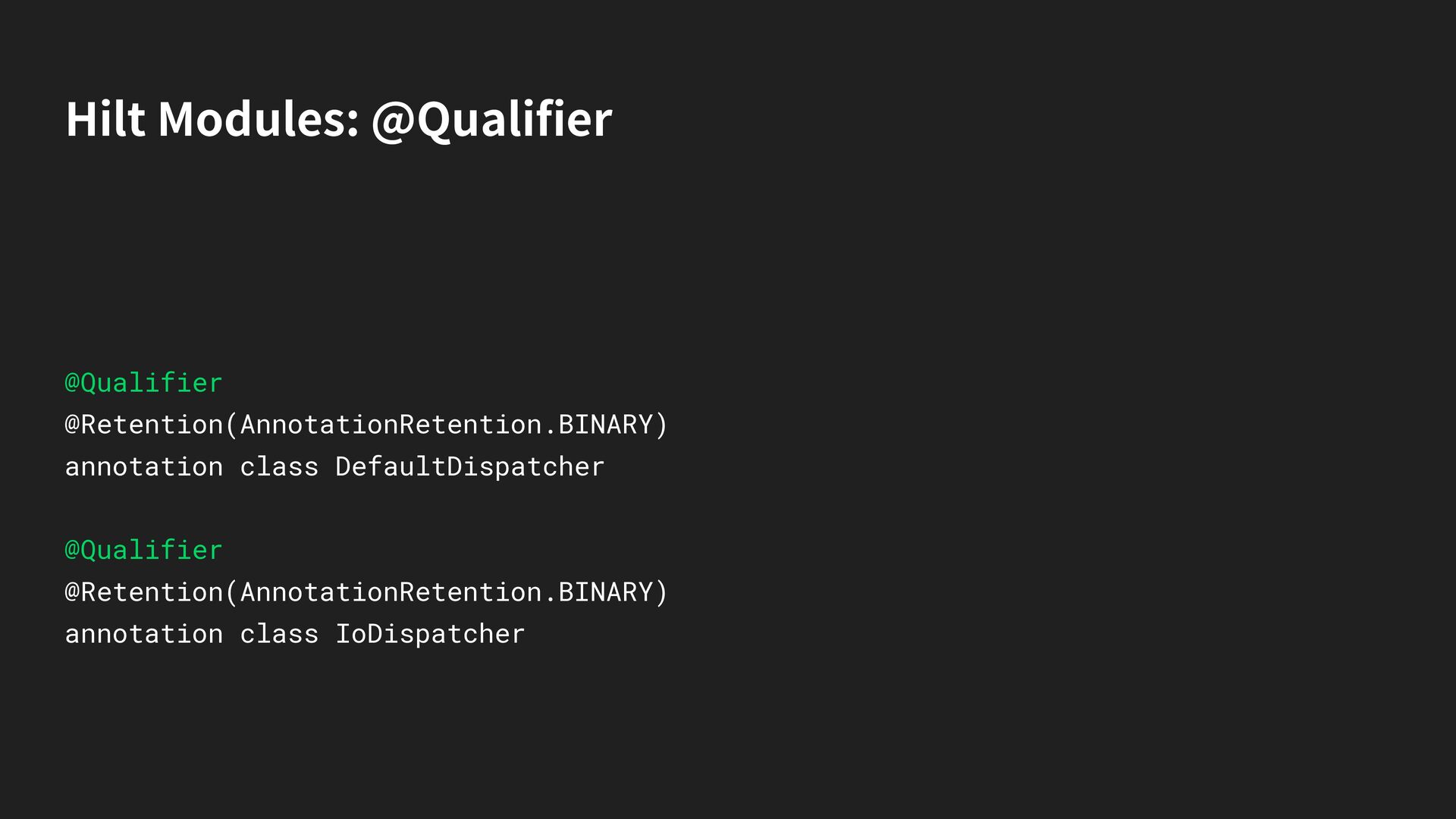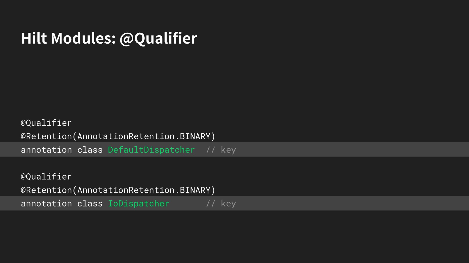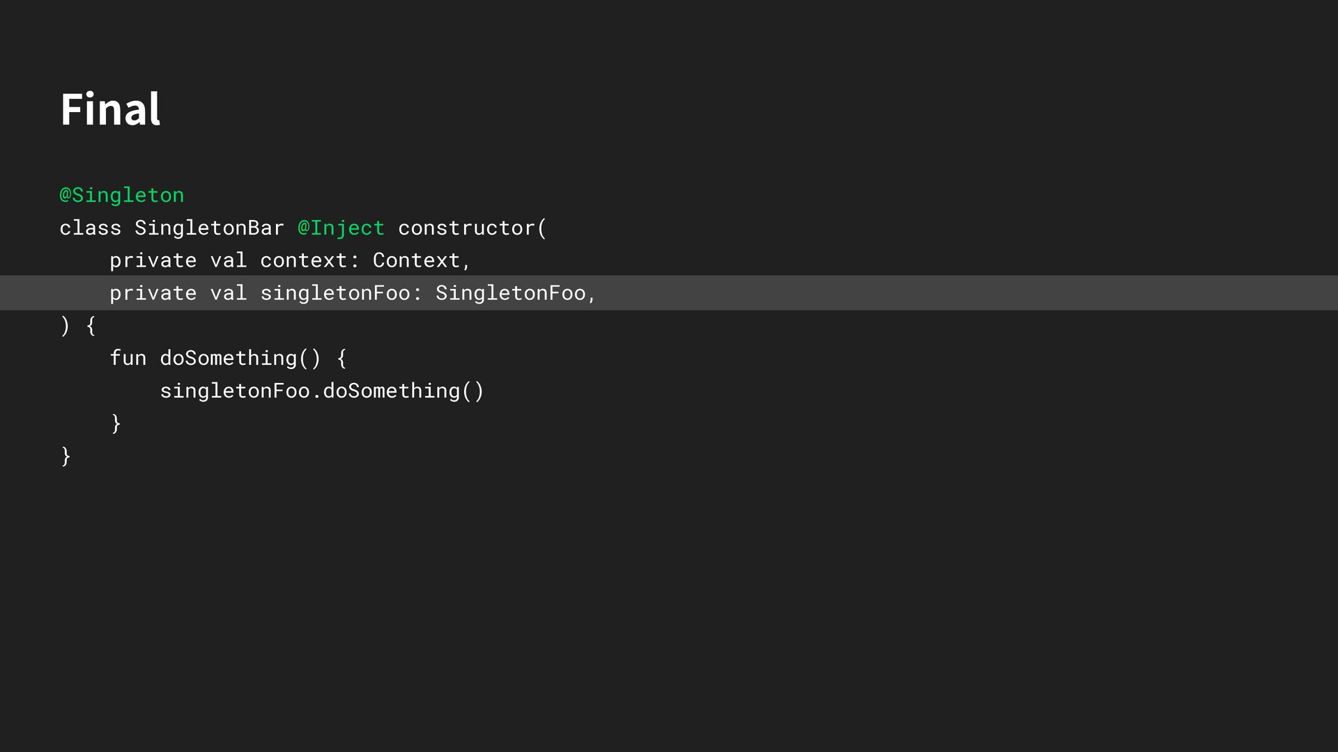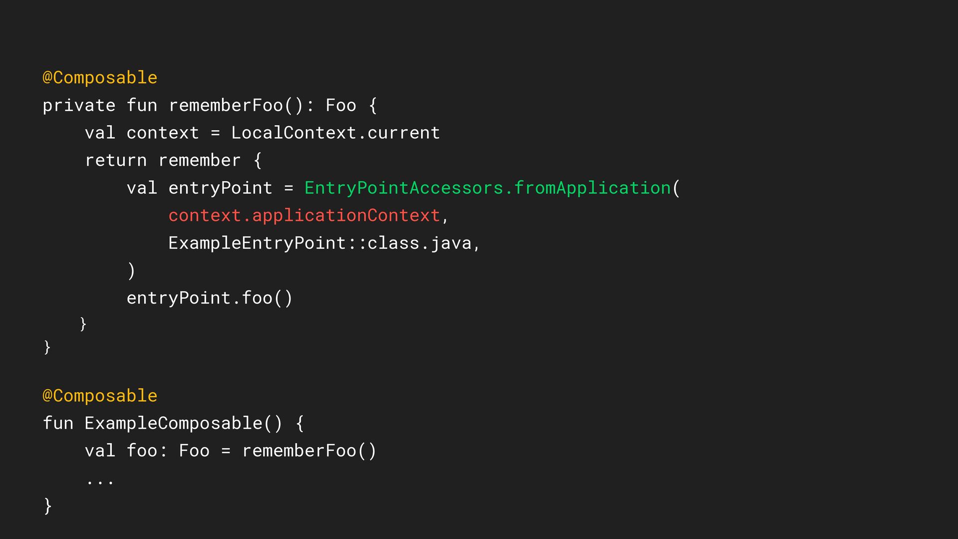 fun provideBar(): Bar = Bar() } // -------------------------------------------------------------------------------- public final class ExampleApplication_HiltComponents { @Component( modules = { ApplicationContextModule.class, ActivityRetainedCBuilderModule.class, FooModule.class, } ) @Singleton public abstract static class SingletonC implements HiltWrapper_ActivityRetainedComponentManager_ActivityRetainedComponentBuilderEntryPoint, SingletonComponent, GeneratedComponent { } }