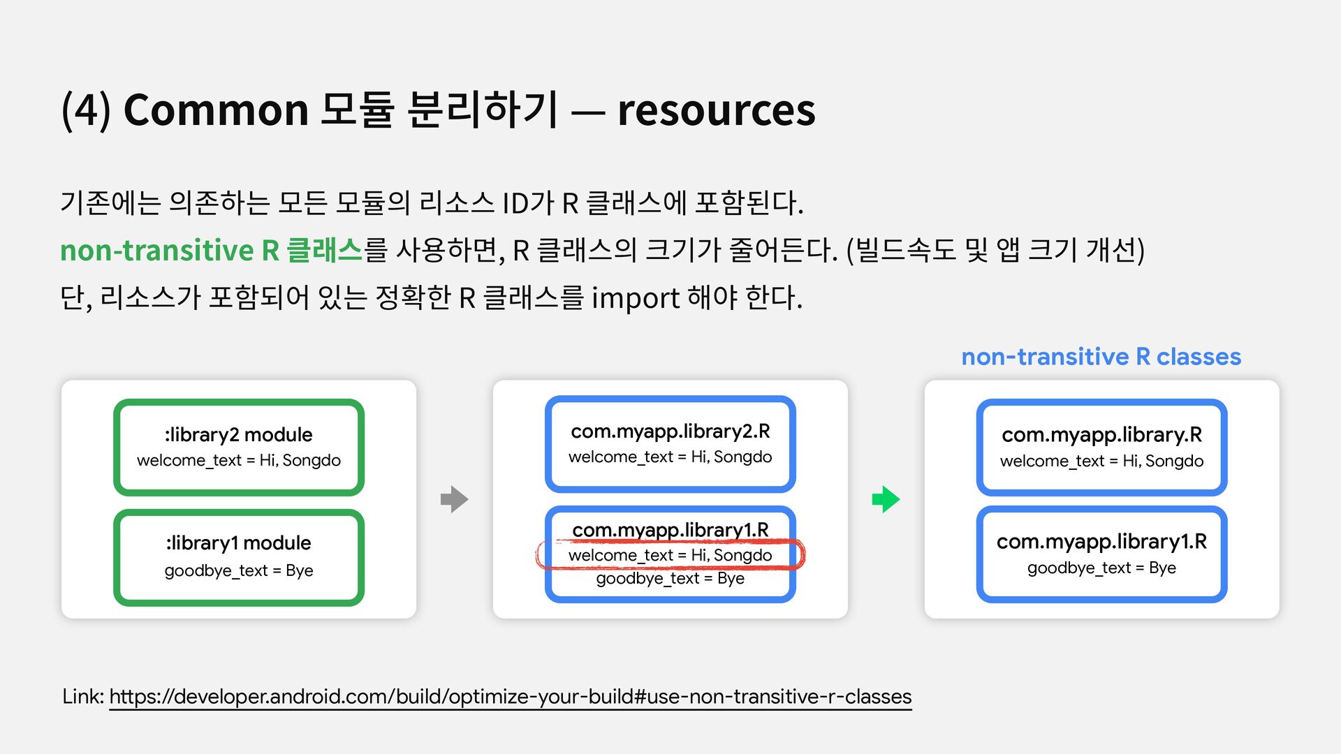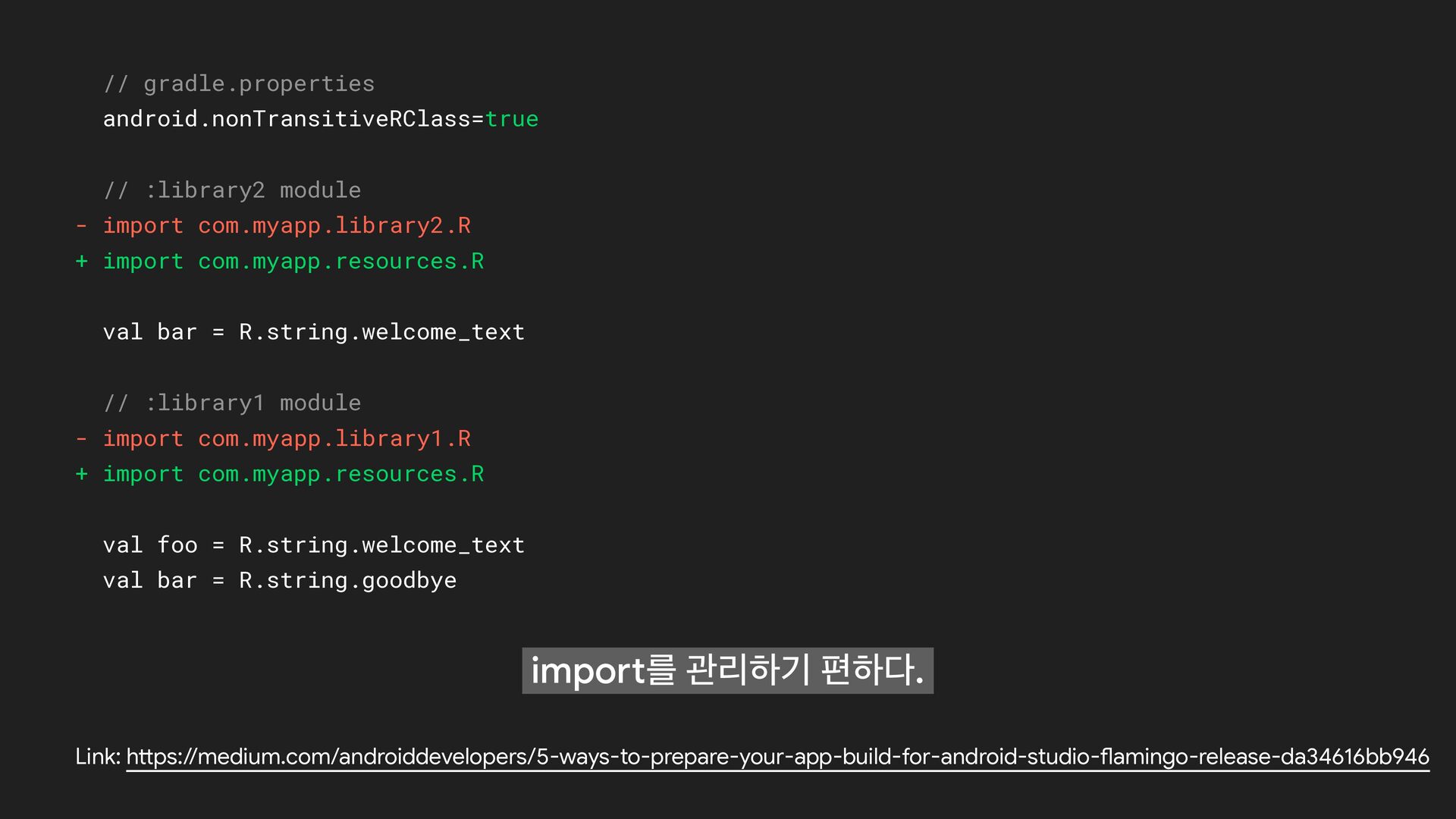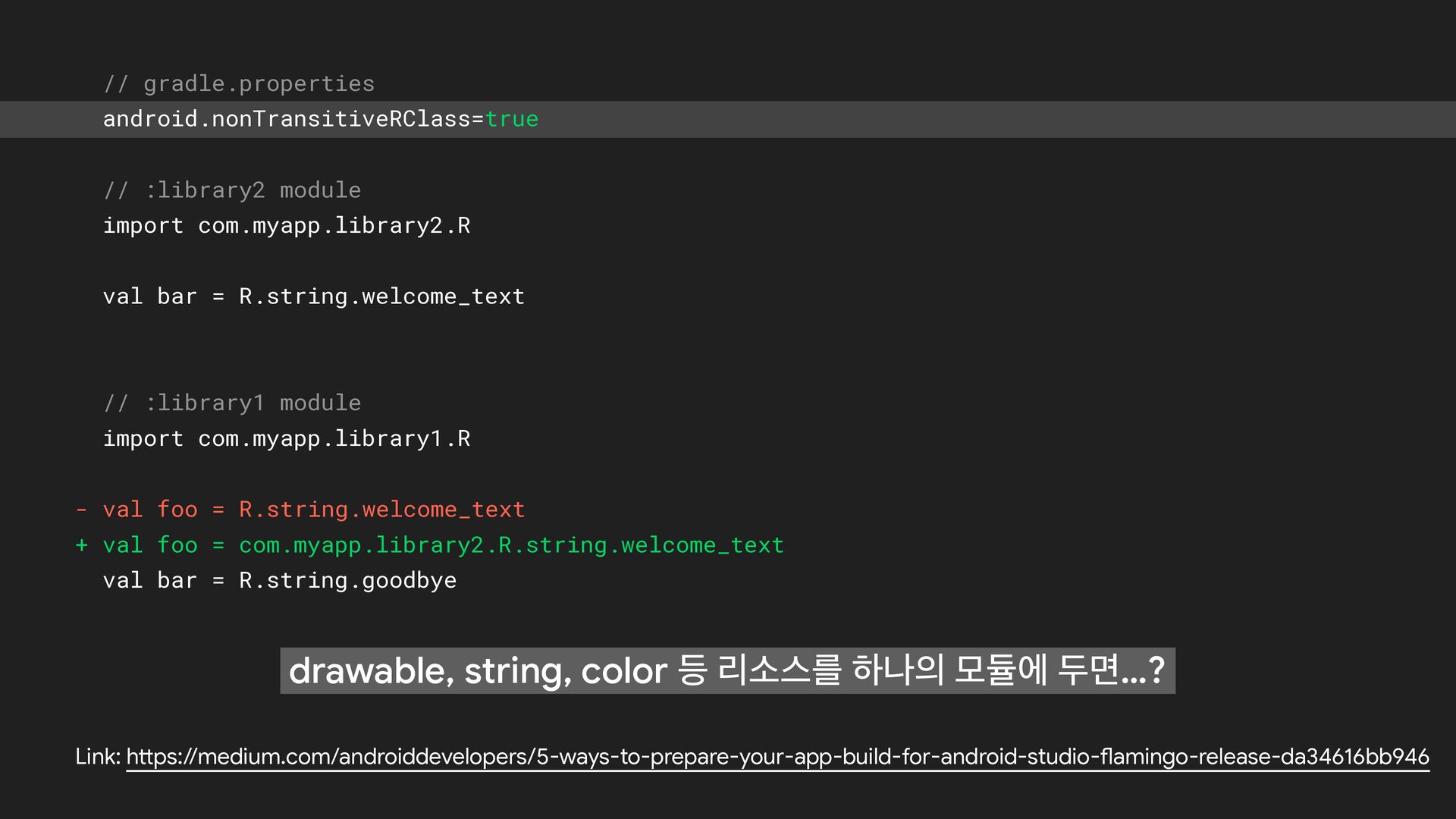 import com.myapp.resources.R val bar = R.string.welcome_text // :library1 module - import com.myapp.library1.R + import com.myapp.resources.R val foo = R.string.welcome_text val bar = R.string.goodbye impo r ܳ ҙܻೞӝ ಞೞ. Link: h tt ps://medium.com/androiddevelopers/5-ways-to-prepare-your-app-build-for-android-studio- fl amingo-release-da34616bb946