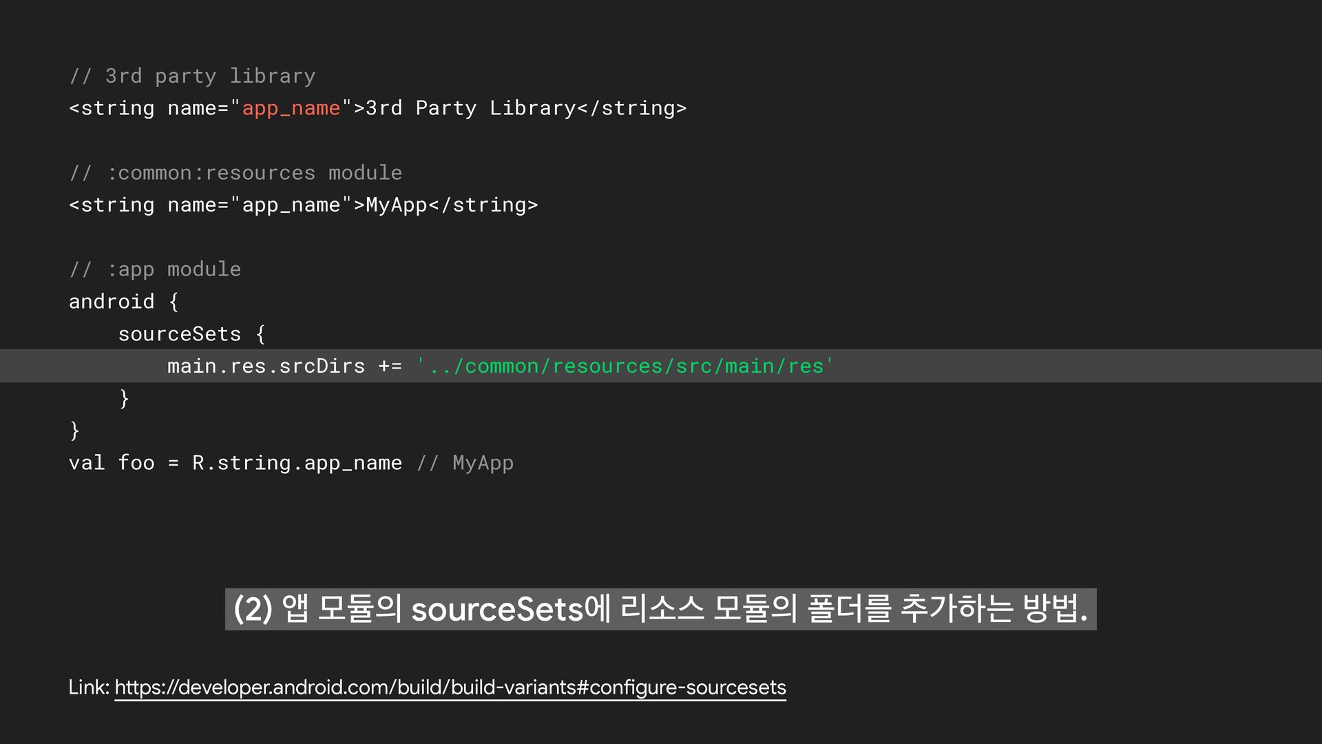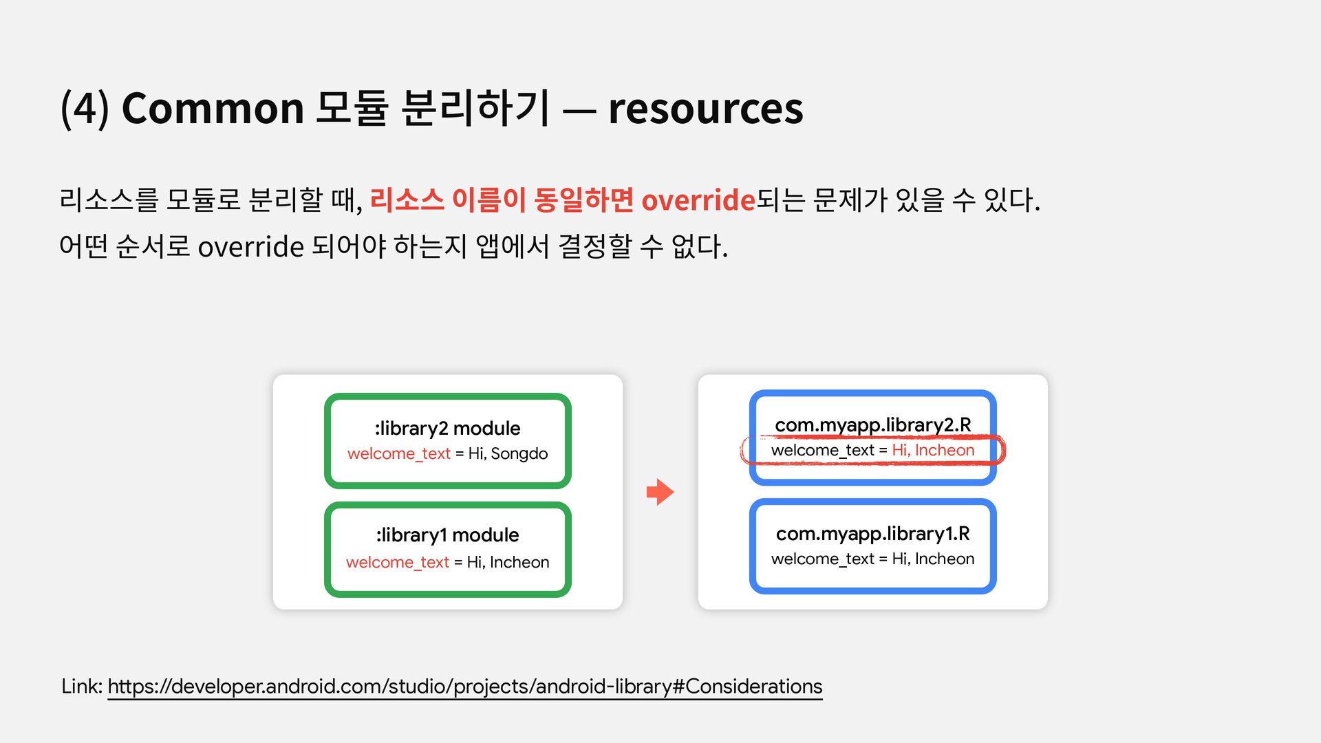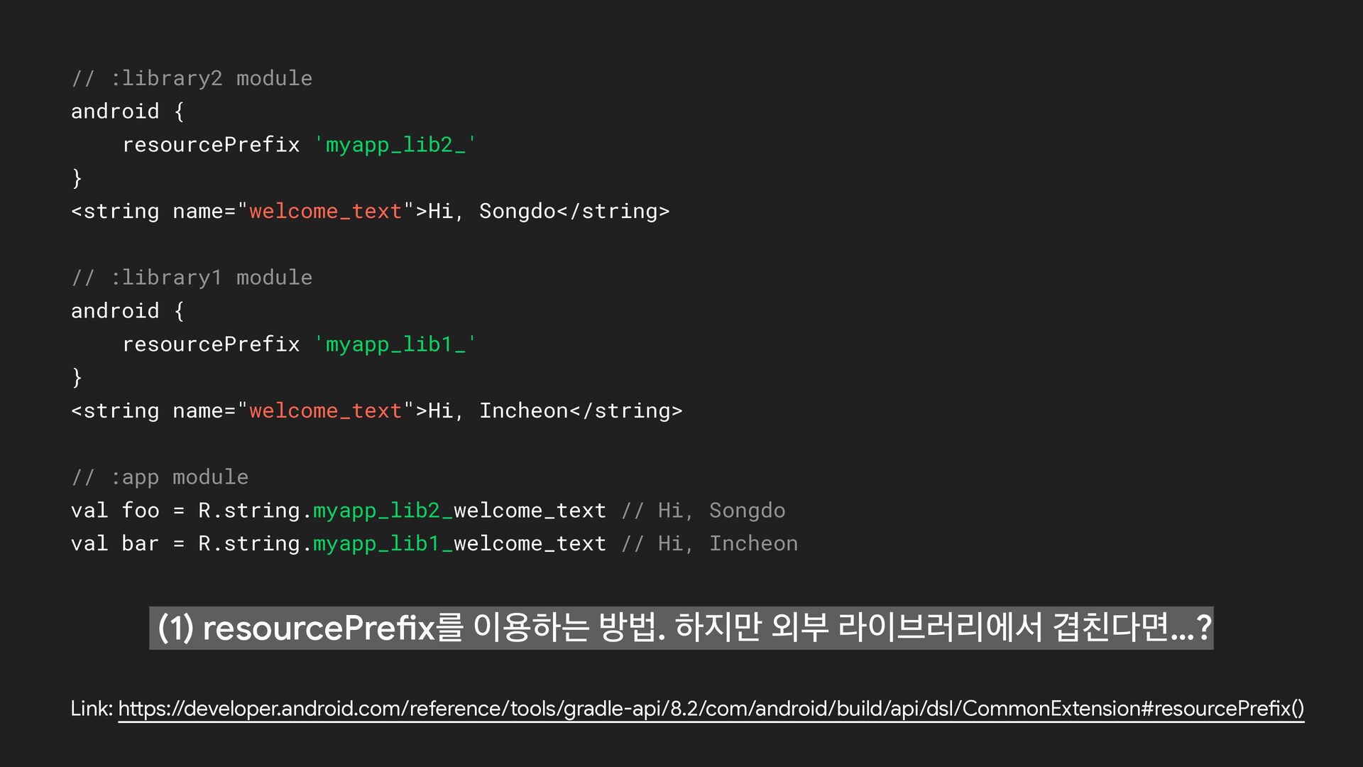 import com.myapp.resources.R val bar = R.string.welcome_text // :library1 module - import com.myapp.library1.R + import com.myapp.resources.R val foo = R.string.welcome_text val bar = R.string.goodbye impo r ܳ ҙܻೞӝ ಞೞ. Link: h tt ps://medium.com/androiddevelopers/5-ways-to-prepare-your-app-build-for-android-studio- fl amingo-release-da34616bb946