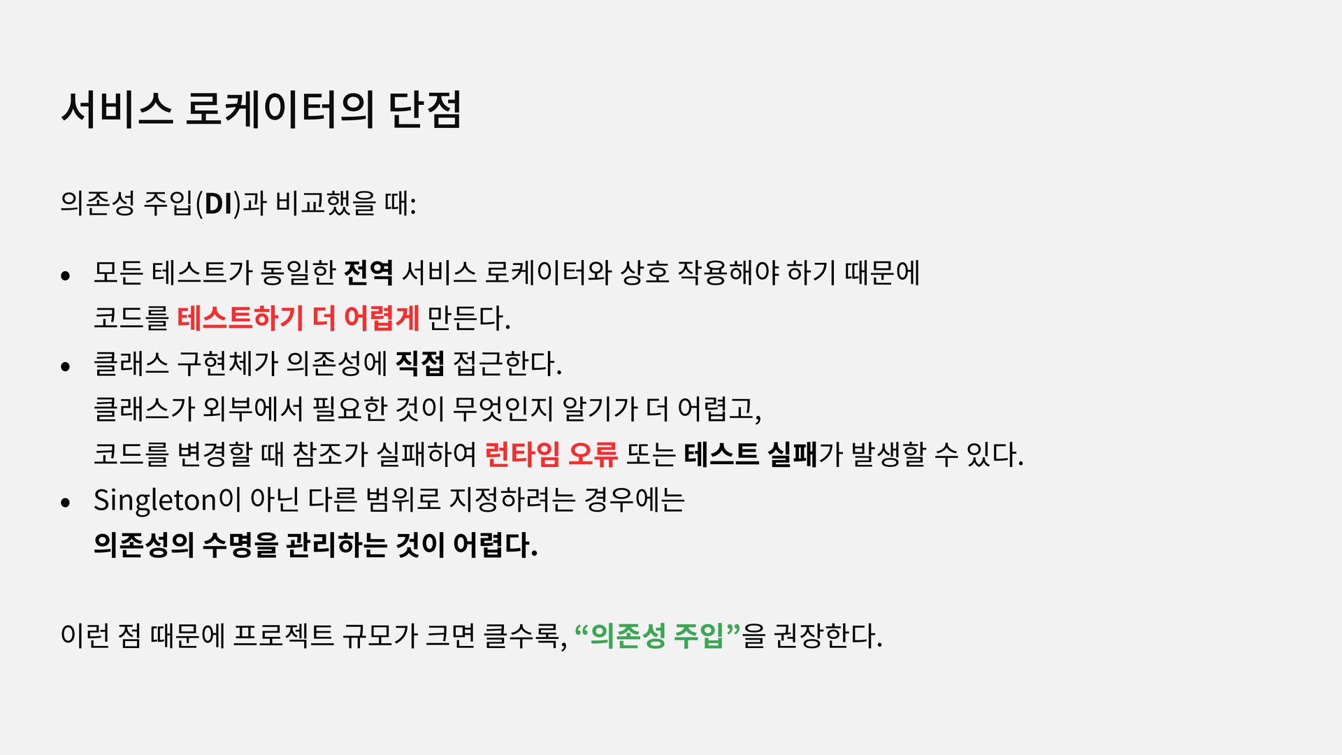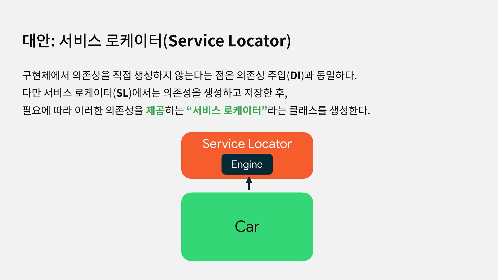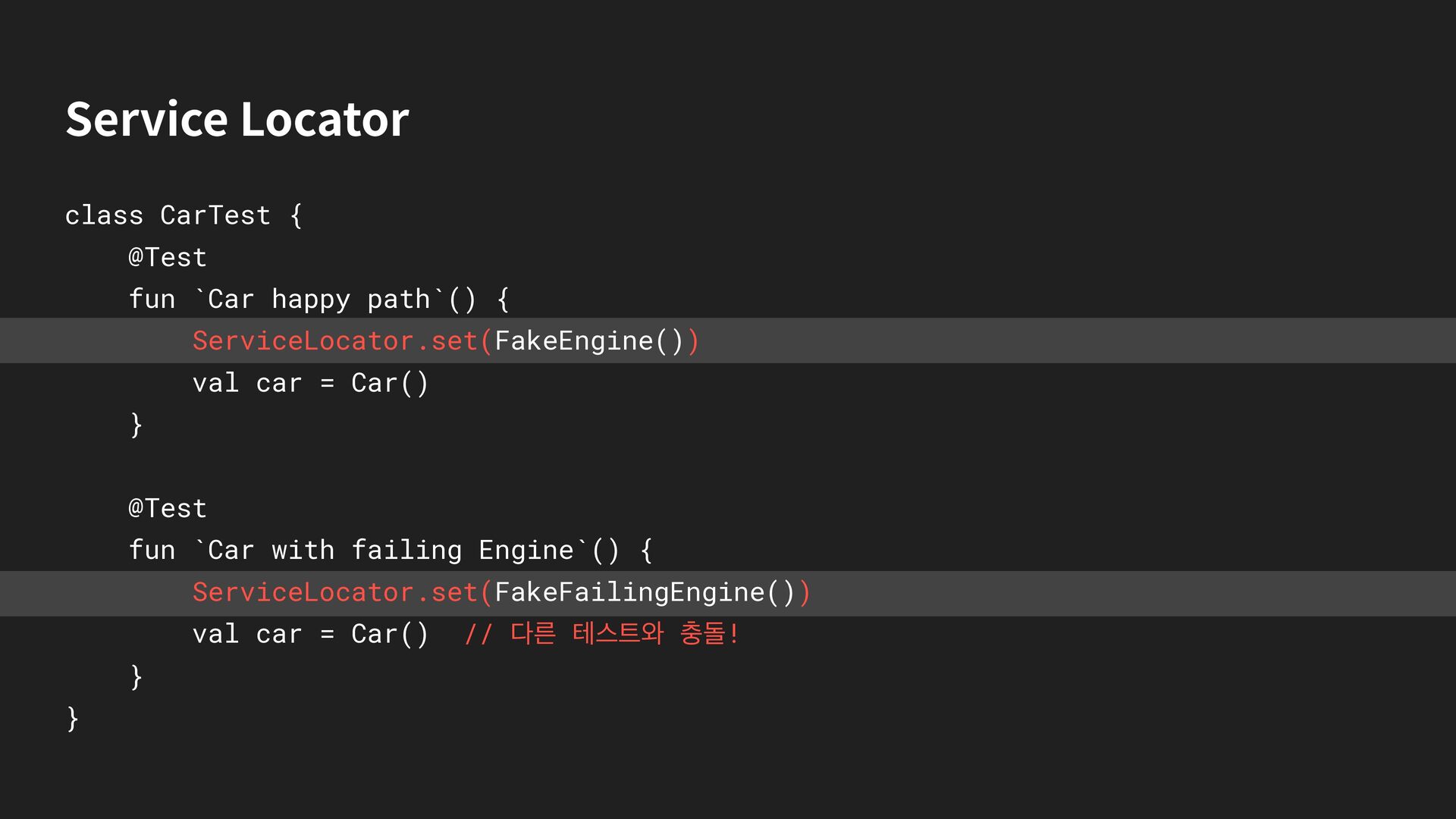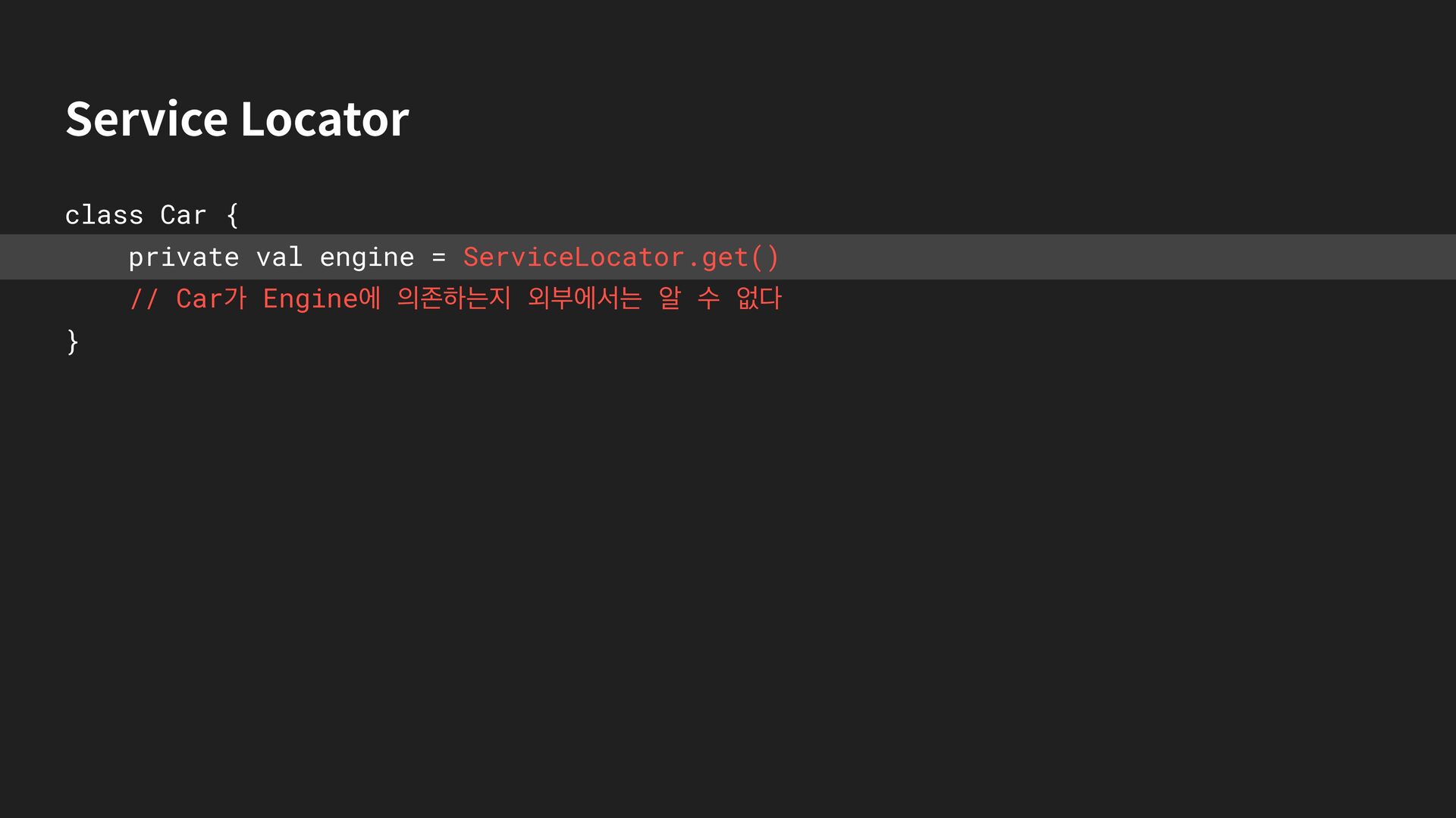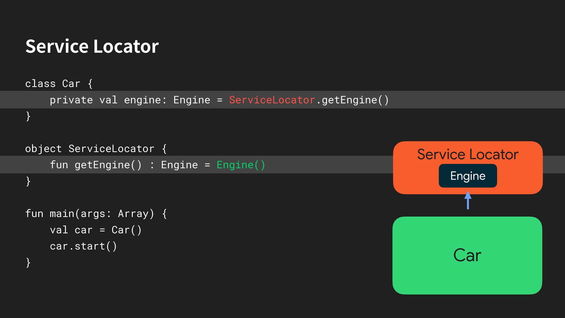 object ServiceLocator { fun getEngine() : Engine = Engine() } fun main(args: Array) { val car = Car() car.start() } Service Locator Engine Car Service Locator