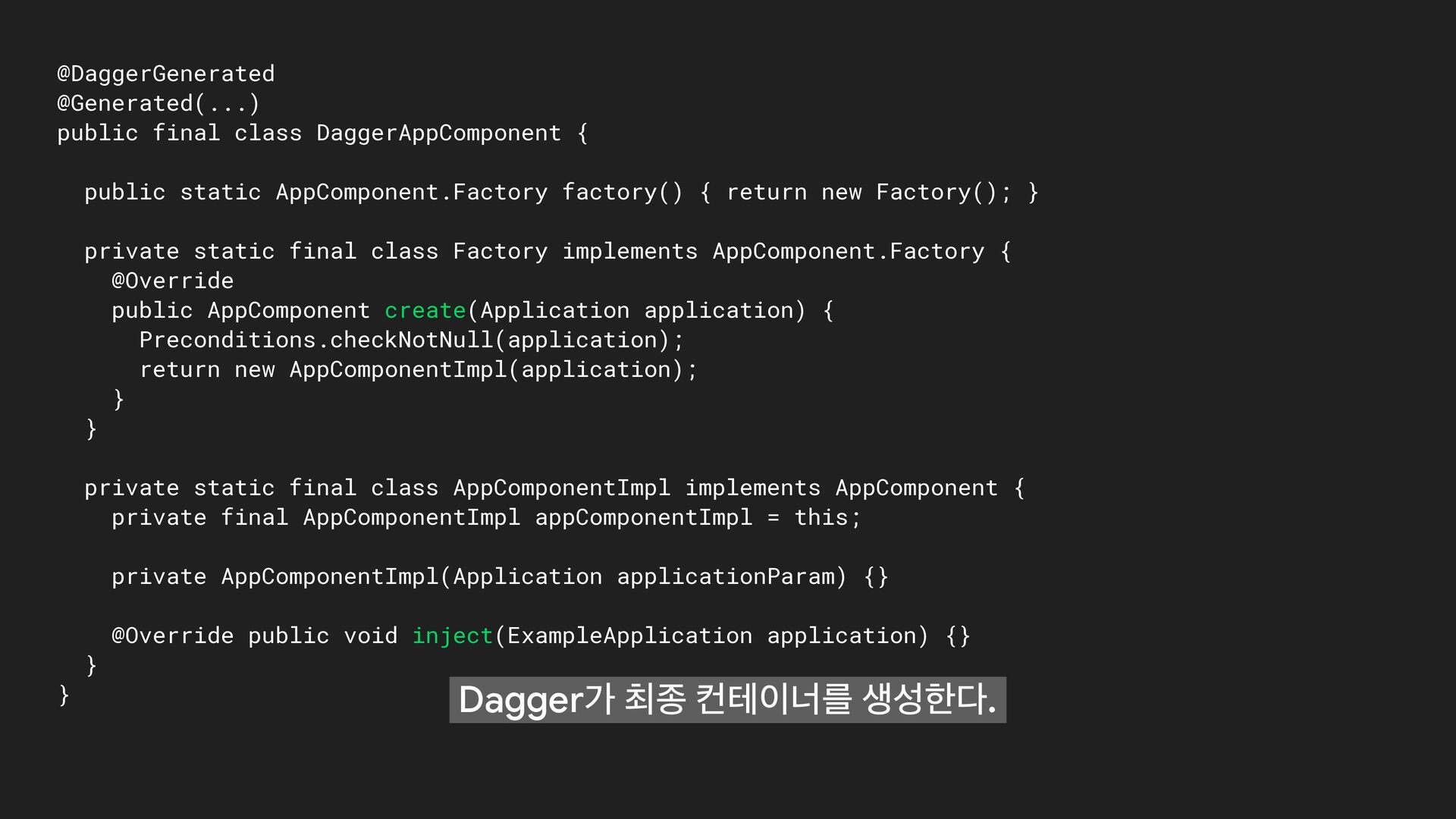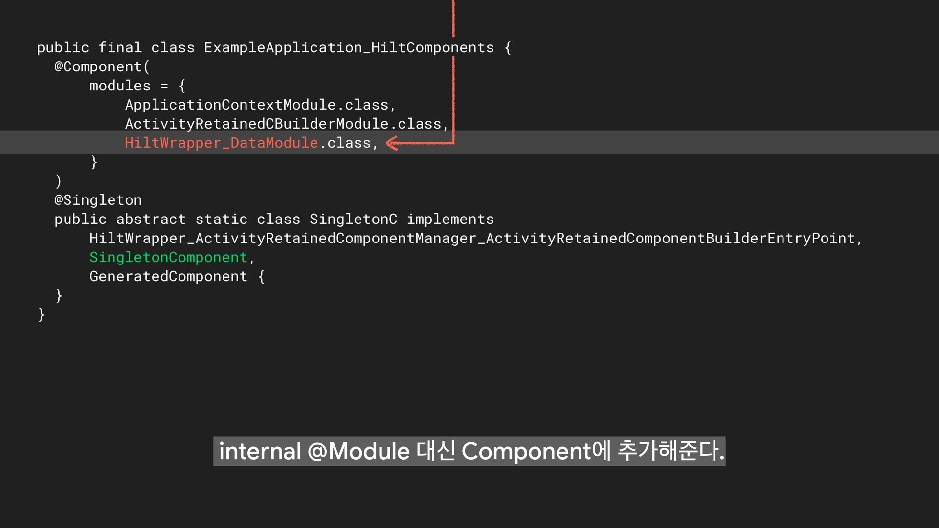 } // -------------------------------------------------------------------------------- public final class ExampleApplication_HiltComponents { @Component(modules = { ... }) @Singleton public abstract static class SingletonC implements HiltWrapper_ActivityRetainedComponentManager_ActivityRetainedComponentBuilderEntryPoint, SingletonComponent, GeneratedComponent, ExampleApplication_GeneratedInjector { } } // -------------------------------------------------------------------------------- public final class DaggerExampleApplication_HiltComponents_SingletonC { private static final class SingletonCImpl extends SingletonC { public void injectExampleApplication(ExampleApplication instance) { } }