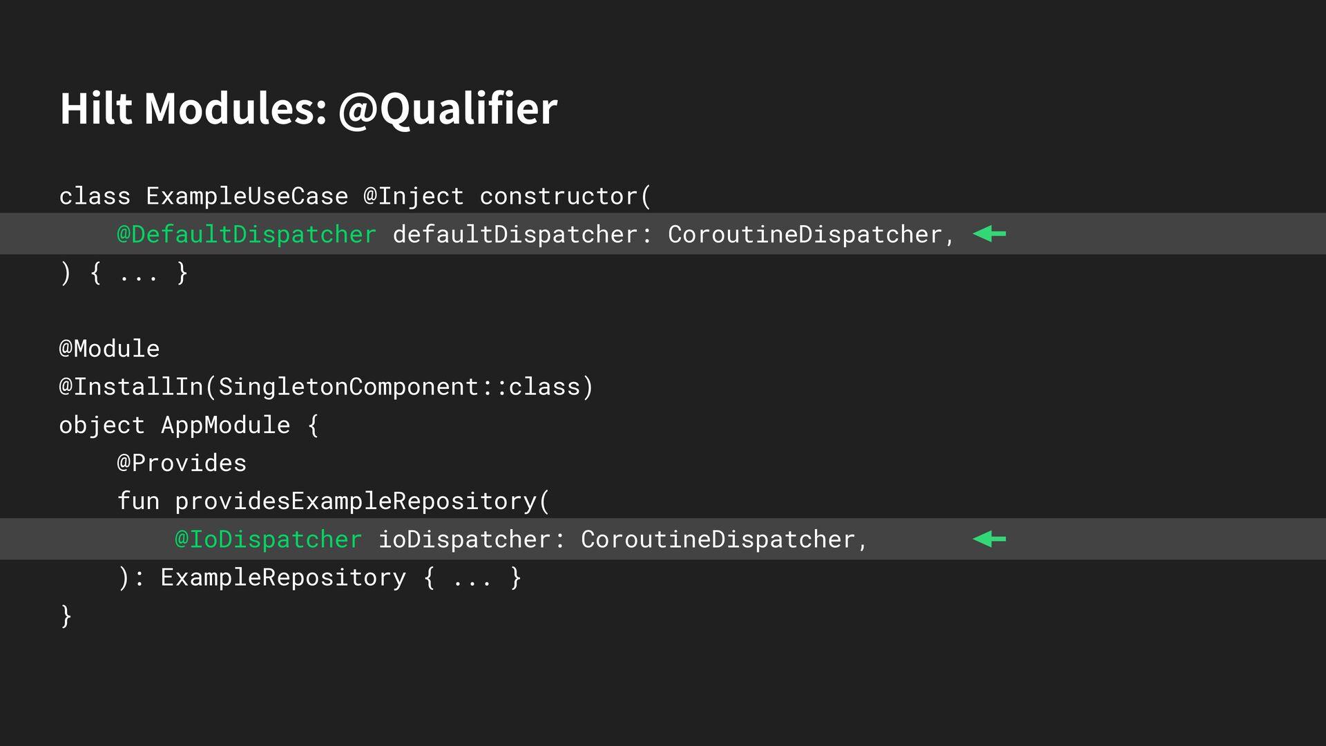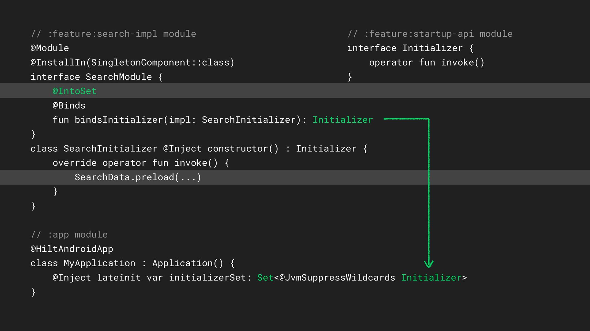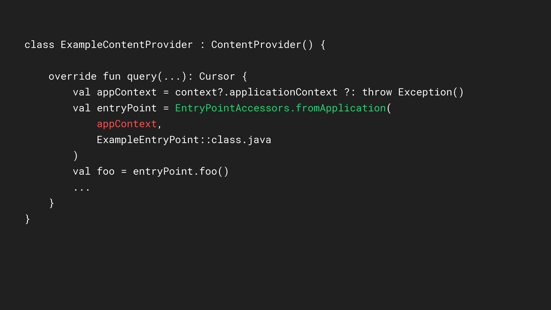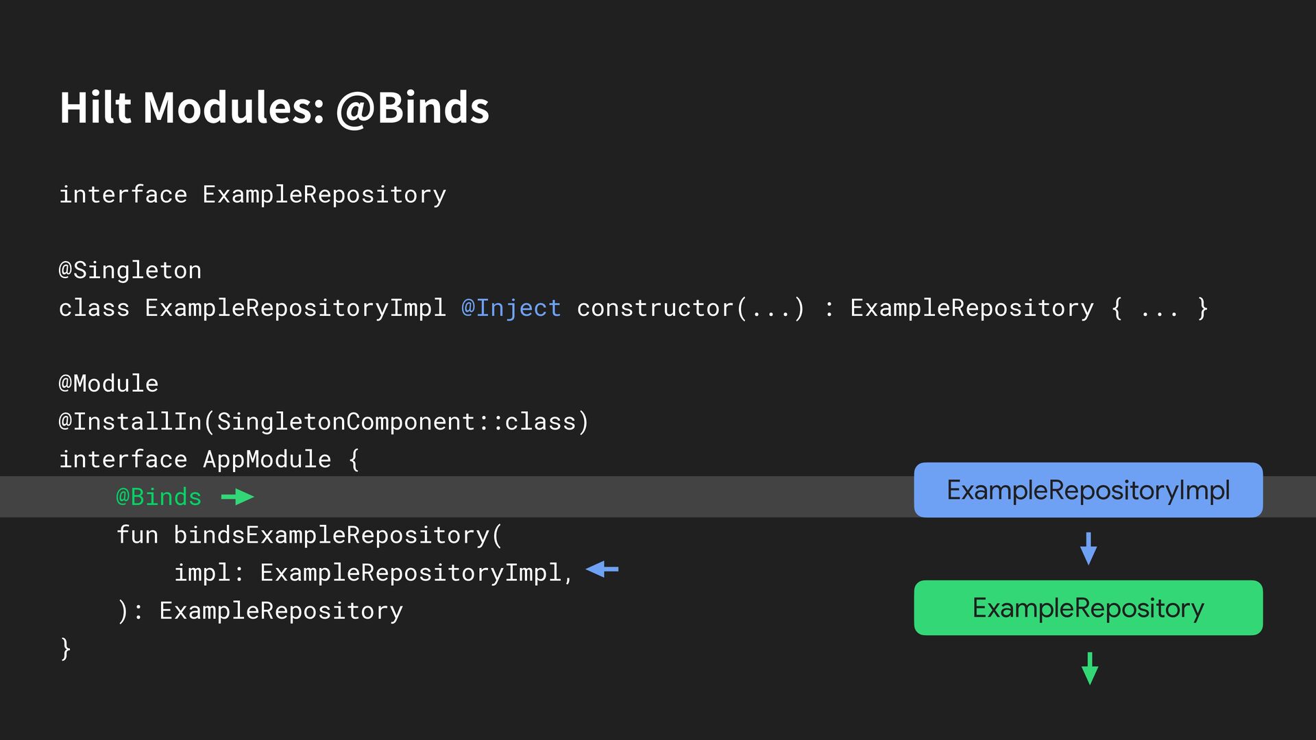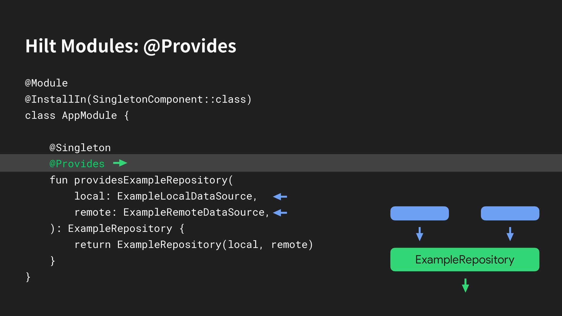 @Inject lateinit var bar: Bar } @Module @InstallIn(SingletonComponent::class) object FooModule { @Provides fun provideBar(): Bar = Bar() } Hilt_ExampleApplication.java ExampleApplication_GeneratedInjector.java ExampleApplication_MembersInjector.java