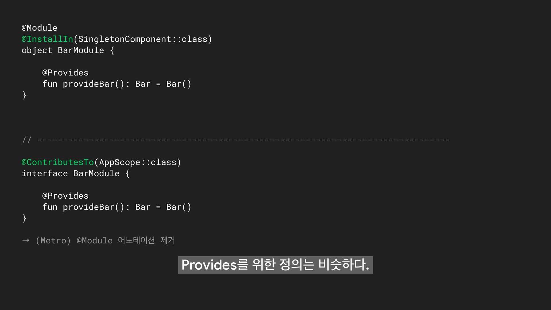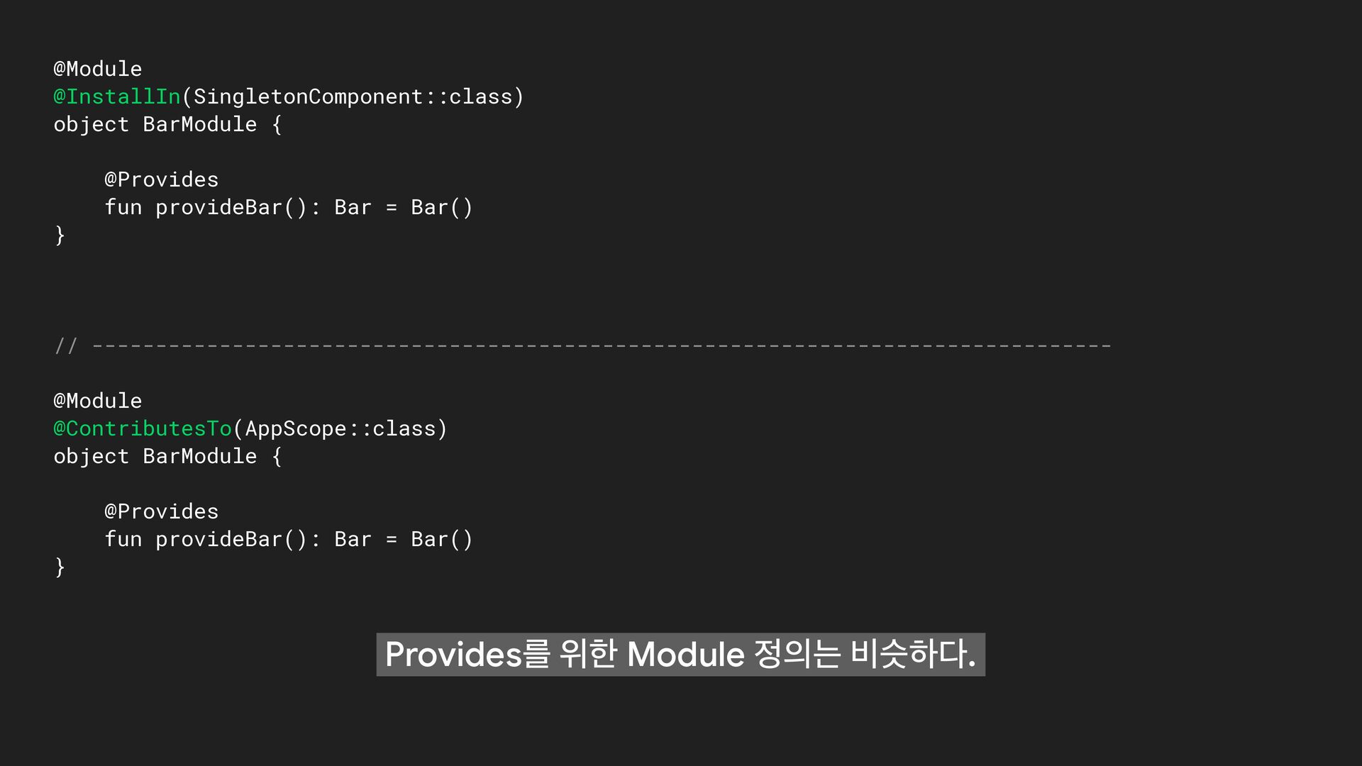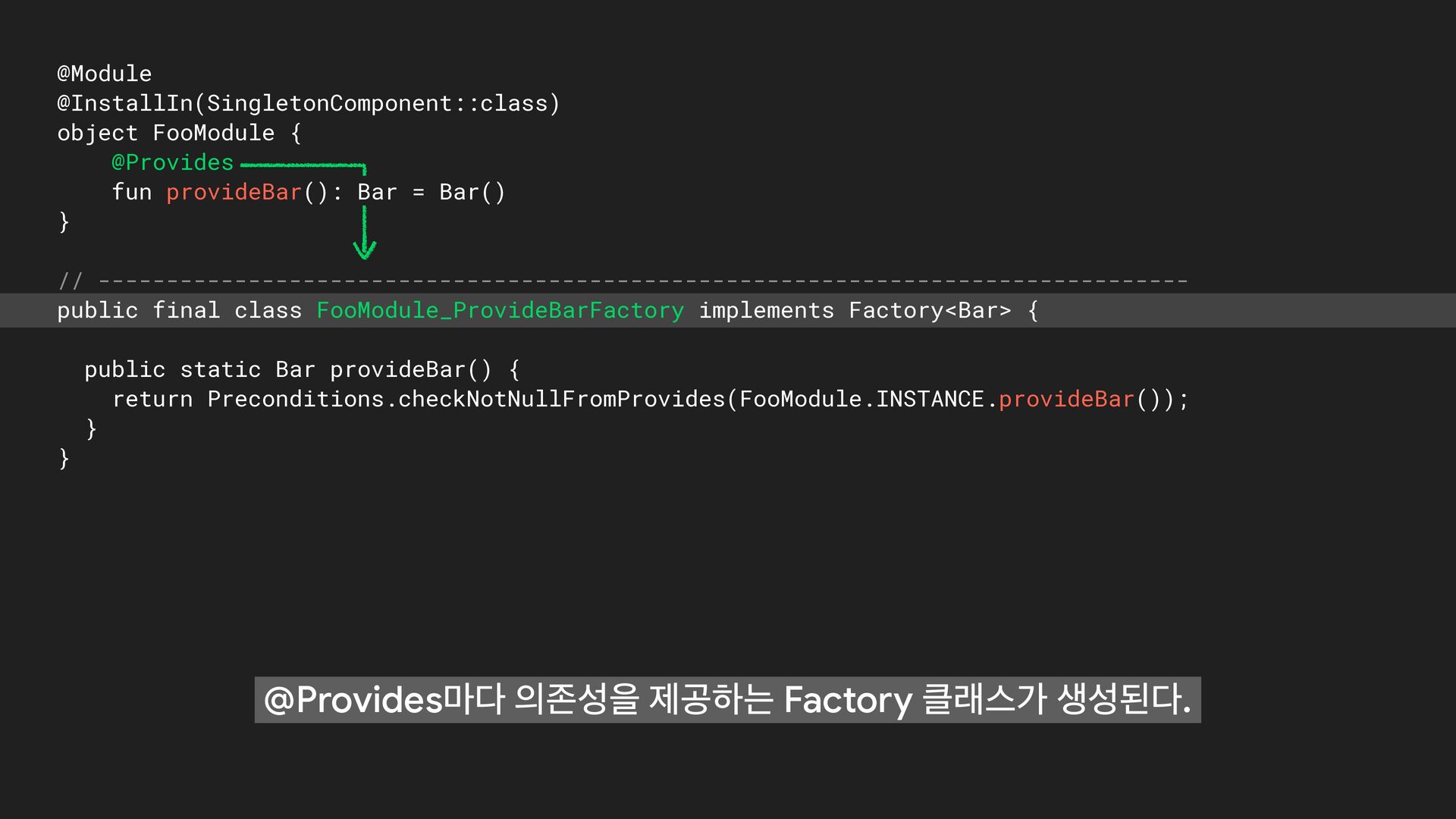 { @Provides fun provideBar(): Bar = Bar() } // -------------------------------------------------------------------------------- public final class FooModule_ProvideBarFactory implements Factory<Bar> { public static Bar provideBar() { return Preconditions.checkNotNullFromProvides(FooModule.INSTANCE.provideBar()); } }