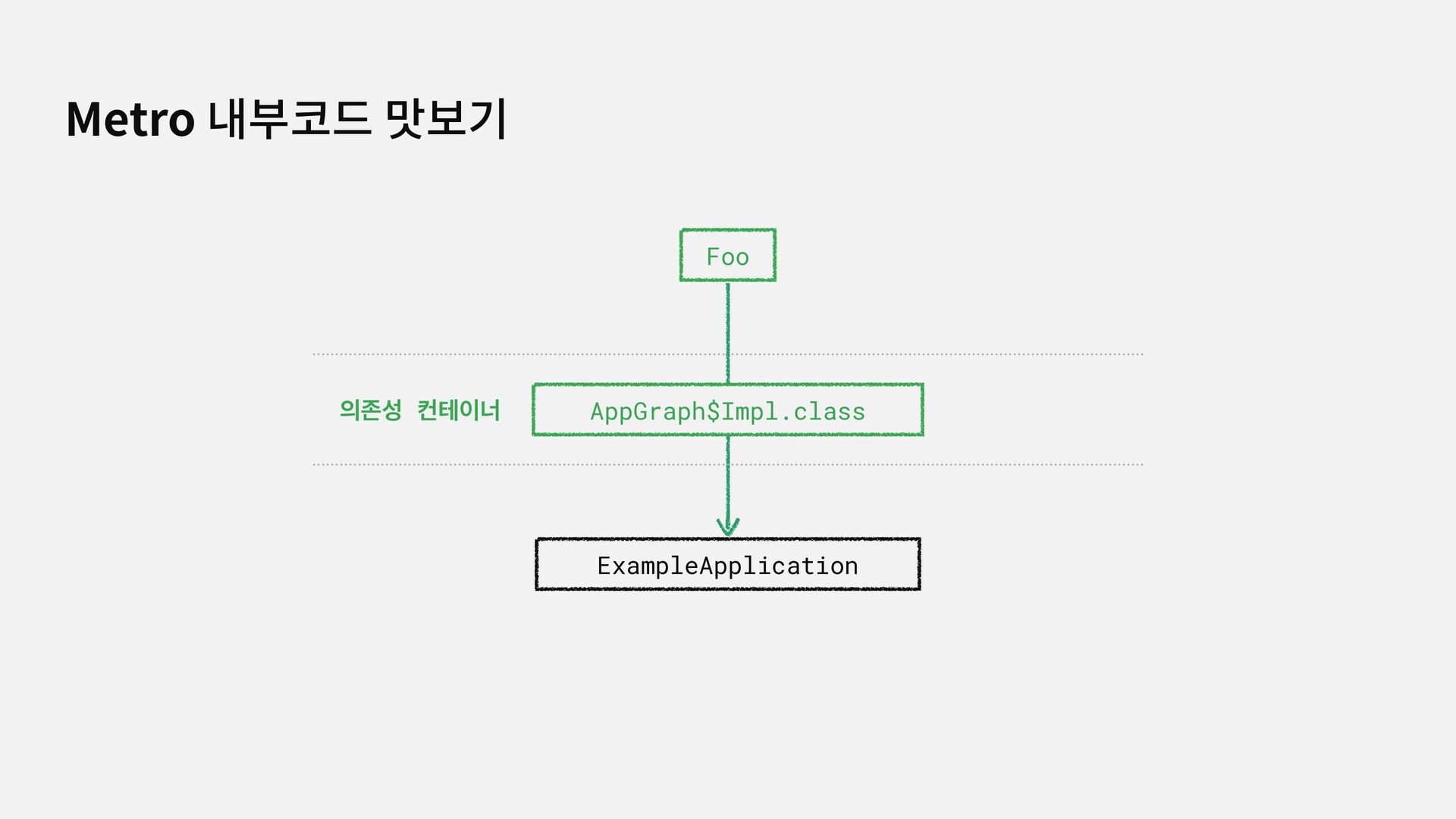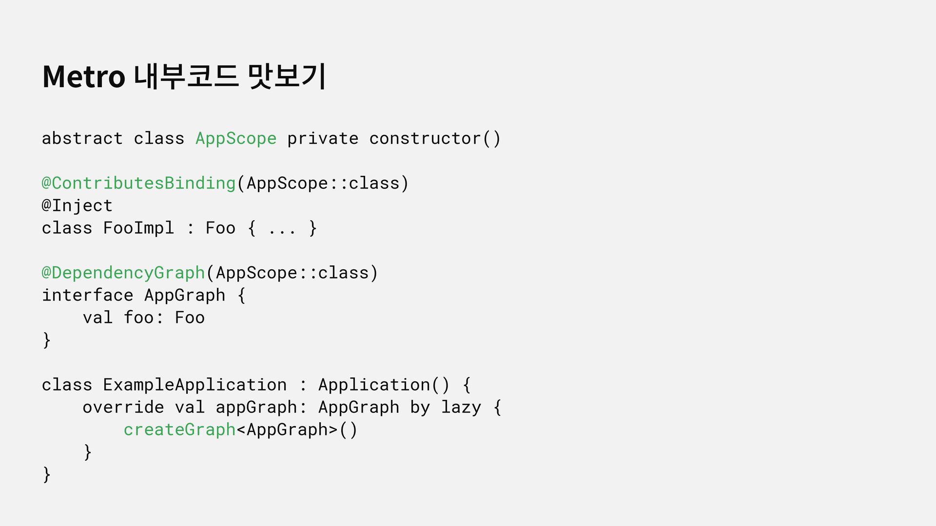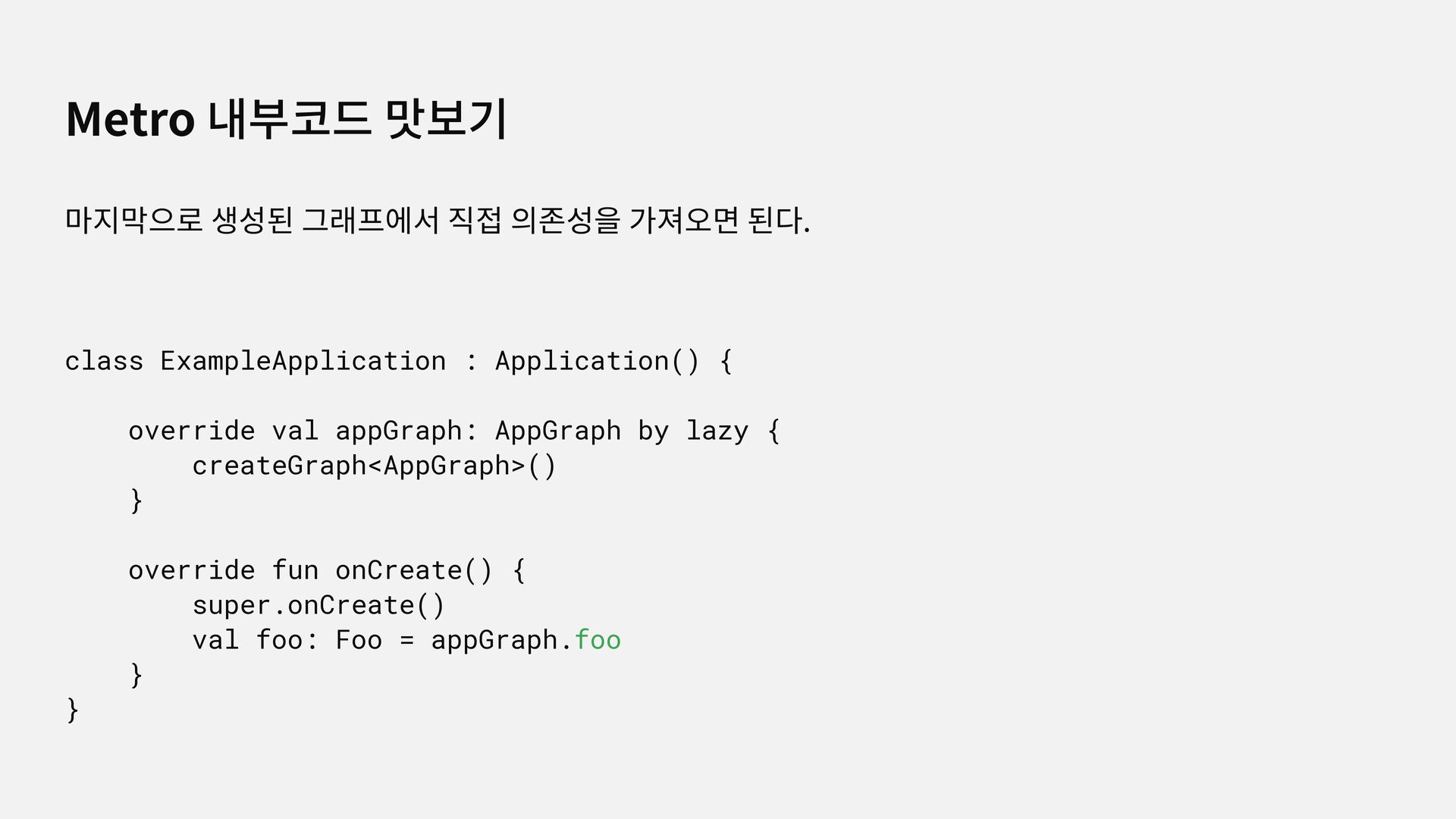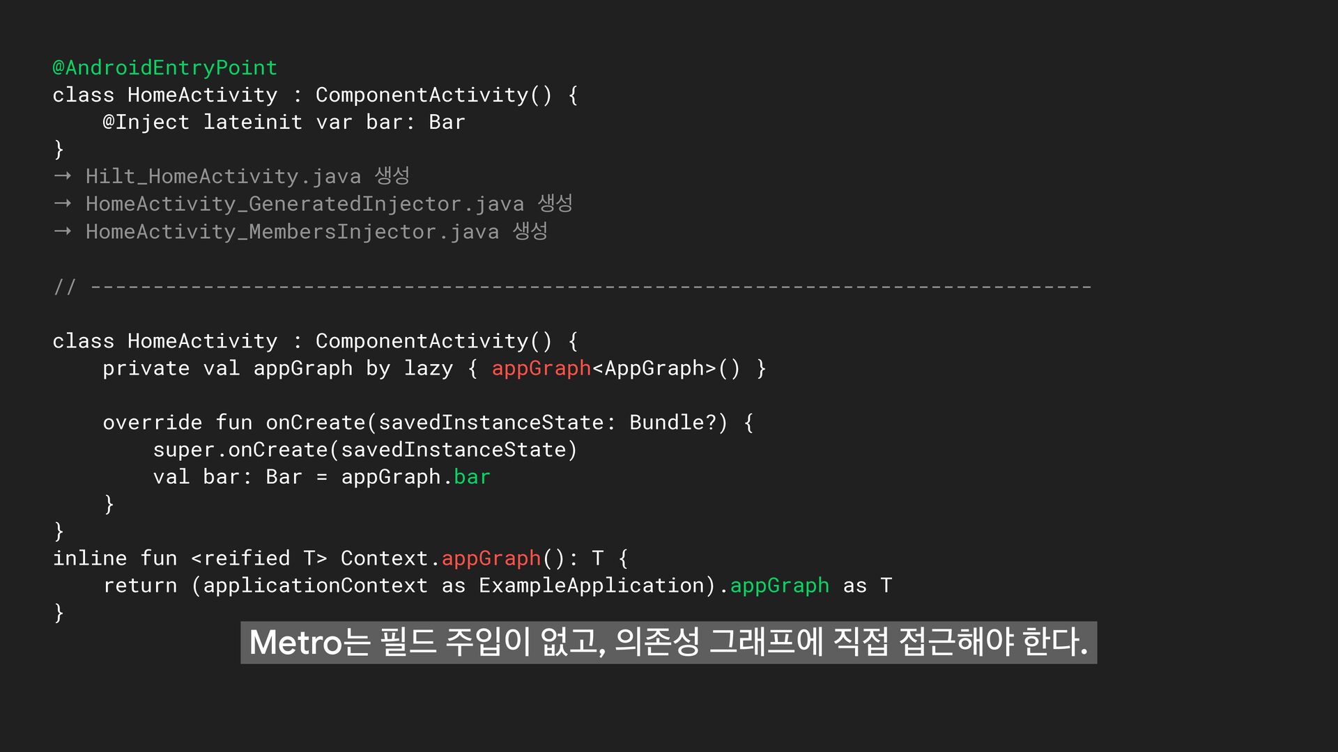 Bar } → Hilt_HomeActivity.java ࢤࢿ → HomeActivity_GeneratedInjector.java ࢤࢿ → HomeActivity_MembersInjector.java ࢤࢿ // -------------------------------------------------------------------------------- class HomeActivity : ComponentActivity() { private val appGraph by lazy { appGraph<AppGraph>() } override fun onCreate(savedInstanceState: Bundle?) { super.onCreate(savedInstanceState) val bar: Bar = appGraph.bar } } inline fun <reified T> Context.appGraph(): T { return (applicationContext as ExampleApplication).appGraph as T } Metroח ٘ ੑ হҊ, ઓࢿ Ӓېী Ӕ೧ঠ ೠ.