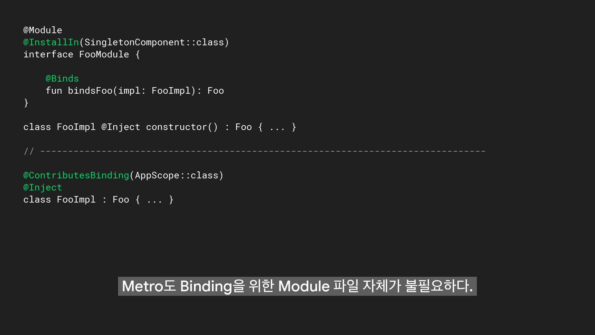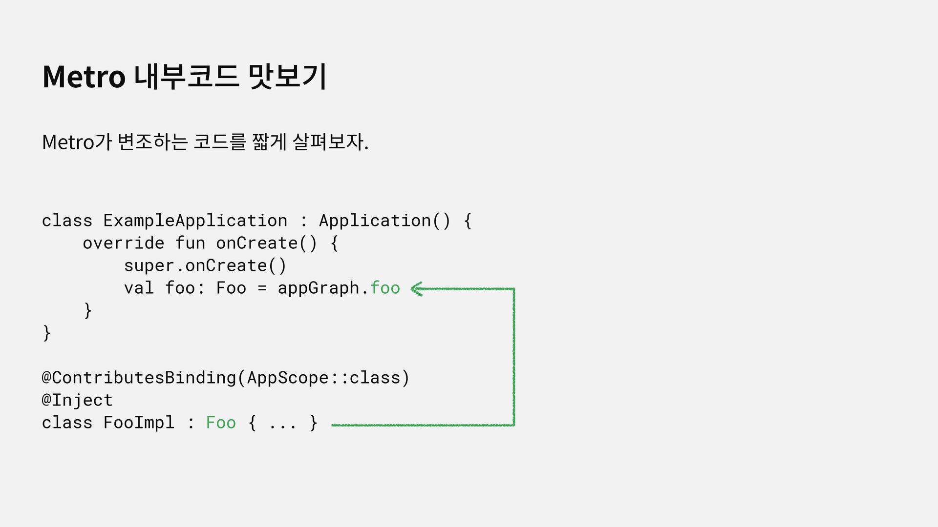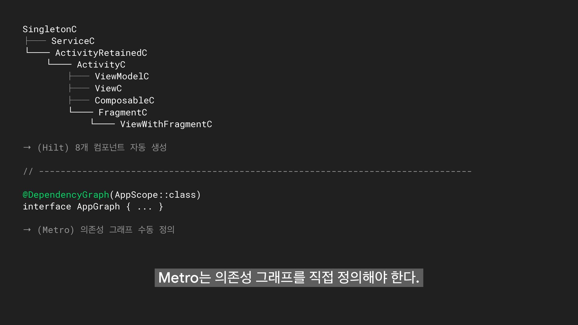 Bar } → Hilt_HomeActivity.java ࢤࢿ → HomeActivity_GeneratedInjector.java ࢤࢿ → HomeActivity_MembersInjector.java ࢤࢿ // -------------------------------------------------------------------------------- class HomeActivity : ComponentActivity() { private val appGraph by lazy { appGraph<AppGraph>() } override fun onCreate(savedInstanceState: Bundle?) { super.onCreate(savedInstanceState) val bar: Bar = appGraph.bar } } inline fun <reified T> Context.appGraph(): T { return (applicationContext as ExampleApplication).appGraph as T } Metroח ٘ ੑ হҊ, ઓࢿ Ӓېী Ӕ೧ঠ ೠ.