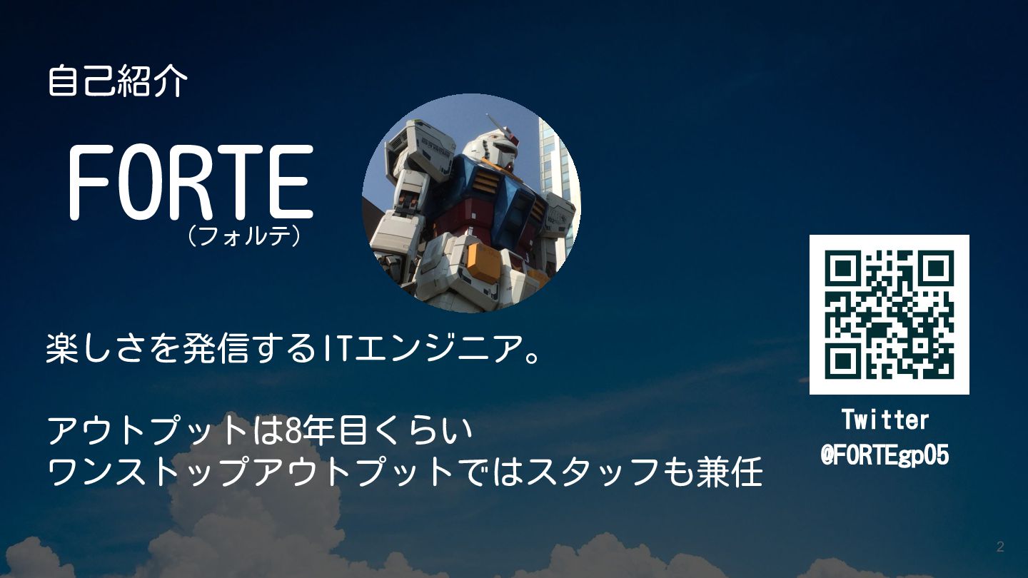 自己紹介 FORTE (フォルテ) 楽しさを発信するITエンジニア。 アウトプットは8年目くらい ワンストップアウトプットではスタッフも兼任 2 Twitter @FORTEgp05