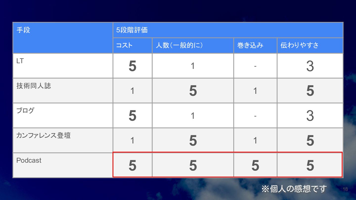- 3 技術同人誌 1 5 1 5 ブログ 5 1 - 3 カンファレンス登壇 1 5 1 5 Podcast 5 5 5 5 ※個人の感想です