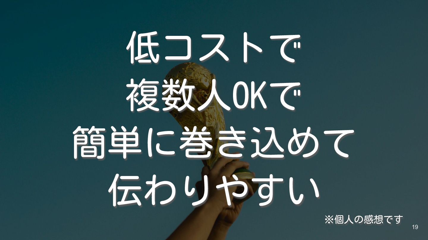 低コストで 複数人OKで 簡単に巻き込めて 伝わりやすい 19 ※個人の感想です