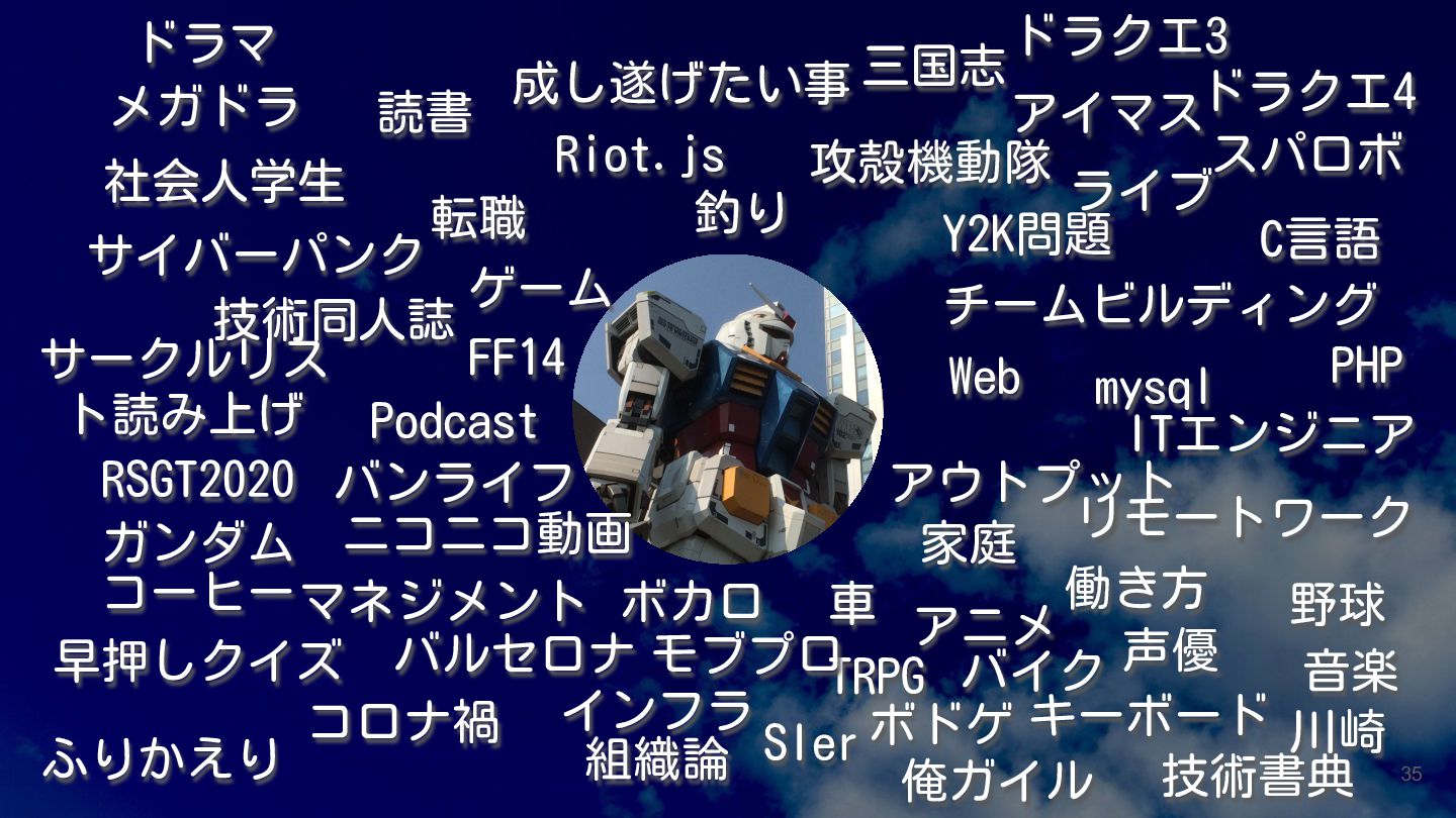 Y2K問題 チームビルディング ドラクエ3 ドラクエ4 スパロボ C言語 PHP Web mysql ITエンジニア アウトプット リモートワーク 家庭 働き方 野球 音楽 声優 アニメ バイク 川崎 技術書典 キーボード 俺ガイル ボドゲ TRPG 車 釣り SIer モブプロ 組織論 インフラ バルセロナ ボカロ ニコニコ動画 マネジメント バンライフ Podcast FF14 技術同人誌 サークルリス ト読み上げ サイバーパンク 社会人学生 メガドラ ドラマ RSGT2020 ガンダム コーヒー 早押しクイズ コロナ禍 ふりかえり