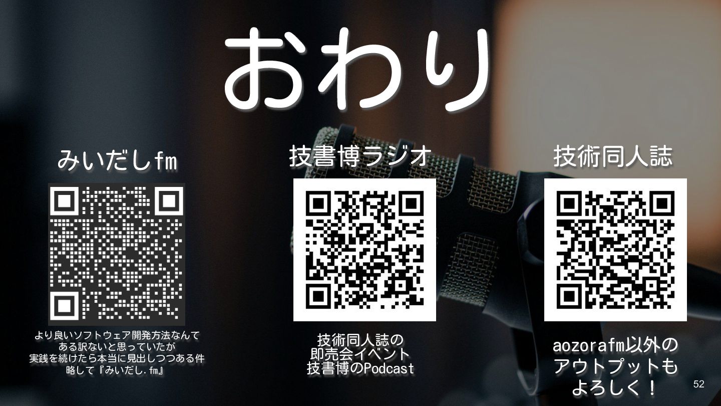 52 おわり 技書博ラジオ aozorafm以外の アウトプットも よろしく! みいだしfm より良いソフトウェア開発方法なんて ある訳ないと思っていたが 実践を続けたら本当に見出しつつある件
