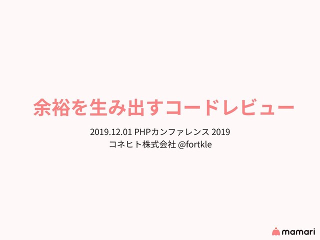 余裕を⽣み出すコードレビュー 2019.12.01 PHPカンファレンス 2019 コネヒト株式会社 @fortkle