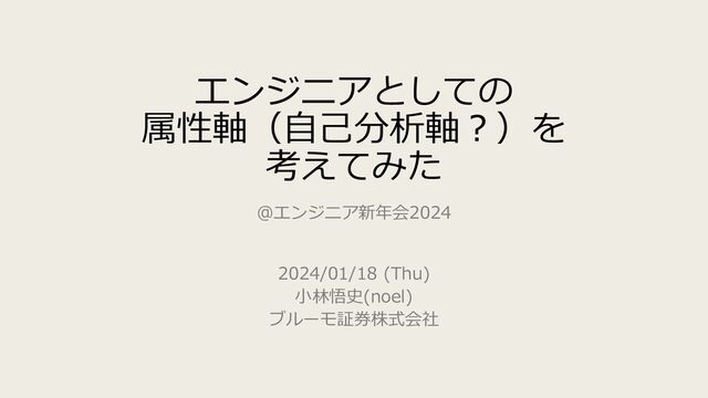 エンジニアとしての 属性軸(⾃⼰分析軸︖)を 考えてみた 2024/01/18 (Thu) ⼩林悟史(noel) ブルーモ証券株式会社 @エンジニア新年会2024