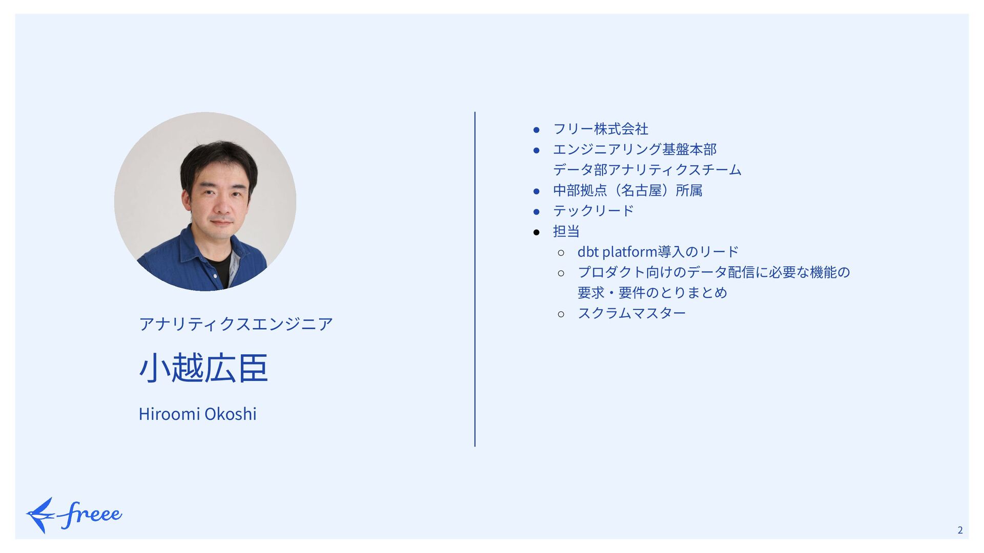 1.   2 ⼩越広⾂ • フリー株式会社 • エンジニアリング基盤本部 データ部アナリティクスチーム • 中部拠点(名古屋)所属