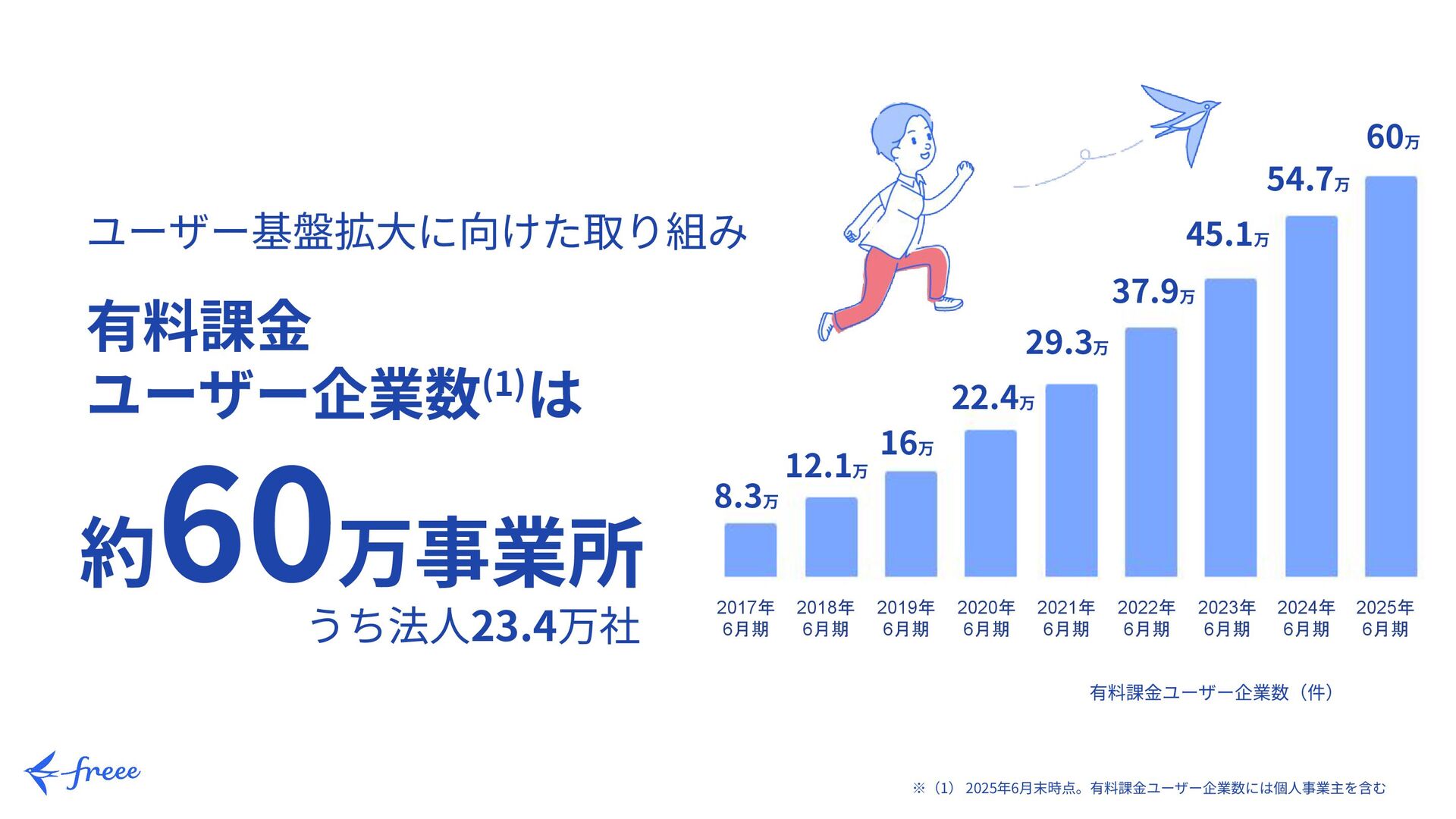 有料課⾦ユーザー企業数(件) 有料課⾦ ユーザー企業数(1)は 約 60万事業所 2022年 6月期 45.1万 2023年 6月期 ※(1) 2025年6⽉末時点。有料課⾦ユーザー企業数には個⼈事業主を含む 37.9万 29.3万 22.4万 16万 12.1万 8.3万 ユーザー基盤拡⼤に向けた取り組み 54.7万 2024年 6月期 うち法⼈23.4万社 60万 2025年 6月期