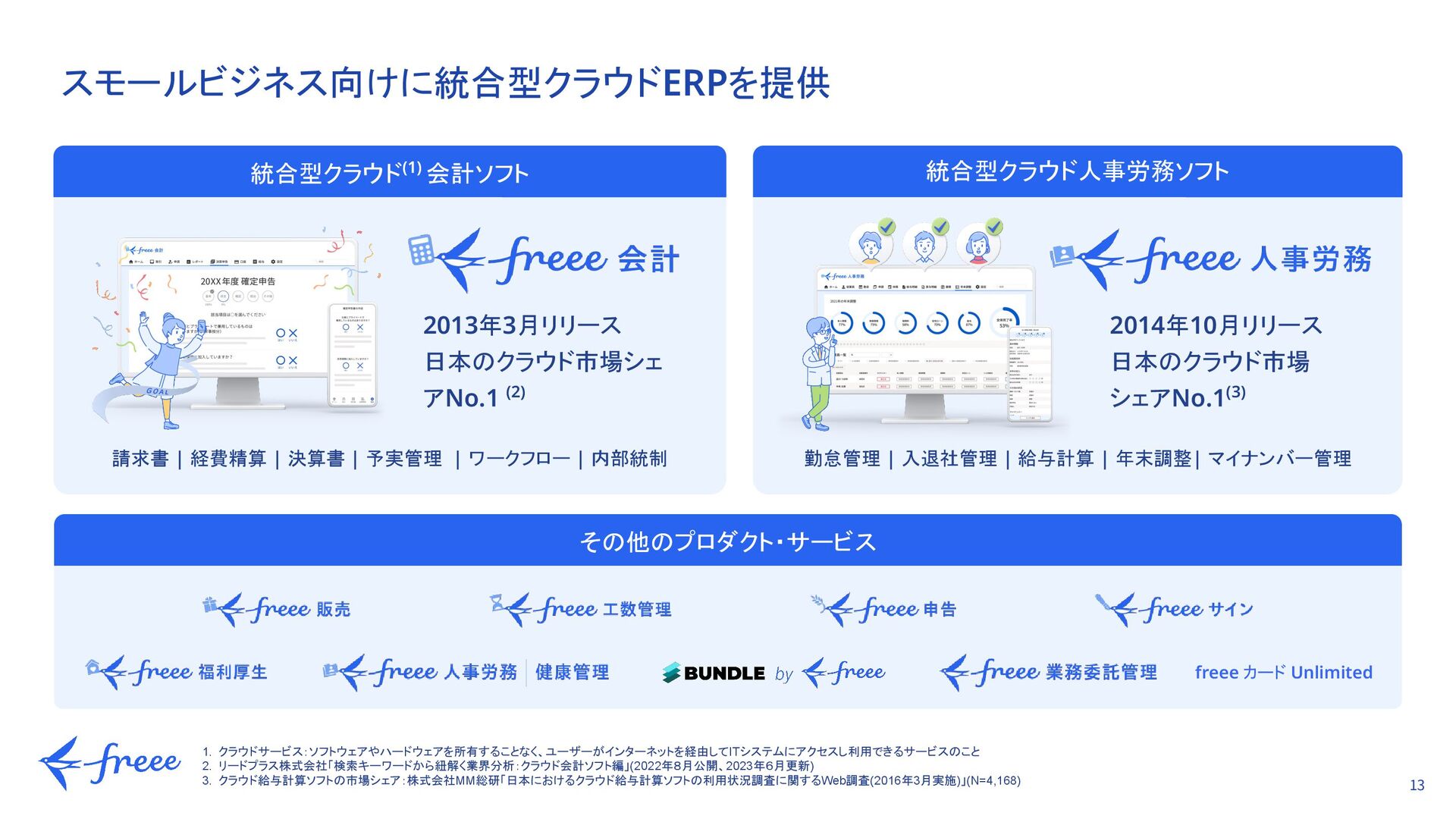 シェアNo.1(3) 1. クラウドサービス:ソフトウェアやハードウェアを所有することなく、ユーザーがインターネットを経由してITシステムにアクセスし利用できるサービスのこと 2. リードプラス株式会社「検索キーワードから紐解く業界分析:クラウド会計ソフト編」(2022年8月公開、2023年6月更新) 3. クラウド給与計算ソフトの市場シェア:株式会社MM総研「日本におけるクラウド給与計算ソフトの利用状況調査に関するWeb調査(2016年3月実施)」(N=4,168) freee カード Unlimited