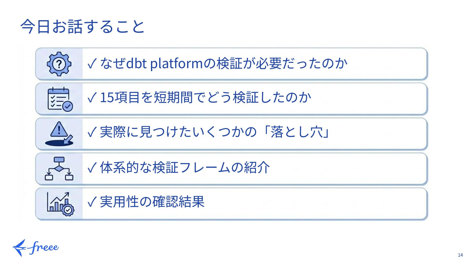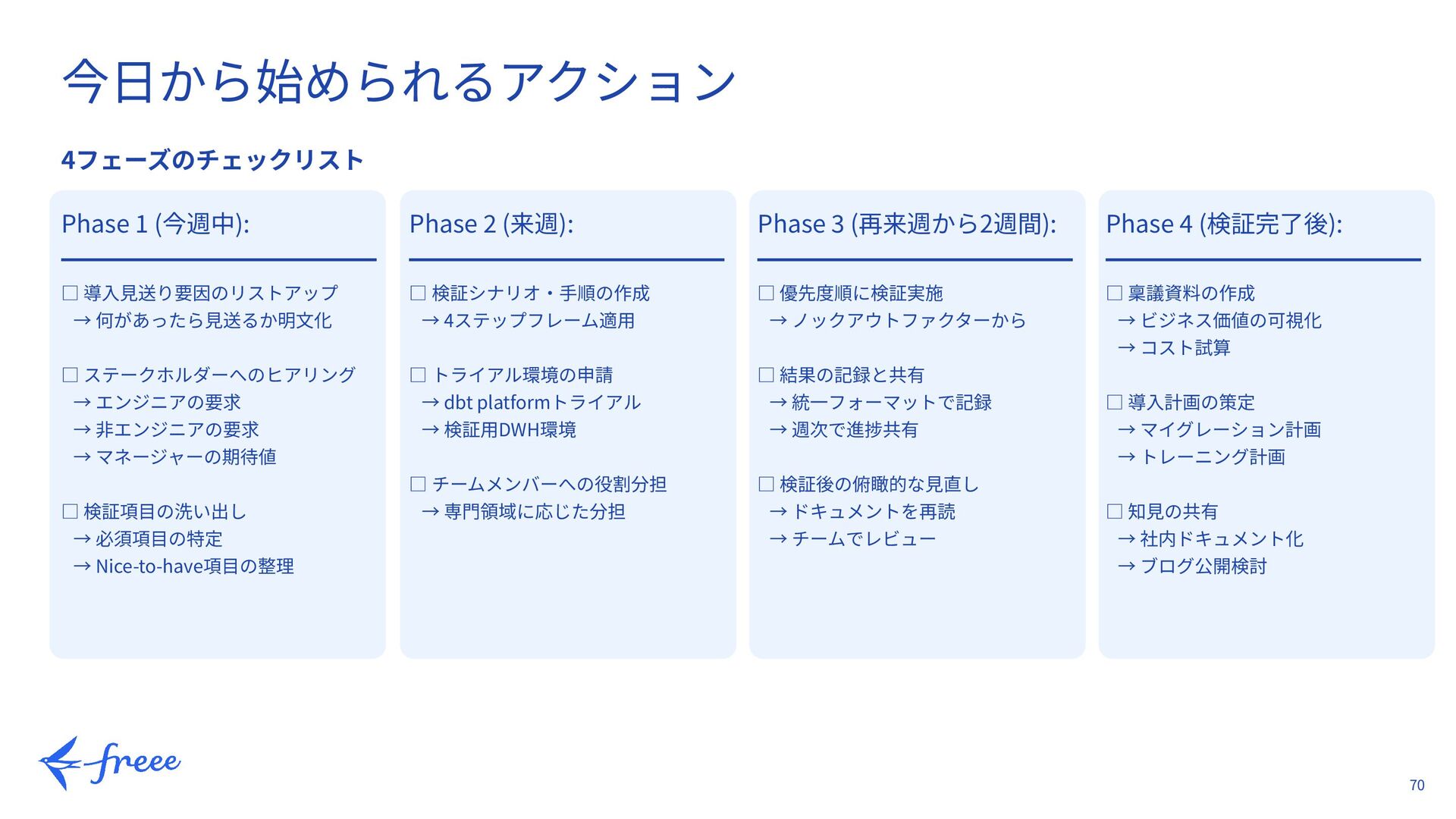 何があったら⾒送るか明⽂化 □ ステークホルダーへのヒアリング → エンジニアの要求 → ⾮エンジニアの要求 → マネージャーの期待値 □ 検証項⽬の洗い出し → 必須項⽬の特定 → Nice-to-have項⽬の整理 Phase 2 (来週): ━━━━━━━━━━━━━ □ 検証シナリオ‧⼿順の作成 → 4ステップフレーム適⽤ □ トライアル環境の申請 → dbt platformトライアル → 検証⽤DWH環境 □ チームメンバーへの役割分担 → 専⾨領域に応じた分担 Phase 3 (再来週から2週間): ━━━━━━━━━━━━━ □ 優先度順に検証実施 → ノックアウトファクターから □ 結果の記録と共有 → 統⼀フォーマットで記録 → 週次で進捗共有 □ 検証後の俯瞰的な⾒直し → ドキュメントを再読 → チームでレビュー Phase 4 (検証完了後): ━━━━━━━━━━━━━ □ 稟議資料の作成 → ビジネス価値の可視化 → コスト試算 □ 導⼊計画の策定 → マイグレーション計画 → トレーニング計画 □ 知⾒の共有 → 社内ドキュメント化 → ブログ公開検討