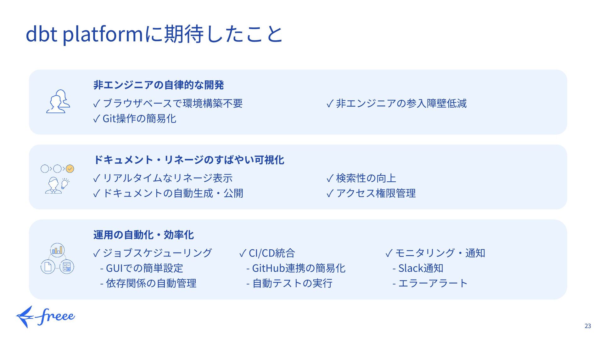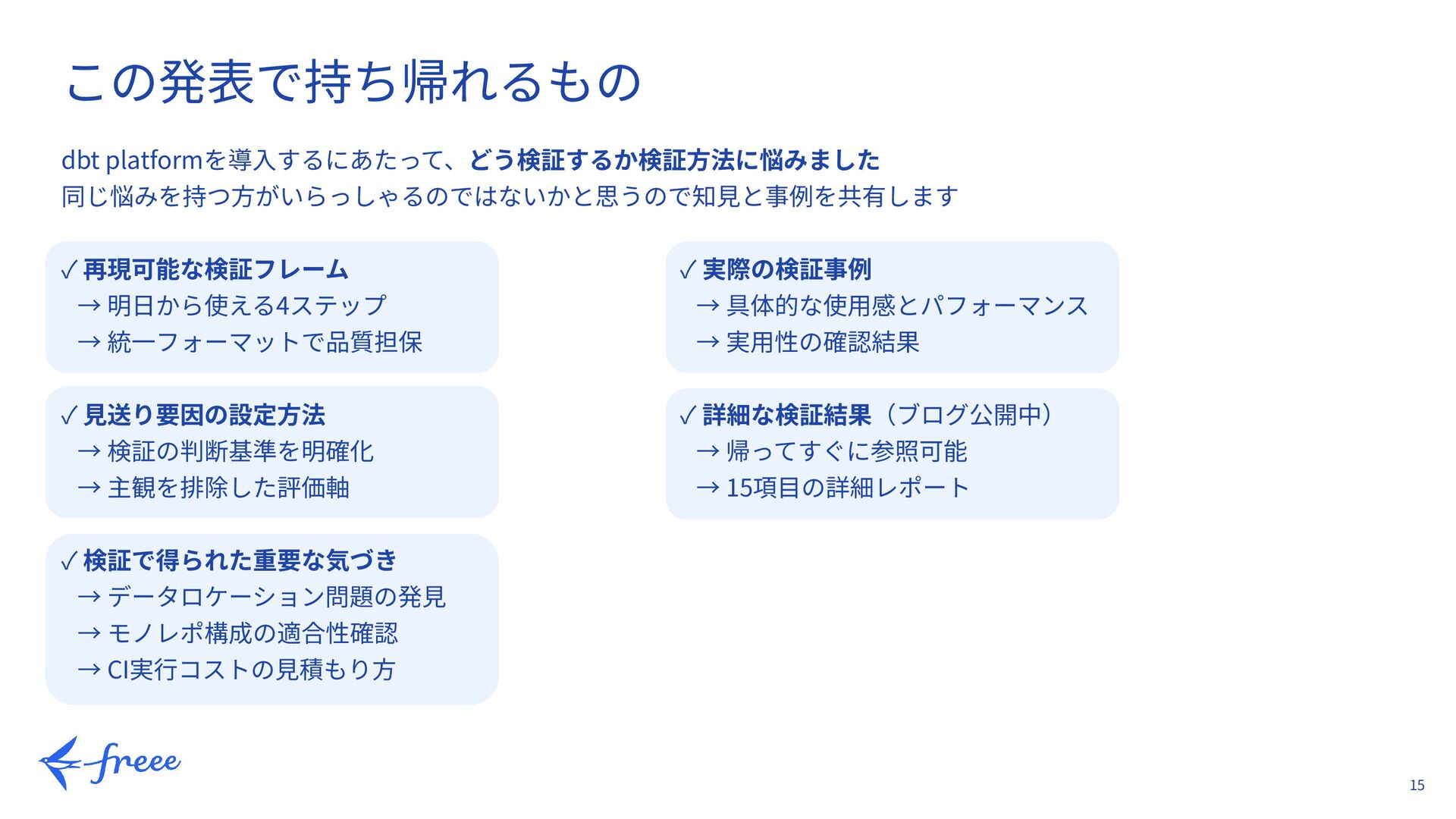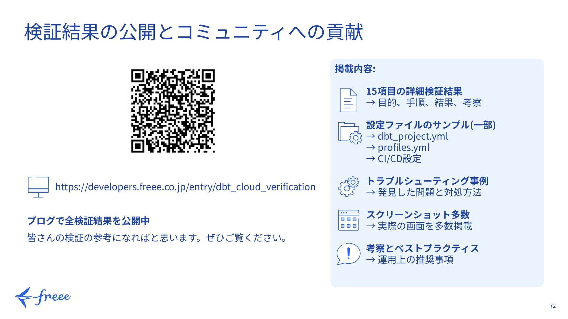 profiles.yml → CI/CD設定 トラブルシューティング事例 → 発⾒した問題と対処⽅法 スクリーンショット多数 → 実際の画⾯を多数掲載 考察とベストプラクティス → 運⽤上の推奨事項 https://developers.freee.co.jp/entry/dbt_cloud_verification ブログで全検証結果を公開中 皆さんの検証の参考になればと思います。ぜひご覧ください。