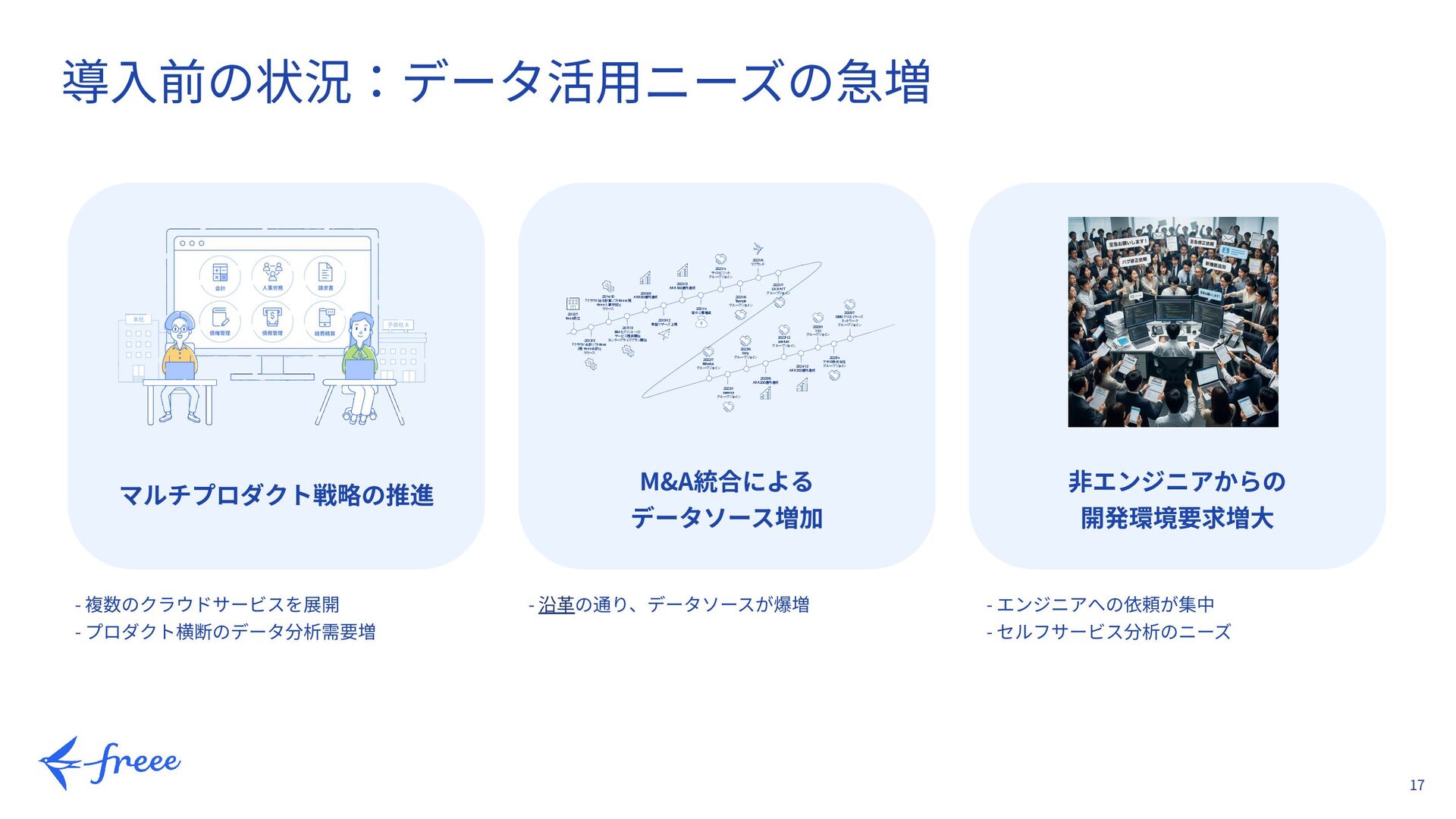 「クラウド会計ソフトfreee (現・freee会計)」 リリース 2014/10 「クラウド給与計算ソフトfreee(現 ・freee人事労務)」 リリース 2017/3 Midセグメントへの サービス提供開始 エンタープライズプラン開始 2019/5 ARR50億円達成 2021/3 ARR100億円達成 2021/4 海外公募増資 2021/4 サイトビジット グループジョイン 2021/6 Taxnote グループジョイン 2021/6 リブランド 2022/7 Mikatus グループジョイン 2019/12 東証マザーズ上場 2023/1 sweeep グループジョイン 2023/6 Why グループジョイン 2023/6 ARR200億円達成 2023/12 pasture グループジョイン 2025/1 YUI グループジョイン 2024/12 ARR300億円達成 2025/4 アポロ株式会社 グループジョイン 2025/7 GMOクリエイターズ ネットワーク グループジョイン 2021/7 LiKHA-iT グループジョイン - 複数のクラウドサービスを展開 - プロダクト横断のデータ分析需要増 - 沿⾰の通り、データソースが爆増 - エンジニアへの依頼が集中 - セルフサービス分析のニーズ
