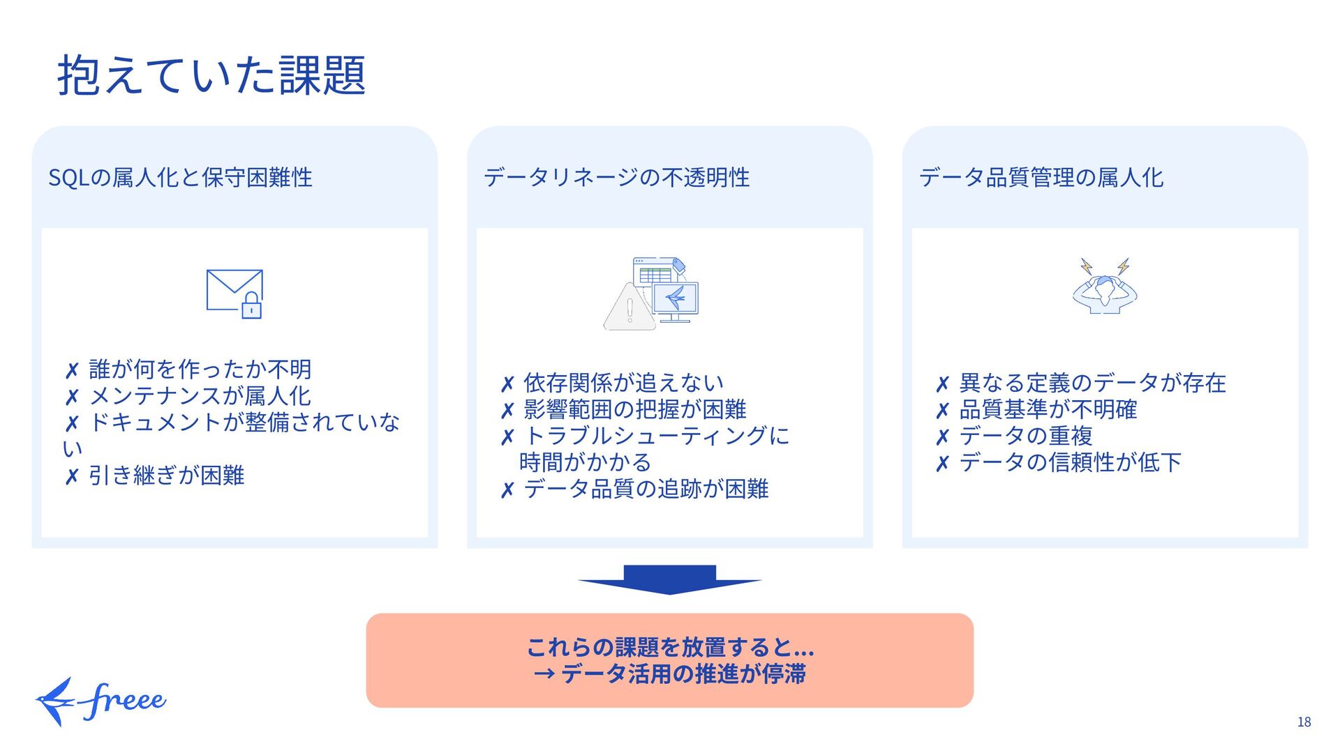 8. 17 導⼊前の状況:データ活⽤ニーズの急増 マルチプロダクト戦略の推進 M&A統合による データソース増加 ⾮エンジニアからの 開発環境要求増⼤ 2012/7 freee設立 2013/3