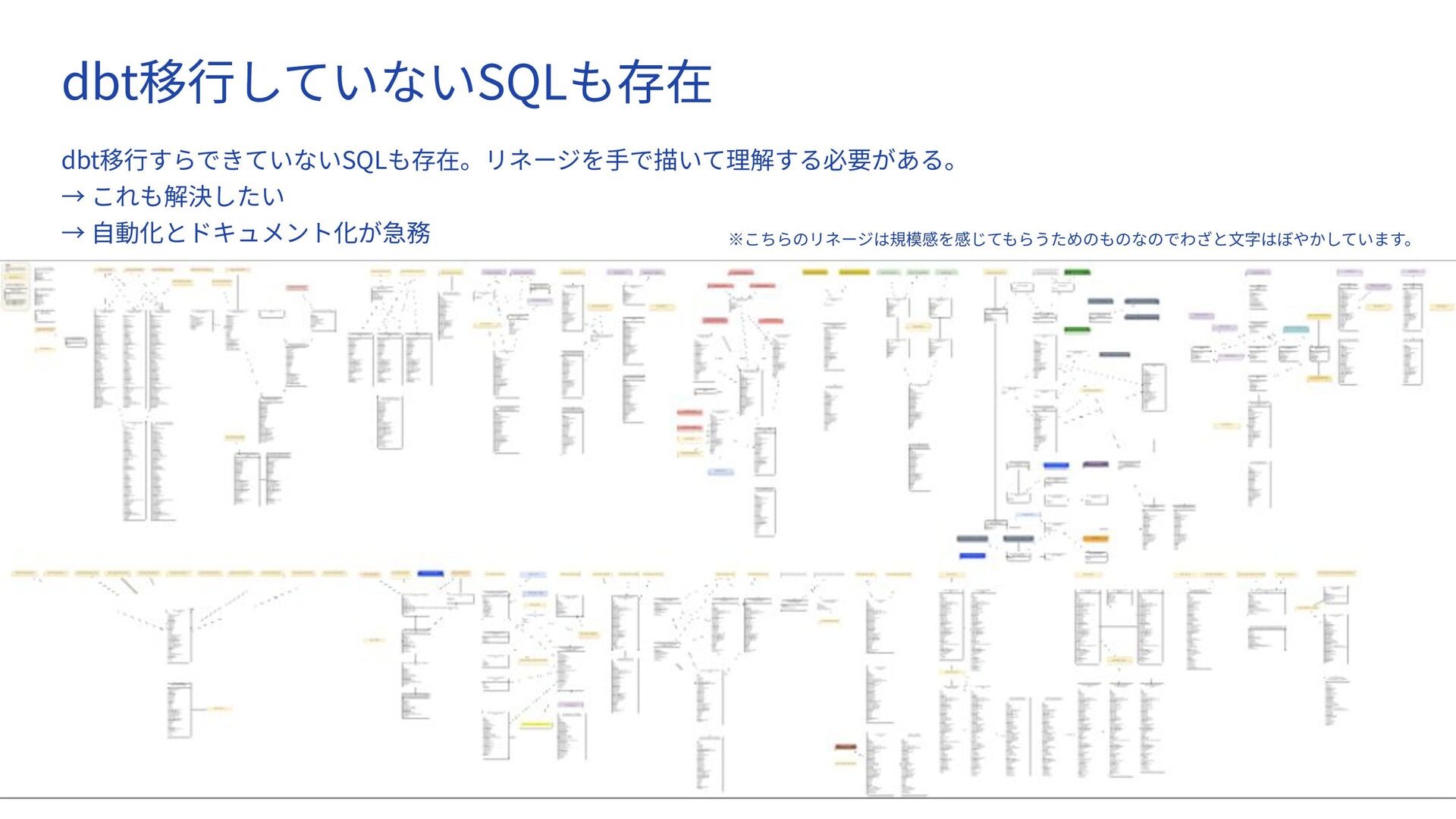 データ品質の追跡が困難 データリネージの不透明性 ✗ 異なる定義のデータが存在 ✗ 品質基準が不明確 ✗ データの重複 ✗ データの信頼性が低下 データ品質管理の属⼈化 ✗ 誰が何を作ったか不明 ✗ メンテナンスが属⼈化 ✗ ドキュメントが整備されていな い ✗ 引き継ぎが困難 SQLの属⼈化と保守困難性 これらの課題を放置すると... → データ活⽤の推進が停滞