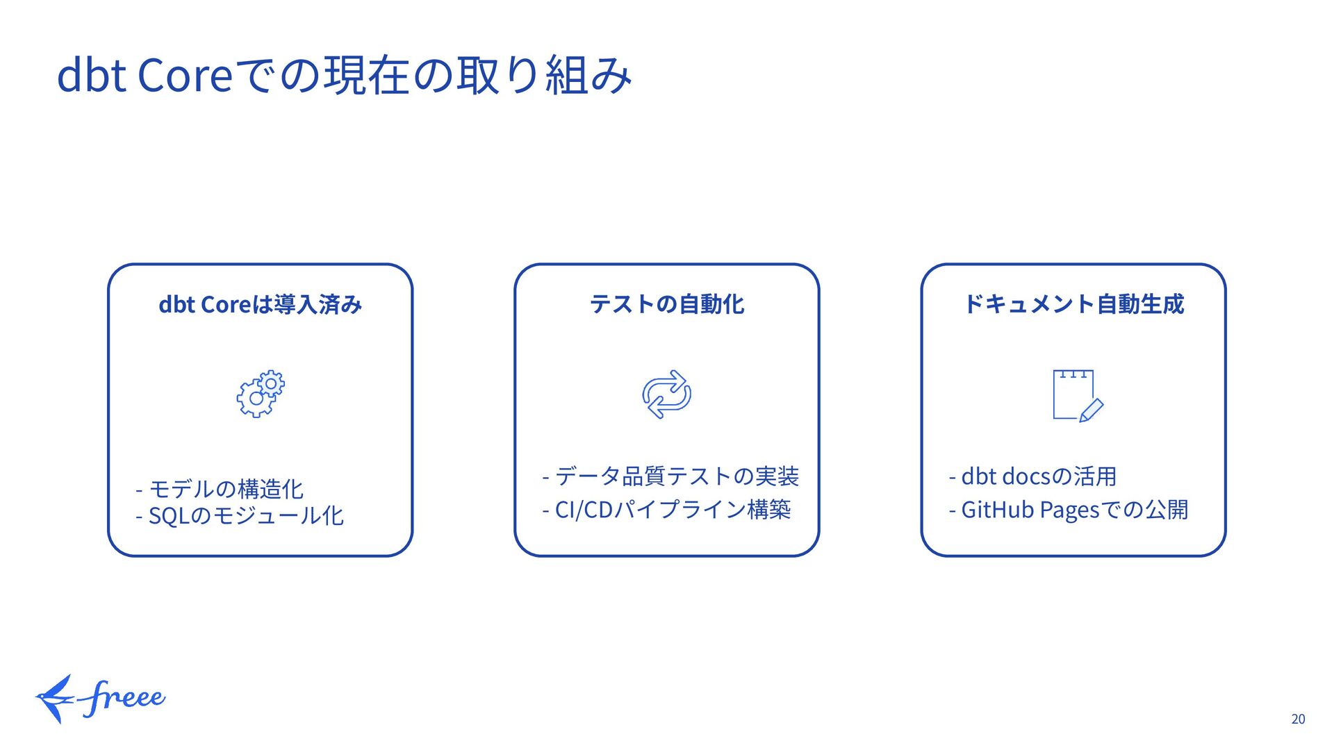 10. 20 dbt Coreでの現在の取り組み dbt Coreは導⼊済み - モデルの構造化 - SQLのモジュール化 テストの⾃動化