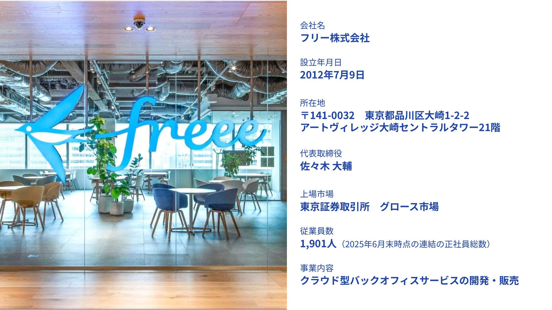 2. 会社名 フリー株式会社 設⽴年⽉⽇ 2012年7⽉9⽇ 所在地 〒141-0032 東京都品川区⼤崎1-2-2 アートヴィレッジ⼤崎セントラルタワー21階 代表取締役 佐々⽊ ⼤輔