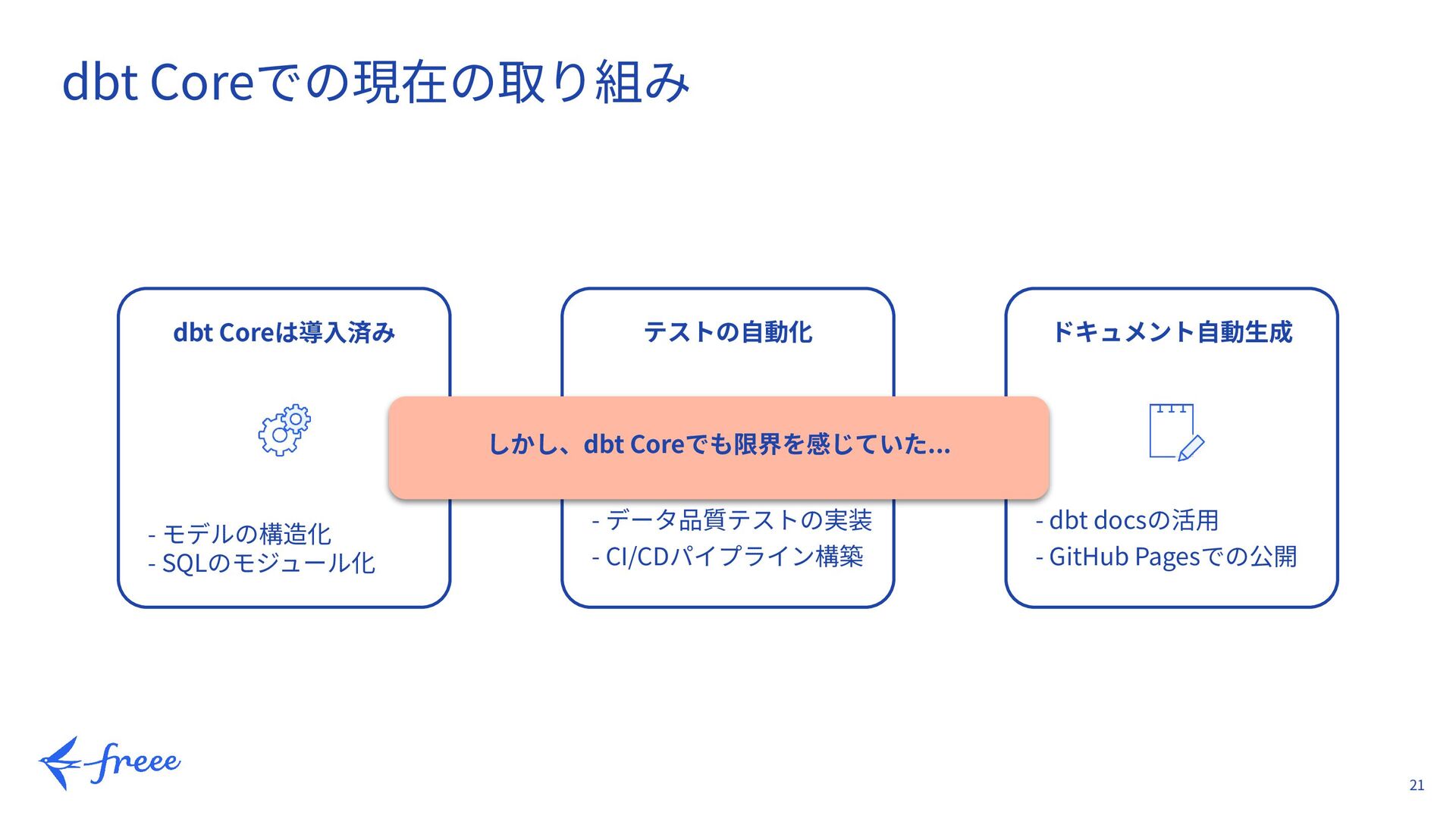 11. 21 dbt Coreでの現在の取り組み dbt Coreは導⼊済み - モデルの構造化 - SQLのモジュール化 テストの⾃動化