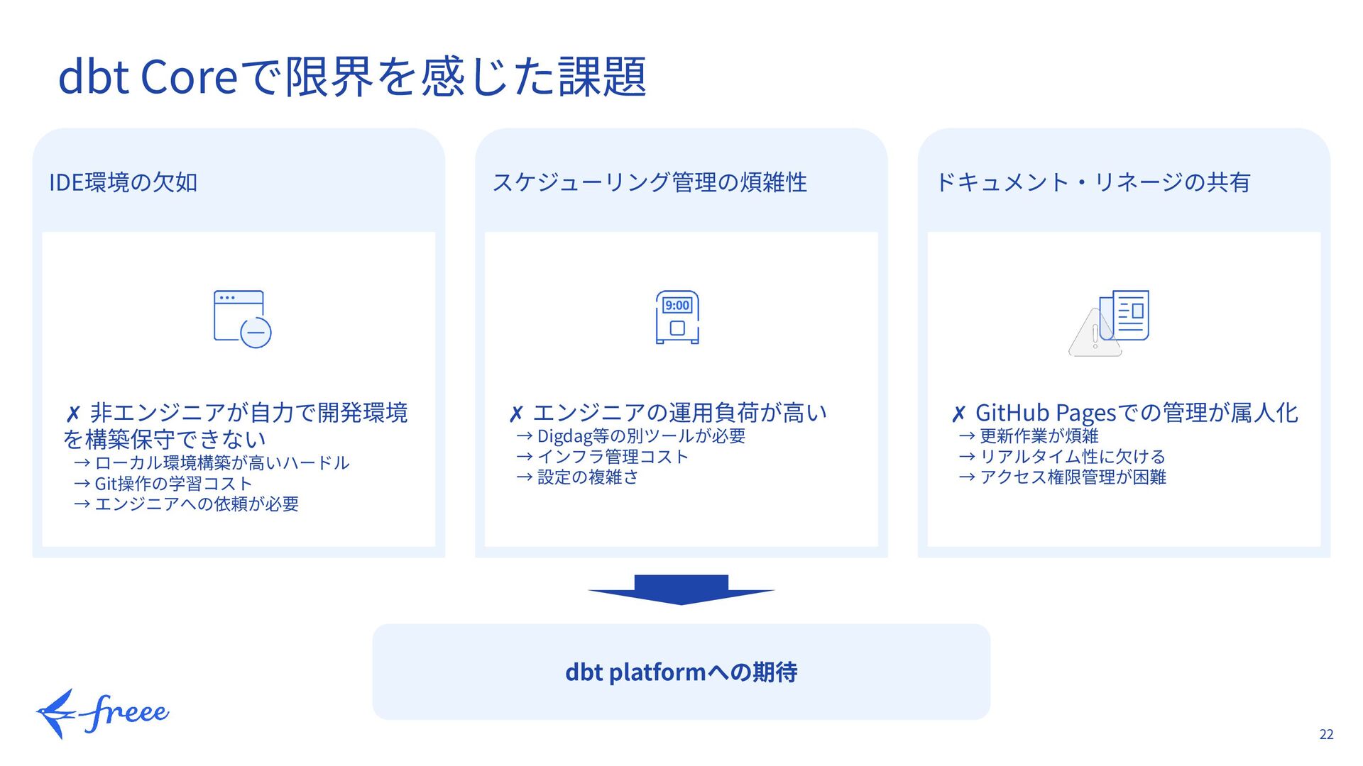 12. 22 dbt Coreで限界を感じた課題 ✗ エンジニアの運⽤負荷が⾼い → Digdag等の別ツールが必要 → インフラ管理コスト →