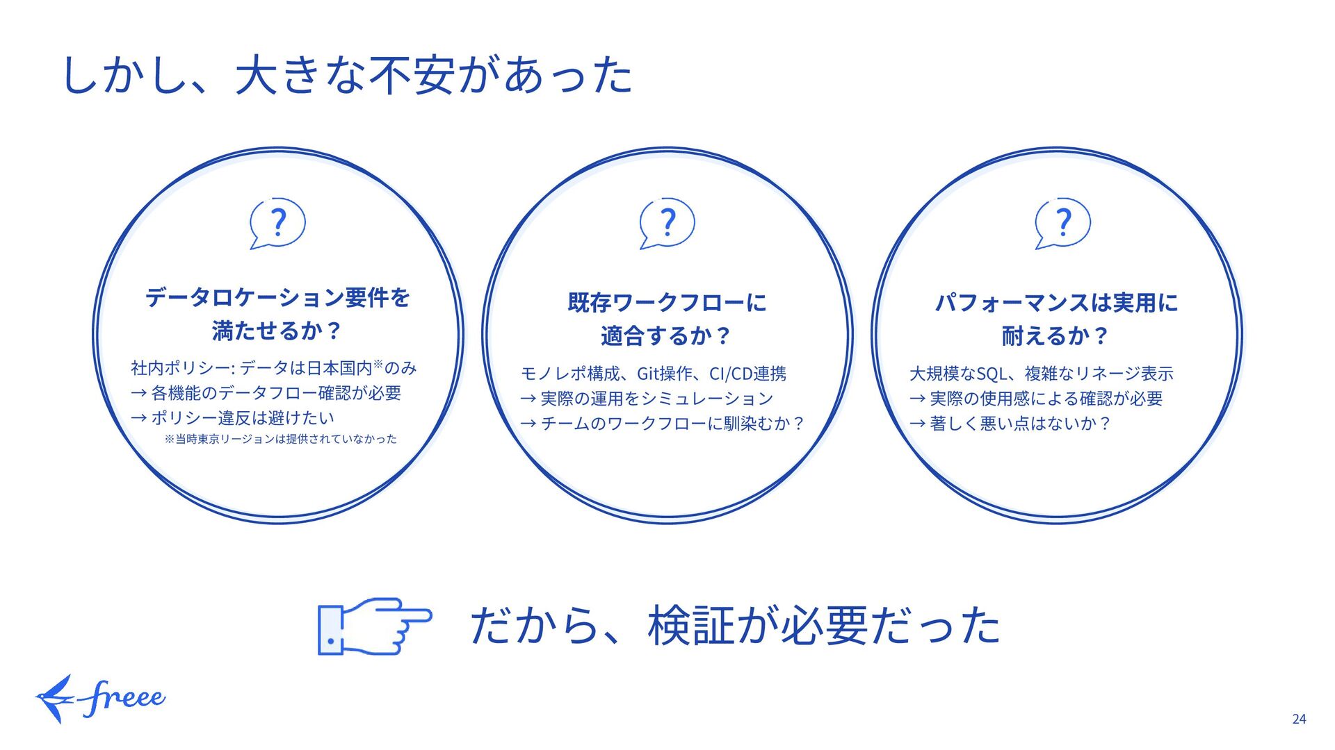 ※当時東京リージョンは提供されていなかった 既存ワークフローに 適合するか? モノレポ構成、Git操作、CI/CD連携 → 実際の運⽤をシミュレーション → チームのワークフローに馴染むか? パフォーマンスは実⽤に 耐えるか? ⼤規模なSQL、複雑なリネージ表⽰ → 実際の使⽤感による確認が必要 → 著しく悪い点はないか? だから、検証が必要だった