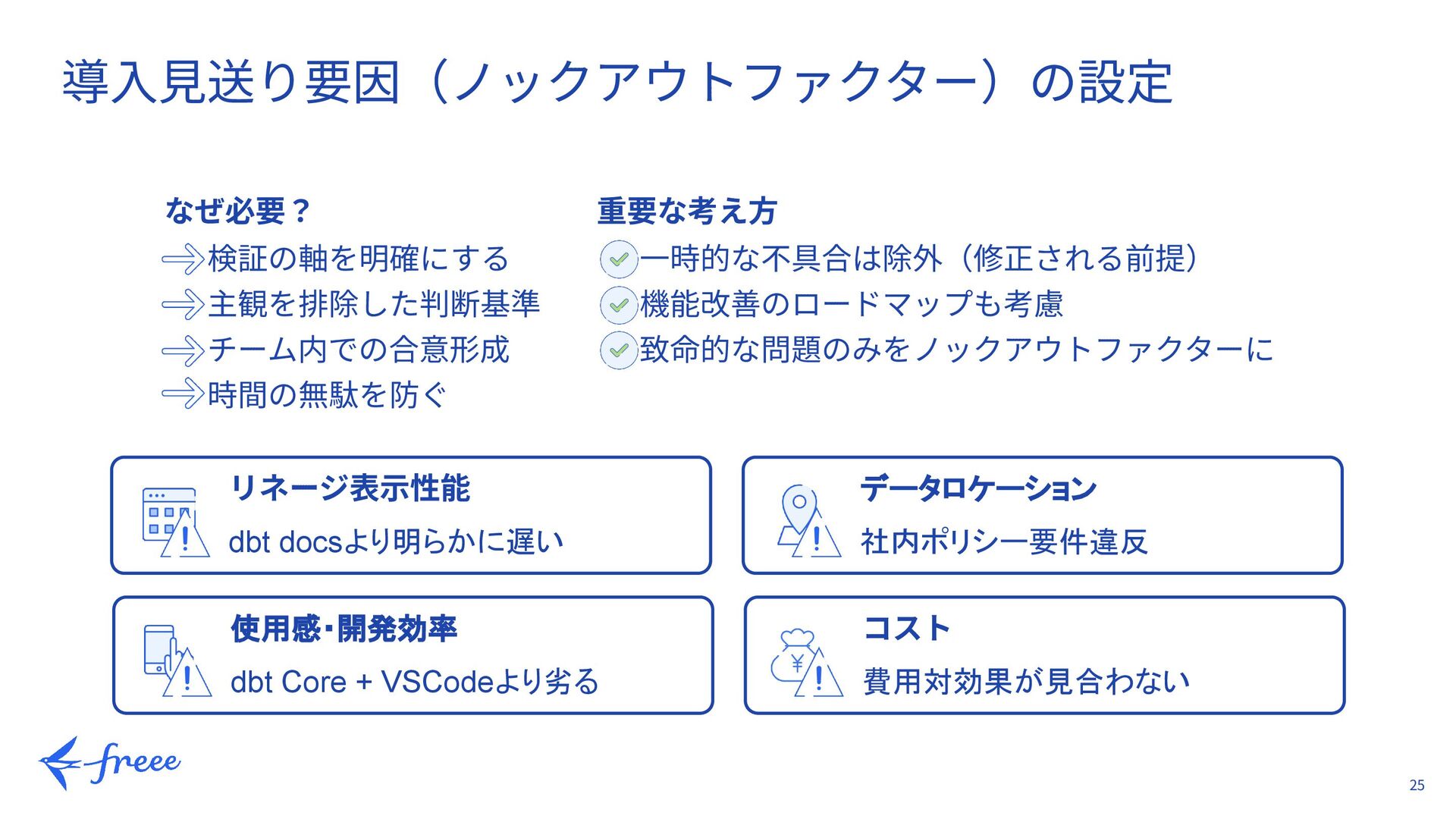 致命的な問題のみをノックアウトファクターに リネージ表⽰性能 dbt docsより明らかに遅い データロケーション 社内ポリシー要件違反 使用感・開発効率 dbt Core + VSCodeより劣る コスト 費用対効果が見合わない