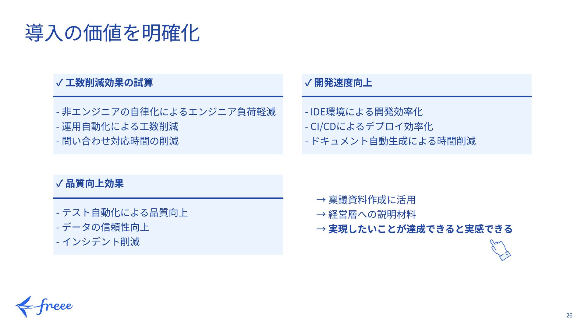 ✓ 開発速度向上 - IDE環境による開発効率化 - CI/CDによるデプロイ効率化 - ドキュメント⾃動⽣成による時間削減 → 稟議資料作成に活⽤ → 経営層への説明材料 → 実現したいことが達成できると実感できる ✓ 品質向上効果 - テスト⾃動化による品質向上 - データの信頼性向上 - インシデント削減