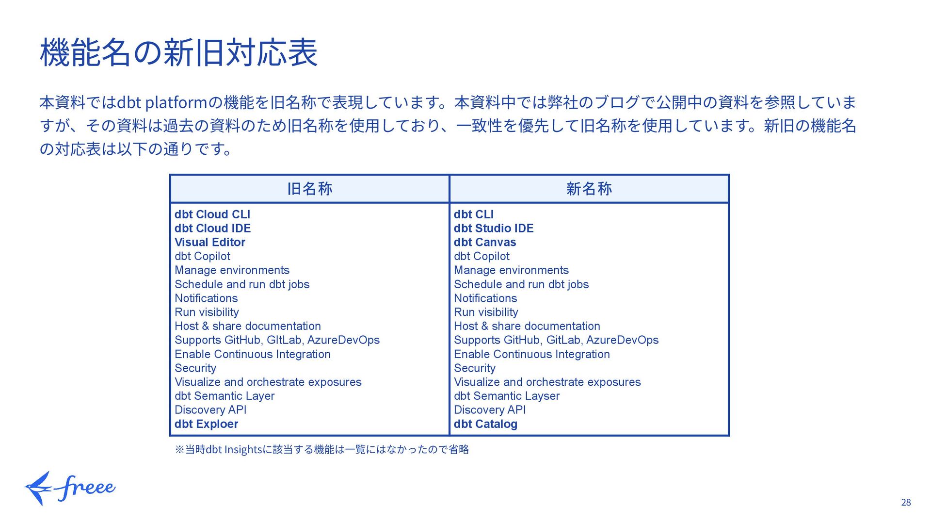 CLI dbt Cloud IDE Visual Editor dbt Copilot Manage environments Schedule and run dbt jobs Notifications Run visibility Host & share documentation Supports GitHub, GItLab, AzureDevOps Enable Continuous Integration Security Visualize and orchestrate exposures dbt Semantic Layer Discovery API dbt Exploer dbt CLI dbt Studio IDE dbt Canvas dbt Copilot Manage environments Schedule and run dbt jobs Notifications Run visibility Host & share documentation Supports GitHub, GitLab, AzureDevOps Enable Continuous Integration Security Visualize and orchestrate exposures dbt Semantic Layser Discovery API dbt Catalog ※当時dbt Insightsに該当する機能は⼀覧にはなかったので省略