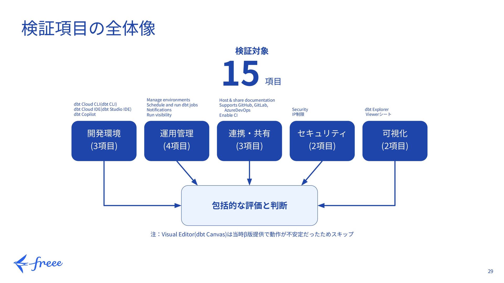 可視化 (2項⽬) dbt Cloud CLI(dbt CLI) dbt Cloud IDE(dbt Studio IDE) dbt Copilot Manage environments Schedule and run dbt jobs Notifications Run visibility Host & share documentation Supports GitHub, GitLab,  AzureDevOps Enable CI Security IP制限 dbt Explorer Viewerシート 包括的な評価と判断 注:Visual Editor(dbt Canvas)は当時β版提供で動作が不安定だったためスキップ 検証対象 15 項⽬