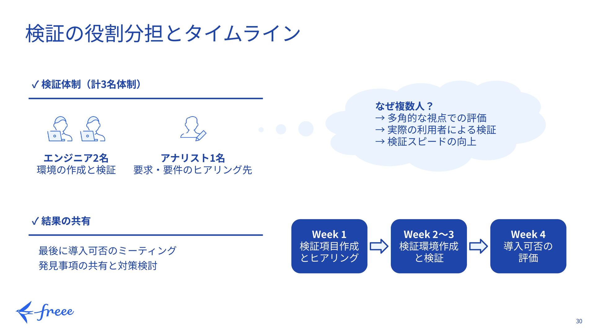 最後に導⼊可否のミーティング 発⾒事項の共有と対策検討 Week 1 検証項⽬作成 とヒアリング Week 2〜3 検証環境作成 と検証 Week 4 導⼊可否の 評価 なぜ複数⼈? → 多⾓的な視点での評価 → 実際の利⽤者による検証 → 検証スピードの向上