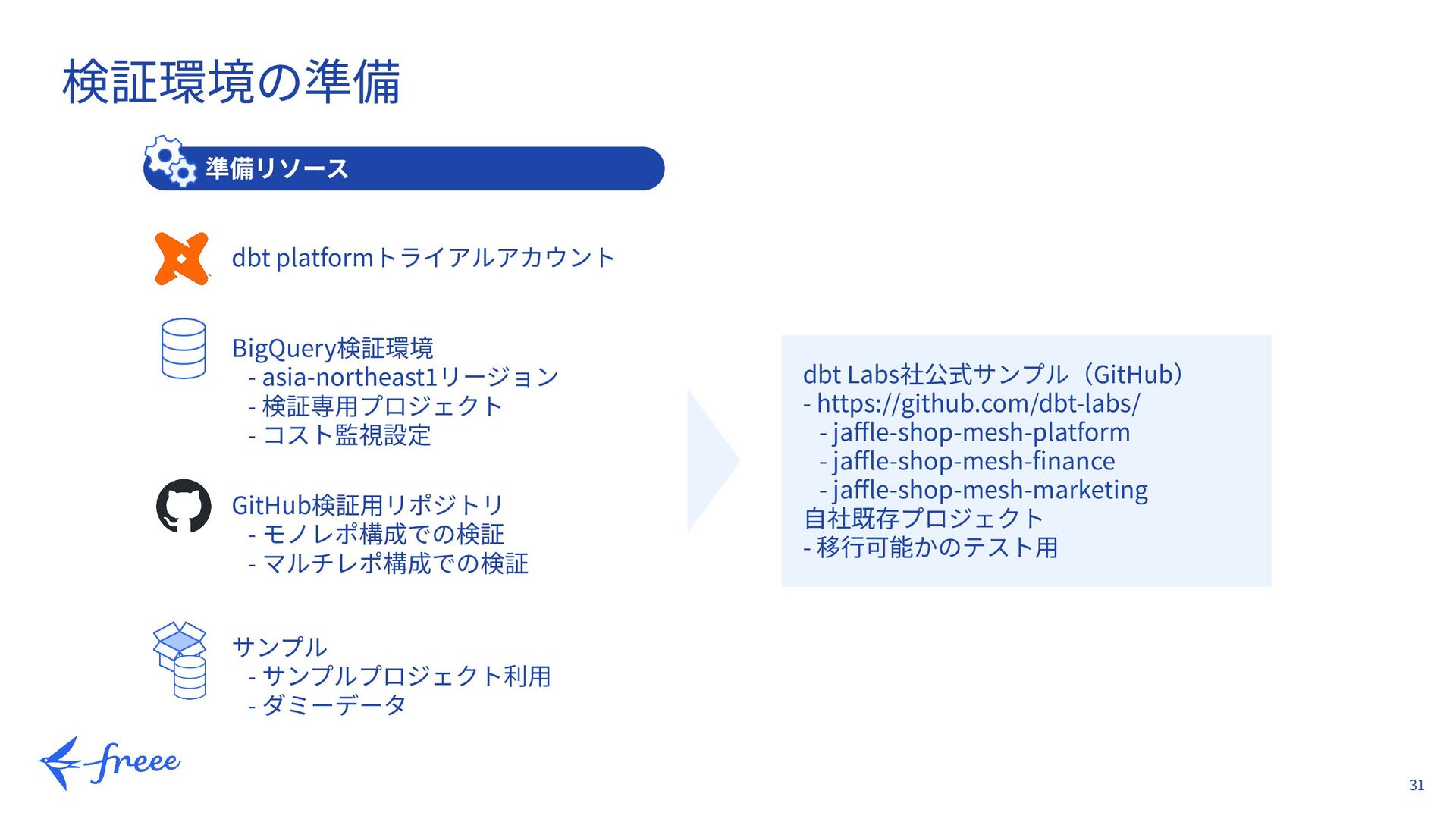 20. 31 検証環境の準備 準備リソース dbt platformトライアルアカウント BigQuery検証環境 - asia-northeast1リージョン - 検証専⽤プロジェクト