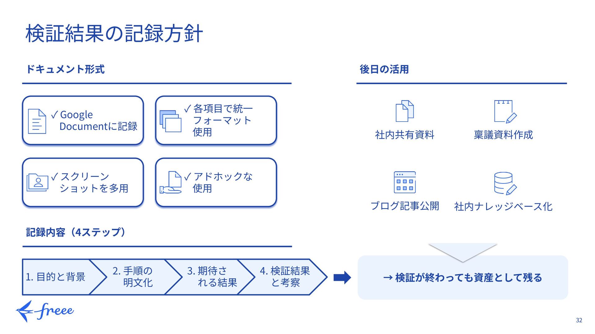 使⽤ ✓ スクリーン ショットを多⽤ ✓ アドホックな 使⽤ 記録内容(4ステップ) 1. ⽬的と背景 2. ⼿順の 明⽂化 3. 期待さ れる結果 4. 検証結果 と考察 → 検証が終わっても資産として残る ブログ記事公開 社内ナレッジベース化 稟議資料作成 社内共有資料