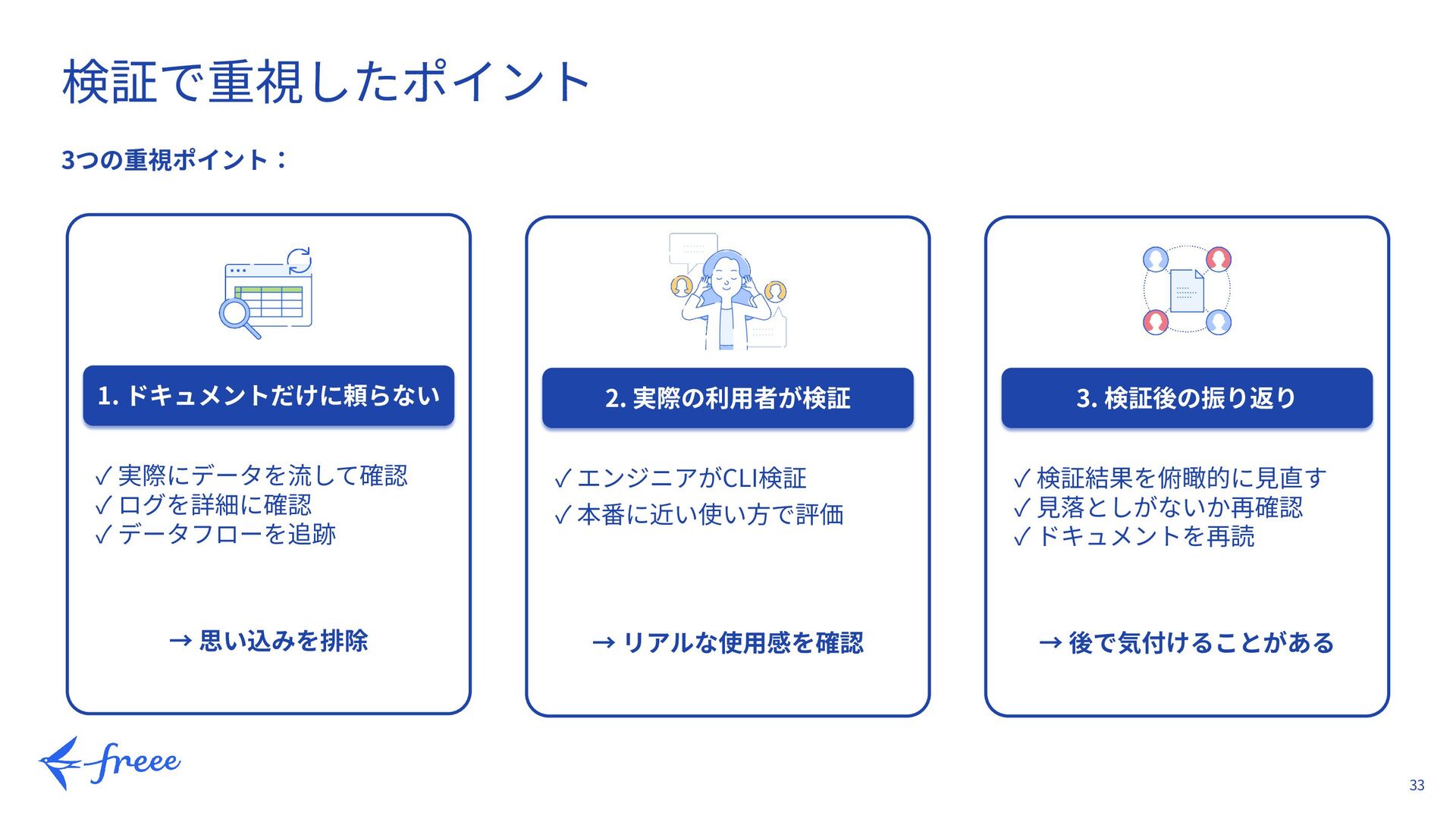 データフローを追跡 → 思い込みを排除 2. 実際の利⽤者が検証 ✓ エンジニアがCLI検証 ✓ 本番に近い使い⽅で評価 → リアルな使⽤感を確認 3. 検証後の振り返り ✓ 検証結果を俯瞰的に⾒直す ✓ ⾒落としがないか再確認 ✓ ドキュメントを再読 → 後で気付けることがある