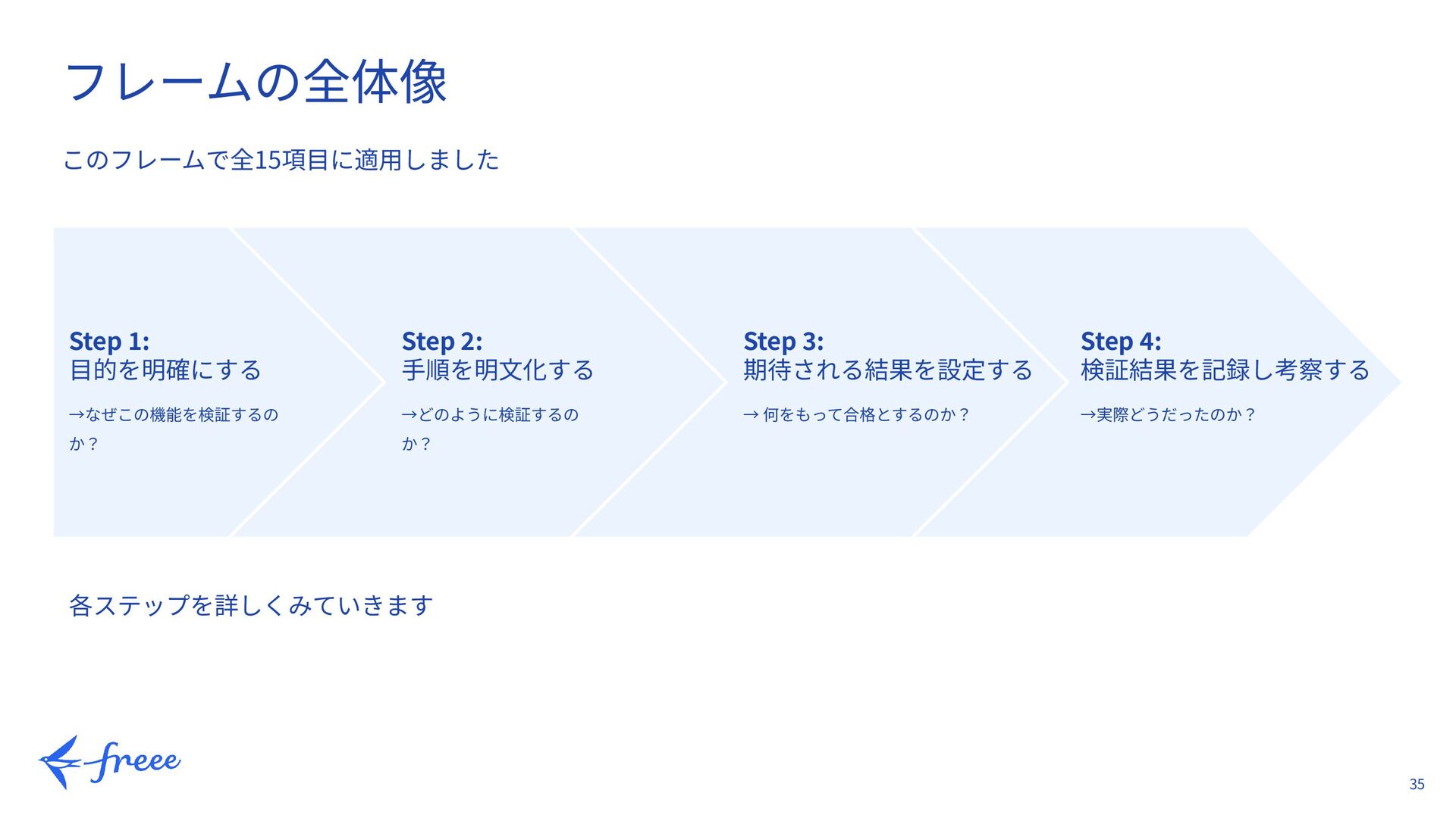 23. 35 このフレームで全15項⽬に適⽤しました フレームの全体像 Step 1: ⽬的を明確にする →なぜこの機能を検証するの か? Step 2: