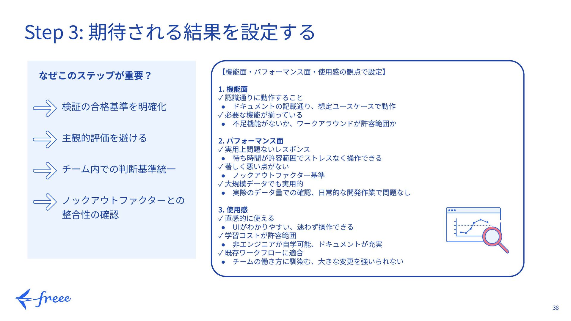 26. 38 Step 3: 期待される結果を設定する 【機能⾯‧パフォーマンス⾯‧使⽤感の観点で設定】 1. 機能⾯ ✓ 認識通りに動作すること •