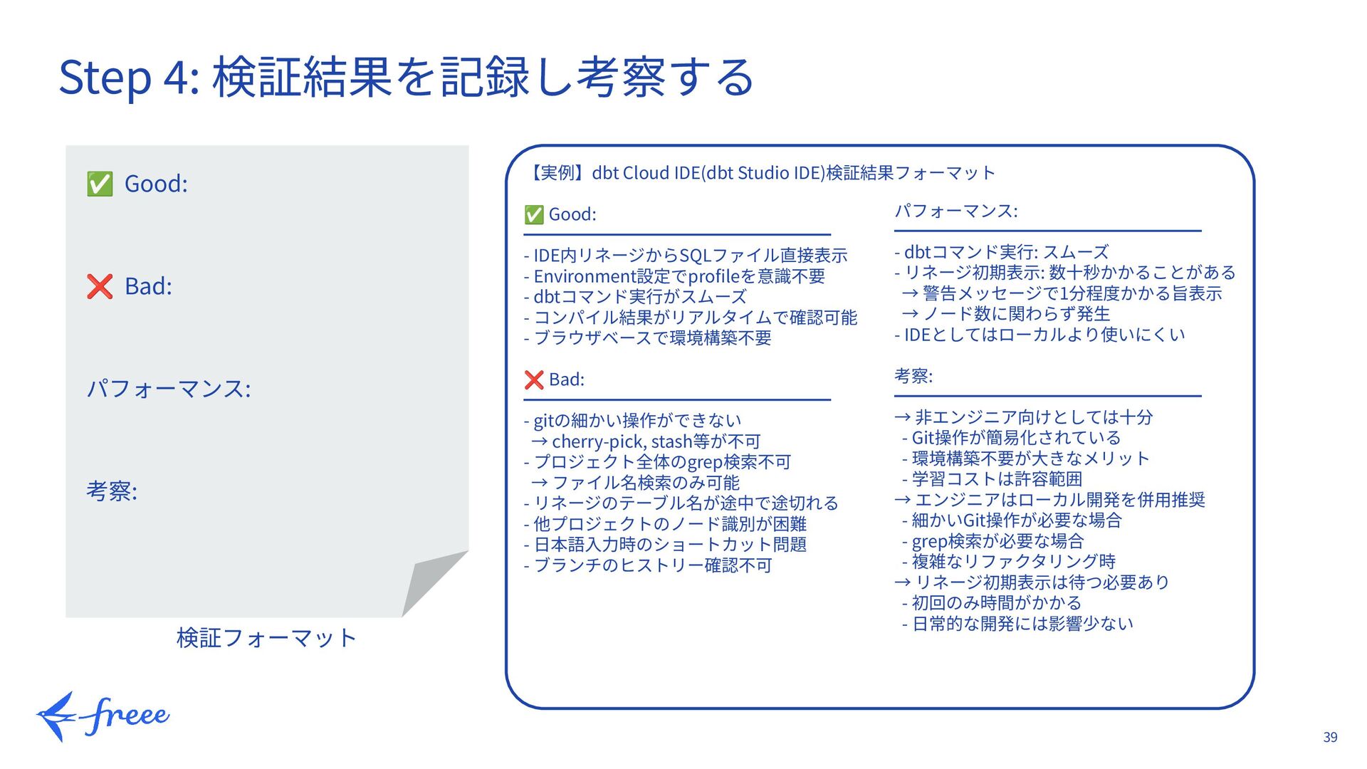 検証フォーマット 【実例】dbt Cloud IDE(dbt Studio IDE)検証結果フォーマット ✅ Good: ━━━━━━━━━━━━━━━━━━ - IDE内リネージからSQLファイル直接表⽰ - Environment設定でprofileを意識不要 - dbtコマンド実⾏がスムーズ - コンパイル結果がリアルタイムで確認可能 - ブラウザベースで環境構築不要 ❌ Bad: ━━━━━━━━━━━━━━━━━━ - gitの細かい操作ができない → cherry-pick, stash等が不可 - プロジェクト全体のgrep検索不可 → ファイル名検索のみ可能 - リネージのテーブル名が途中で途切れる - 他プロジェクトのノード識別が困難 - ⽇本語⼊⼒時のショートカット問題 - ブランチのヒストリー確認不可 パフォーマンス: ━━━━━━━━━━━━━━━━━━ - dbtコマンド実⾏: スムーズ - リネージ初期表⽰: 数⼗秒かかることがある → 警告メッセージで1分程度かかる旨表⽰ → ノード数に関わらず発⽣ - IDEとしてはローカルより使いにくい 考察: ━━━━━━━━━━━━━━━━━━ → ⾮エンジニア向けとしては⼗分 - Git操作が簡易化されている - 環境構築不要が⼤きなメリット - 学習コストは許容範囲 → エンジニアはローカル開発を併⽤推奨 - 細かいGit操作が必要な場合 - grep検索が必要な場合 - 複雑なリファクタリング時 → リネージ初期表⽰は待つ必要あり - 初回のみ時間がかかる - ⽇常的な開発には影響少ない