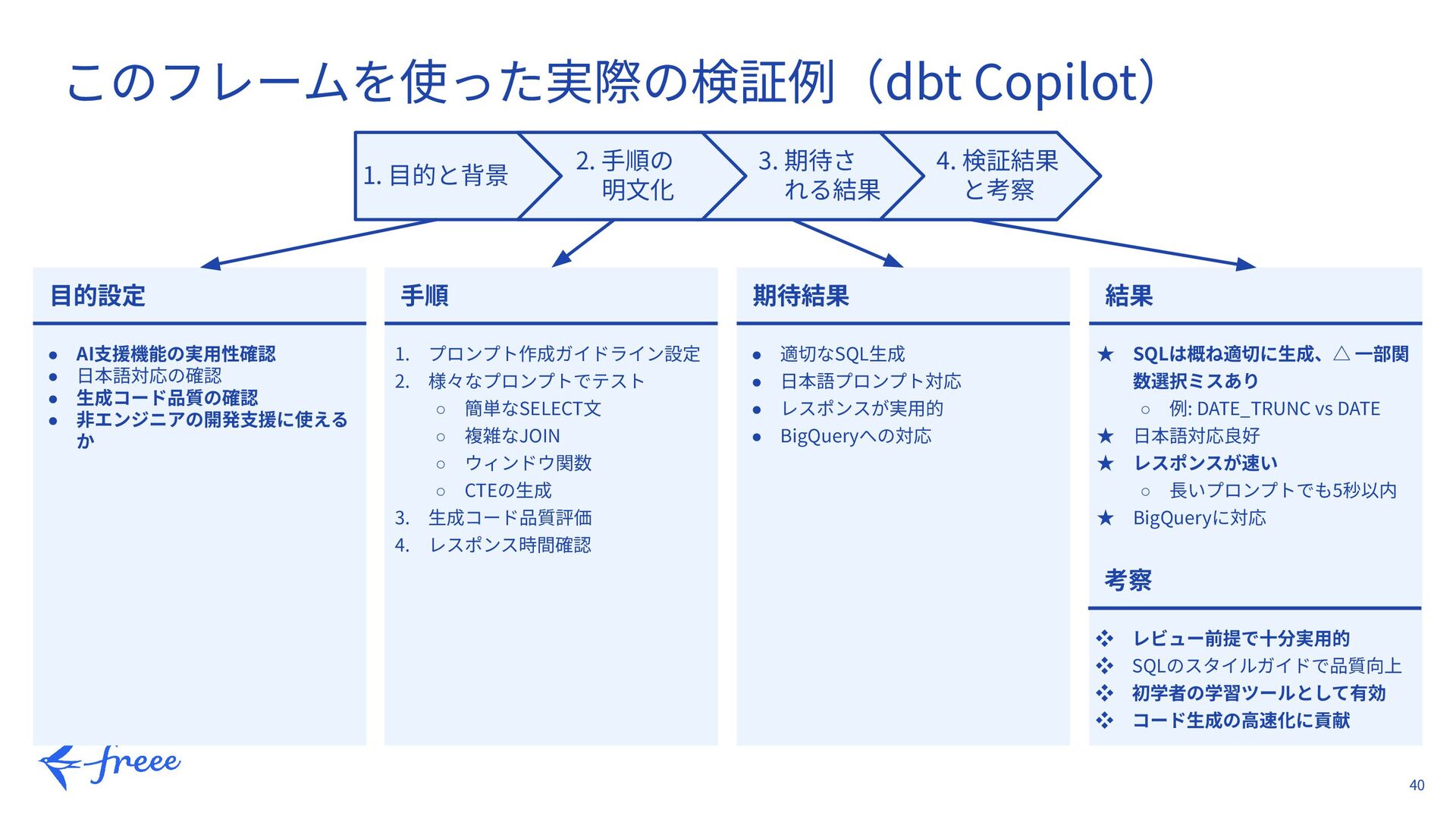 28. 40 このフレームを使った実際の検証例(dbt Copilot) 1. ⽬的と背景 2. ⼿順の 明⽂化 3. 期待さ